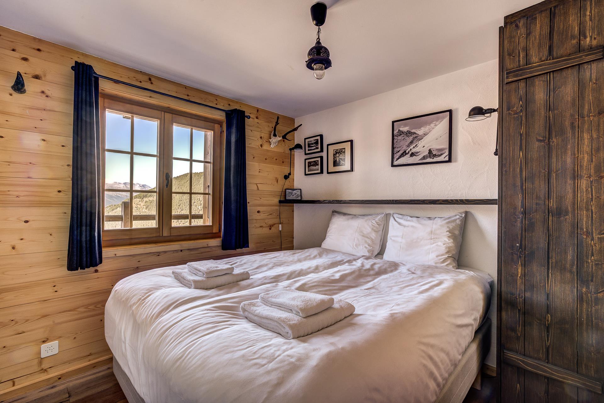 Schlafzimmer 2 = Im unteren Stockwerk, Doppelbett (160 x 200 cm), Kleiderschrank, Stuhl, Fenster mit Blick ins Tal