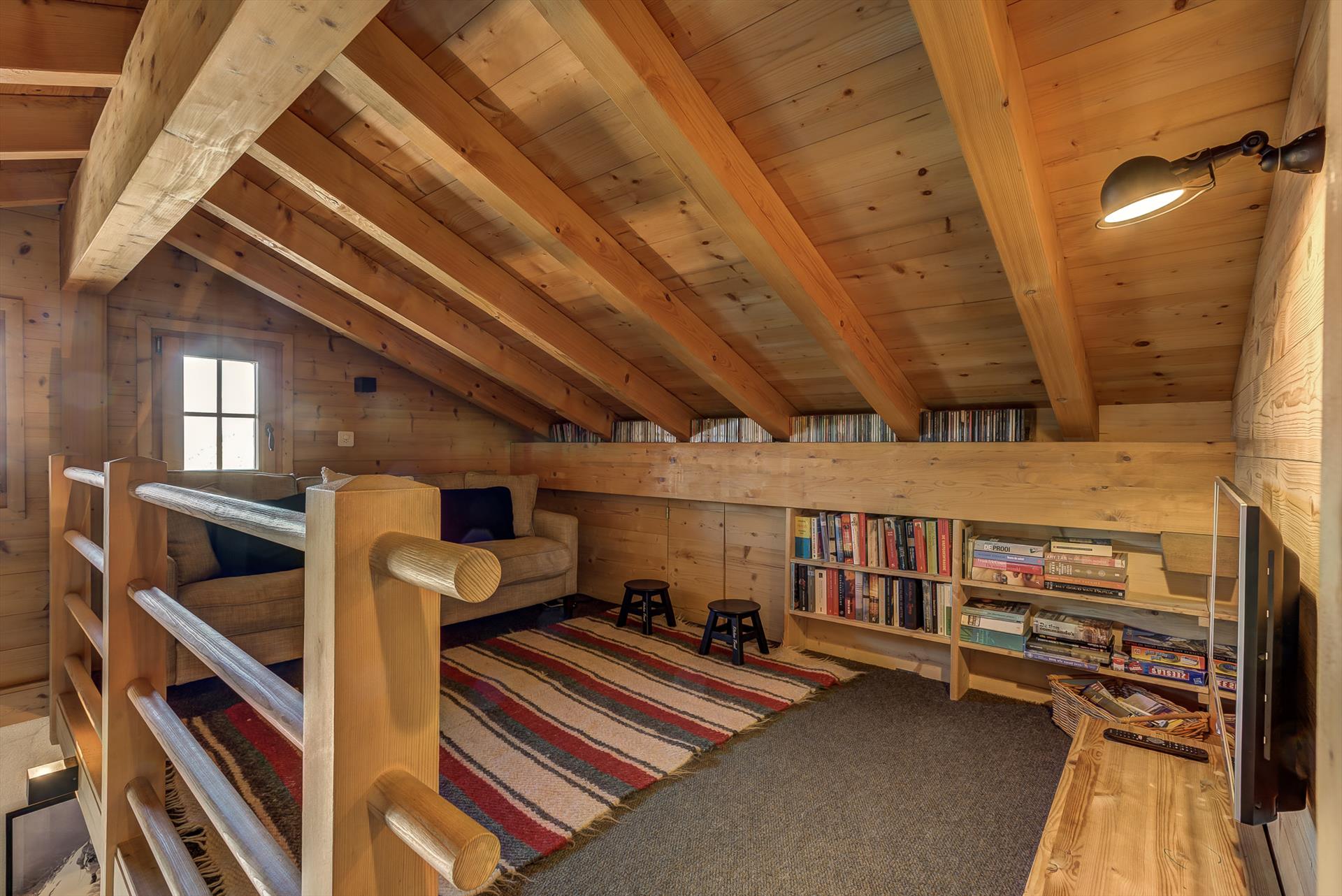 Mezzaninbereich = Über eine steile, offene Holzleiter vom Wohnzimmer aus zu erreichen, ist dieser offene Raum mit Blick auf den Essbereich mit TV und Sofa ausgestattet. Hier oben befindet sich auch ein kleines Schlafzimmer mit 2 Einzelbetten. Die Decke ist niedrig und es gibt keinen Kleiderschrank. Die Fenster blicken auf den Garten auf der Rückseite des Chalets. Bitte beachten Sie, dass der Mezzaninbereich und das Schlafzimmer im Mezzanin aufgrund der steilen Treppe nicht für Babys oder Kleinkinder geeignet sind.