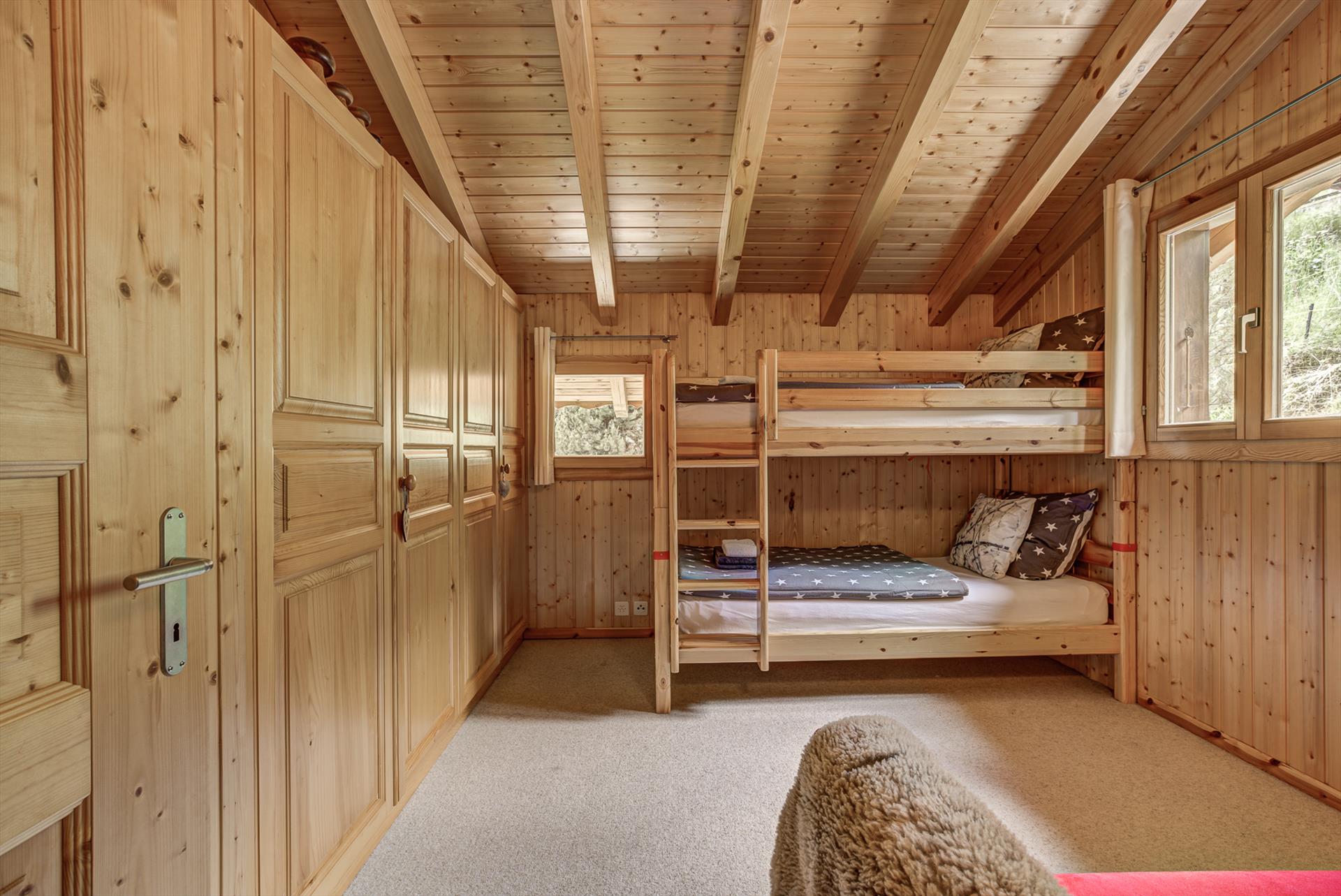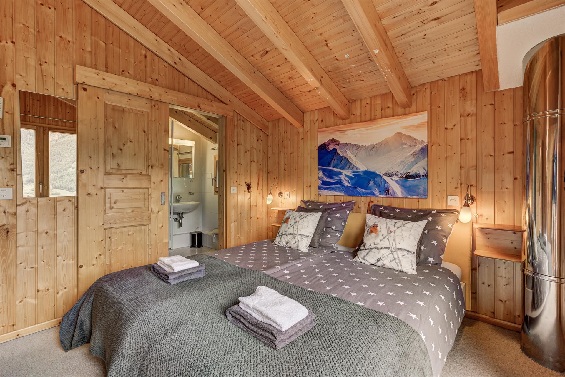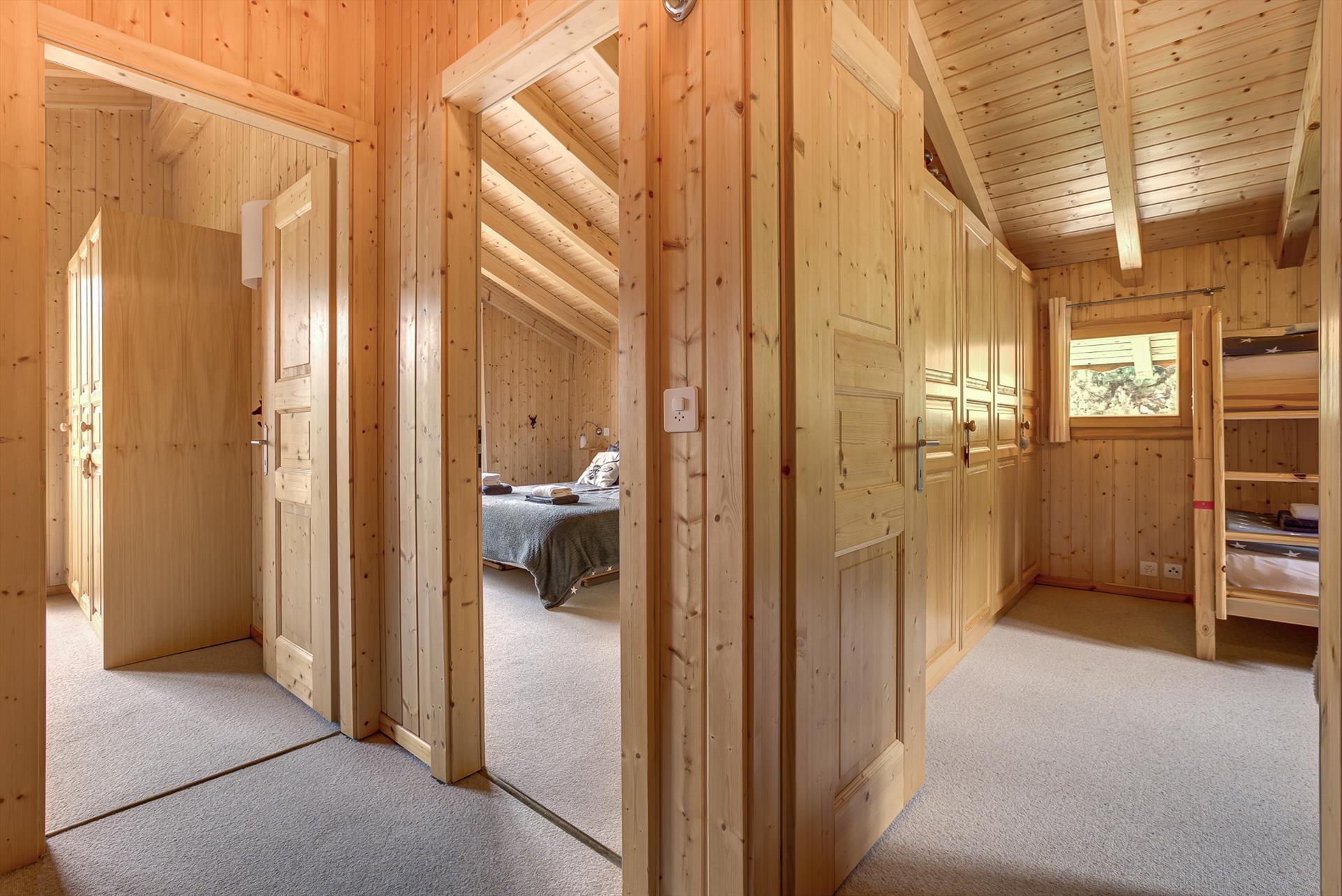 Dieses Chalet mit drei Schlafzimmern bietet Platz für 6 bis 8 Personen in drei Schlafzimmern und drei Badezimmern. Die drei Schlafzimmer befinden sich im Obergeschoss, davon zwei Doppelzimmer (eines mit eigenem Bad mit Dusche, Waschbecken und WC) und ein Etagenzimmer mit Schlafsofa. Auf dieser Ebene befindet sich auch ein Familienbad mit Badewanne (mit Handbrause), Waschbecken und WC.