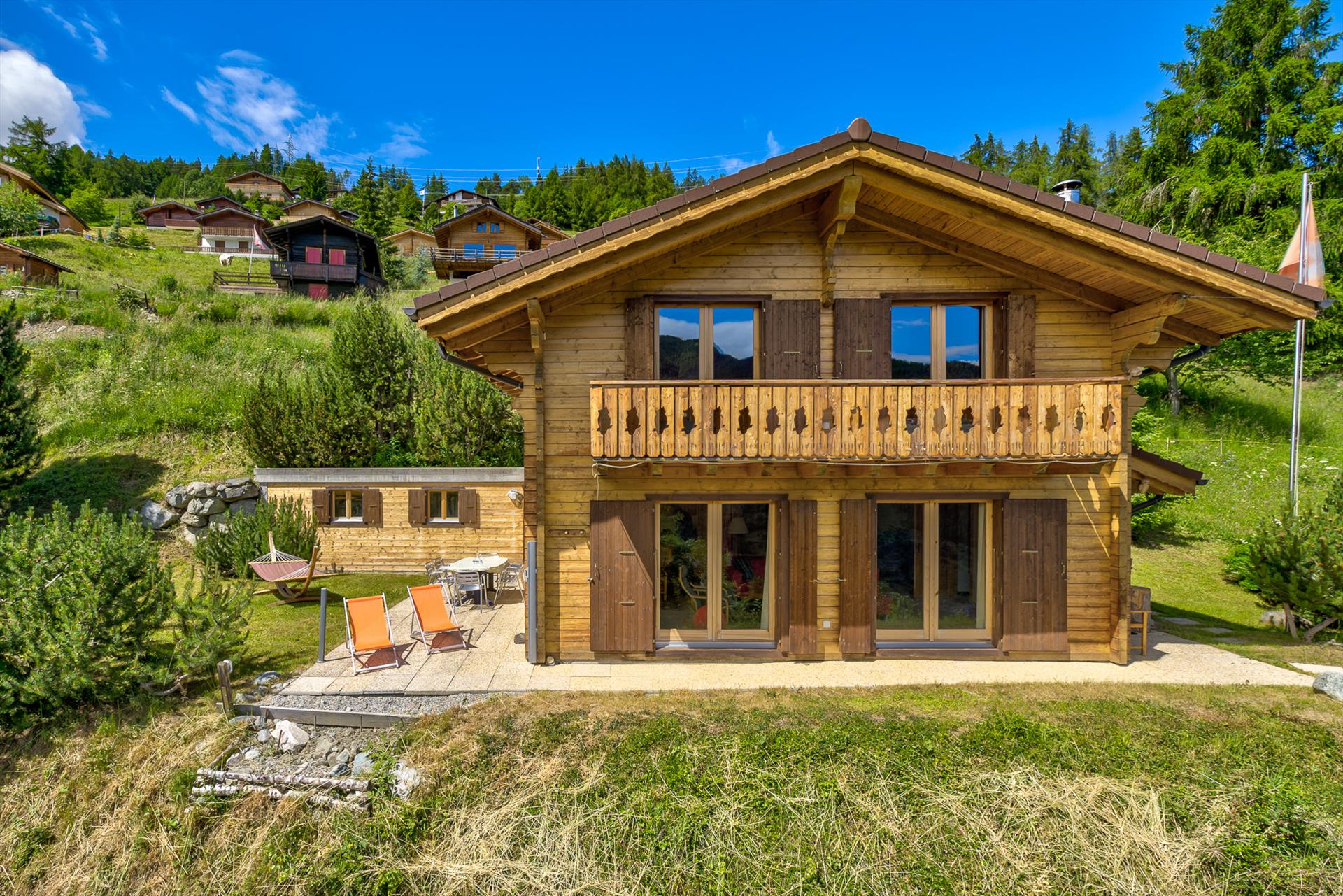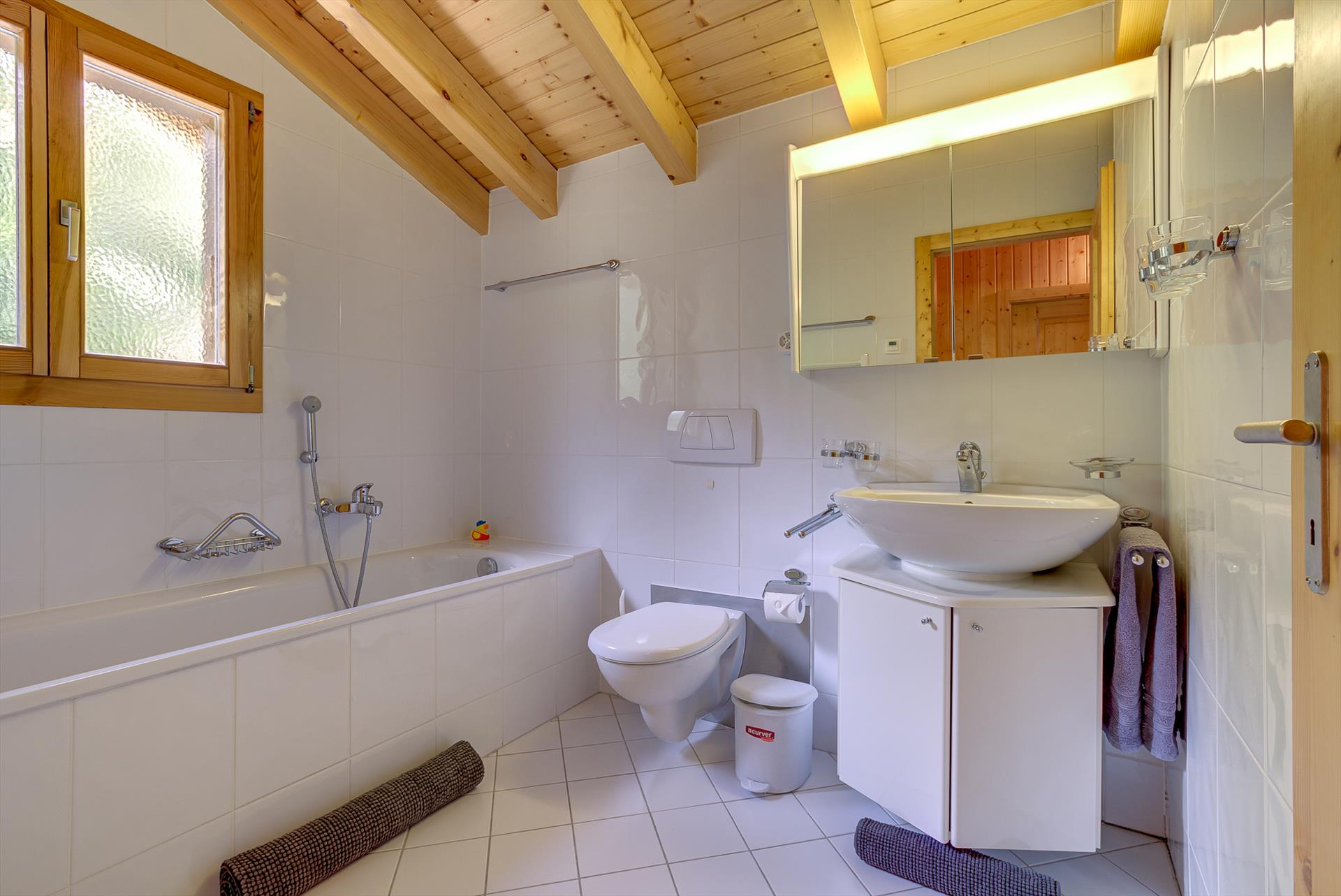 Die Ferienwohnung hat 3 Schlafzimmer und 3 Badezimmer, verteilt über 2 Etagen. Die Unterkunft bietet einen Garten mit Rasen und einen wunderschönen Blick auf das Tal und die Berge. Die Nähe von Einkaufsmöglichkeiten, Sportaktivitäten und Orten zum Ausgehen macht dies zu einer geeigneten Ferienwohnung um Ihre Ferien in Schweiz zu verbringen mit Familie und Freunden.