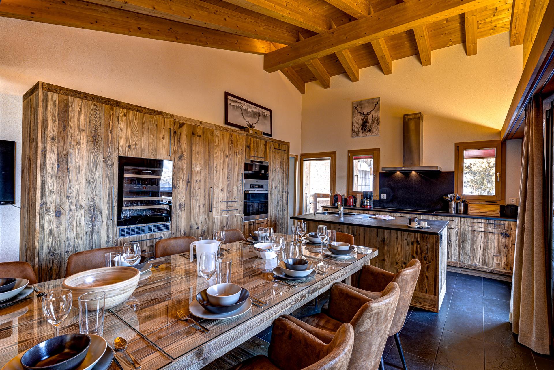 Das Hauptgeschoss dieses großen und gut ausgestatteten Chalets ist ein offener Küchen-/Wohn-/Essbereich, offen zu den Dachbalken und mit vielen Fenstern und Glastüren, von denen aus Sie die atemberaubende Aussicht bewundern können. Die Küche ist voll ausgestattet mit allem, was Sie für eine Gruppenverpflegung benötigen, darunter ein Geschirrspüler, eine elektrische Filterkaffeemaschine, eine Nespresso-Kaffeemaschine, eine Mikrowelle, ein Wasserkocher, ein Toaster, ein Kühlschrank mit Gefrierfach, ein Ofen, ein Dampfgarer und ein Kochfeld. Es gibt Fondue- und Raclette-Sets für einen traditionellen Schweizer Abend vor dem Holzfeuer. Eine separate Speisekammer enthält einen zusätzlichen großen Kühlschrank mit Gefrierfach und Eismaschine. Waschmaschine, Trockner, Bügeleisen und Gasgrill stehen Ihnen zur Verfügung.