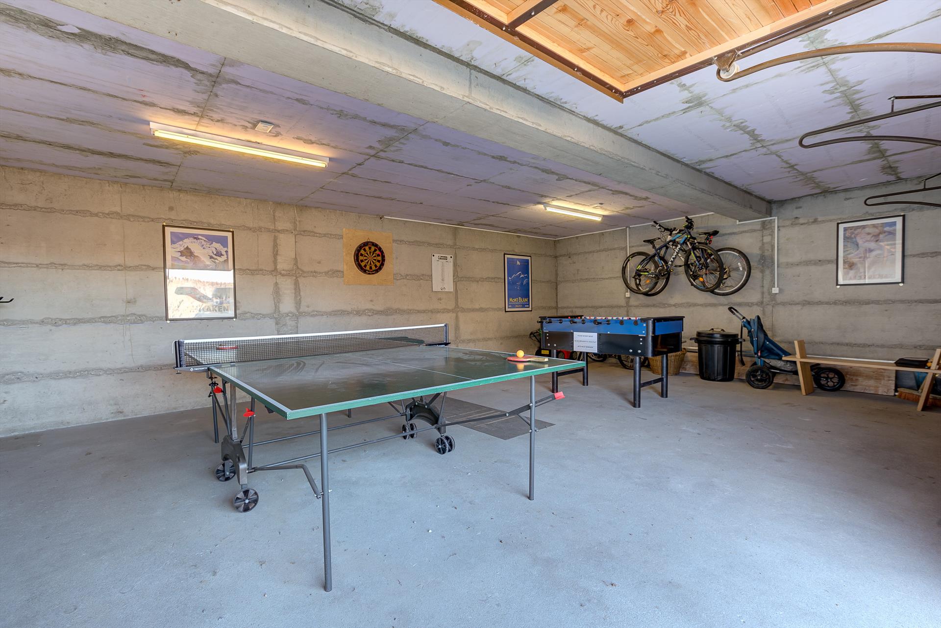 Das Hauptgeschoss dieses großen Chalets ist ein offener Küchen-/Wohn-/Essbereich mit holzbefeuertem Kamin und Fußbodenheizung. Der gemütliche Küchen- und Essbereich ist mit allem ausgestattet, was Sie für Ihren Urlaub benötigen, wie Geschirrspüler, Mikrowelle, Kühl- und Gefrierschrank, elektrische Filterkaffeemaschine, Nespresso-Kaffeemaschine, Backofen und Glaskeramikkochfeld. Es gibt Fondue- und Raclette-Sets für einen traditionellen Schweizer Abend vor dem Kaminfeuer. Waschmaschine, Haartrockner, Bügeleisen und ein Holzkohlegrill stehen Ihnen zur Verfügung. Die geräumige Garage ist mit Skiaufbewahrung und Skischuhtrockner ausgestattet und dient gleichzeitig als Spielzimmer mit Tischtennisplatte, Dartscheibe und Tischfußball.