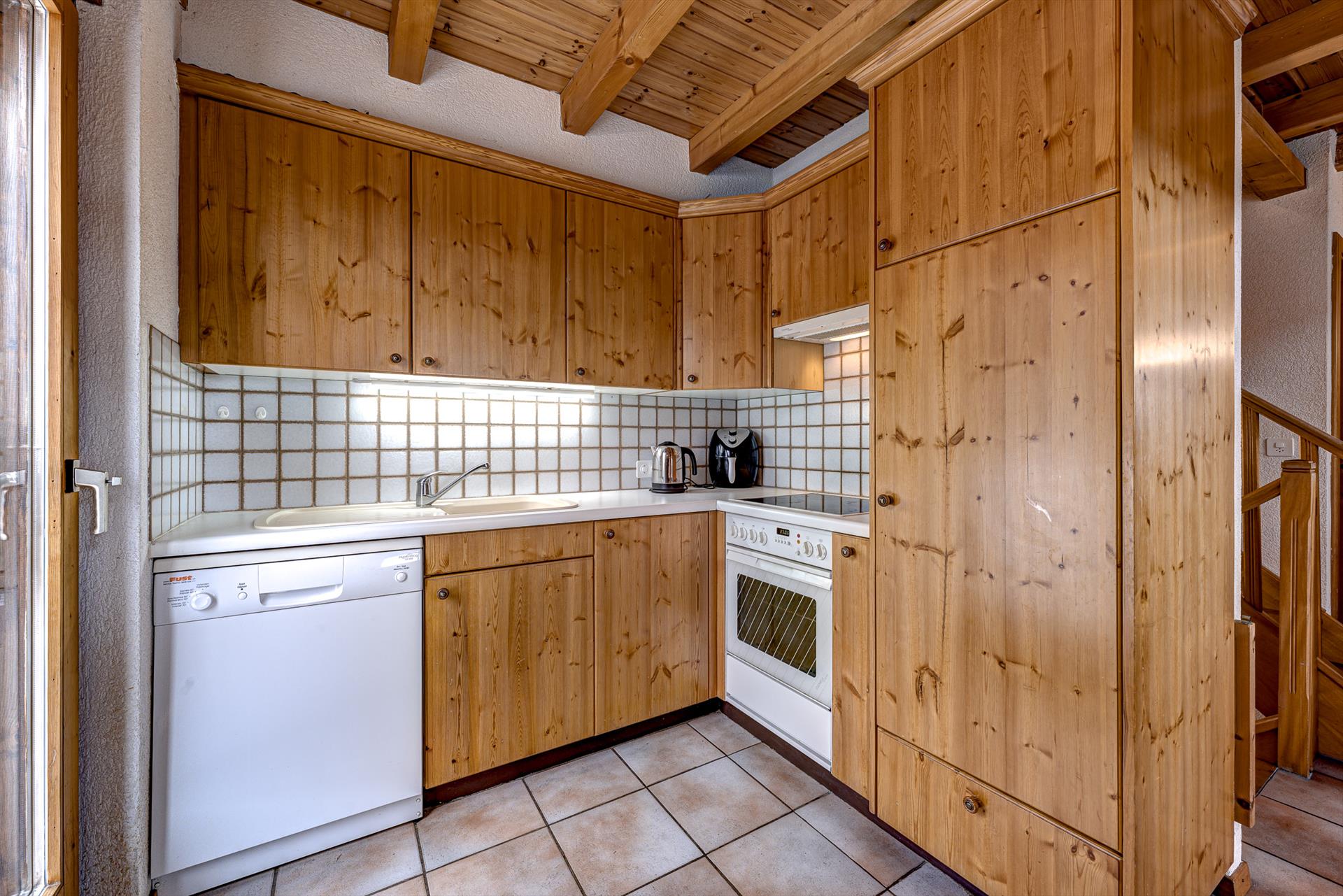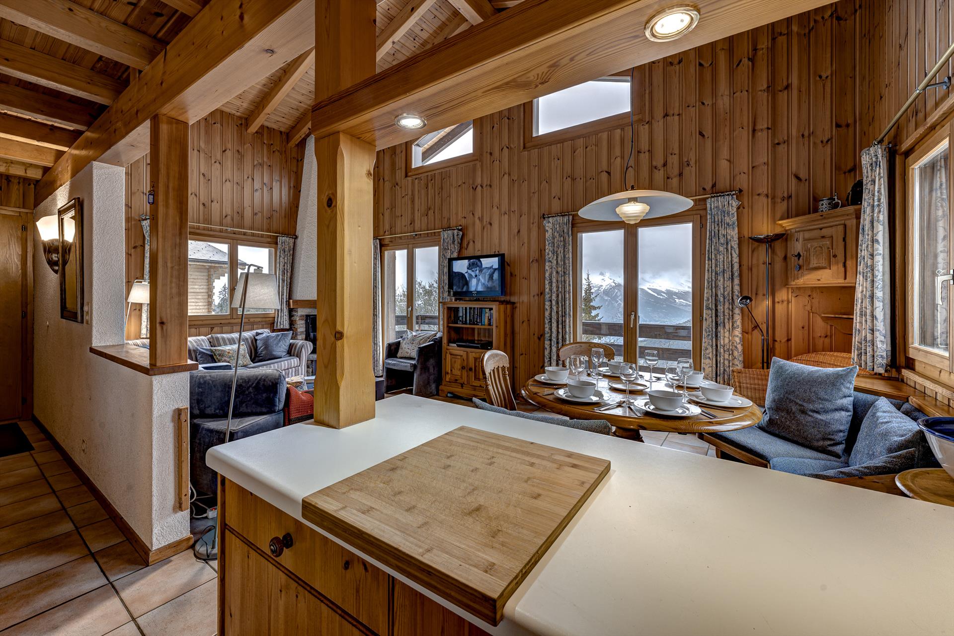 Das Hauptgeschoss des Chalets besteht aus einem offenen Küchen-/Wohn-/Essbereich. Die Küche ist komplett ausgestattet mit allem, was man für die Ferienverpflegung braucht, wie Kühl-Gefrierschrank, Geschirrspüler, Mikrowelle, Toaster, Wasserkocher, elektrische Filterkaffeemaschine und sogar eine Nespresso-Kaffeemaschine. Es gibt Fondue- und Raclette-Sets für einen traditionellen Schweizer Abend vor dem Holzfeuer. Waschmaschine (mit integriertem Trockner), Haartrockner, Bügeleisen und ein tragbarer Außengrill stehen Ihnen zur Verfügung.