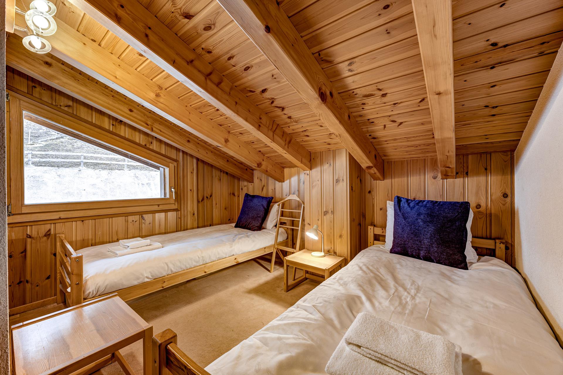 Das Chalet ist auf drei Ebenen mit einer zentralen Treppe aufgeteilt. Zwei der Schlafzimmer befinden sich im Erdgeschoss (jeweils mit Doppelbett, Kleiderschrank, Beistelltisch mit Lampe und herrlichem Blick durch die Glastüren, die zum Gartenbereich führen). Wenn Sie den Wohnbereich durchqueren und die hölzerne Wendeltreppe ins Obergeschoss hinaufgehen, gelangen Sie in einen TV-Bereich, der zu den Dachbalken hin offen ist. Hier finden Sie einen Fernseher mit X-Box, einige Regale zur Aufbewahrung von Kleidung und ein Schlafsofa, das sich zu einem Doppelbett ausklappen lässt. Bitte beachten Sie, dass der Bereich mit dem Schlafsofa kein Fenster hat und zum Treppenhaus hin offen ist. Von diesem Bereich aus führt eine Tür zum letzten Schlafzimmer (mit zwei Einzelbetten, offen zu den Dachbalken und mit einem Fenster, das auf die Straße hinausgeht). Bitte beachten Sie, dass dieses Schlafzimmer keinen Kleiderschrank hat und Bereiche mit niedriger Deckenhöhe aufweist.