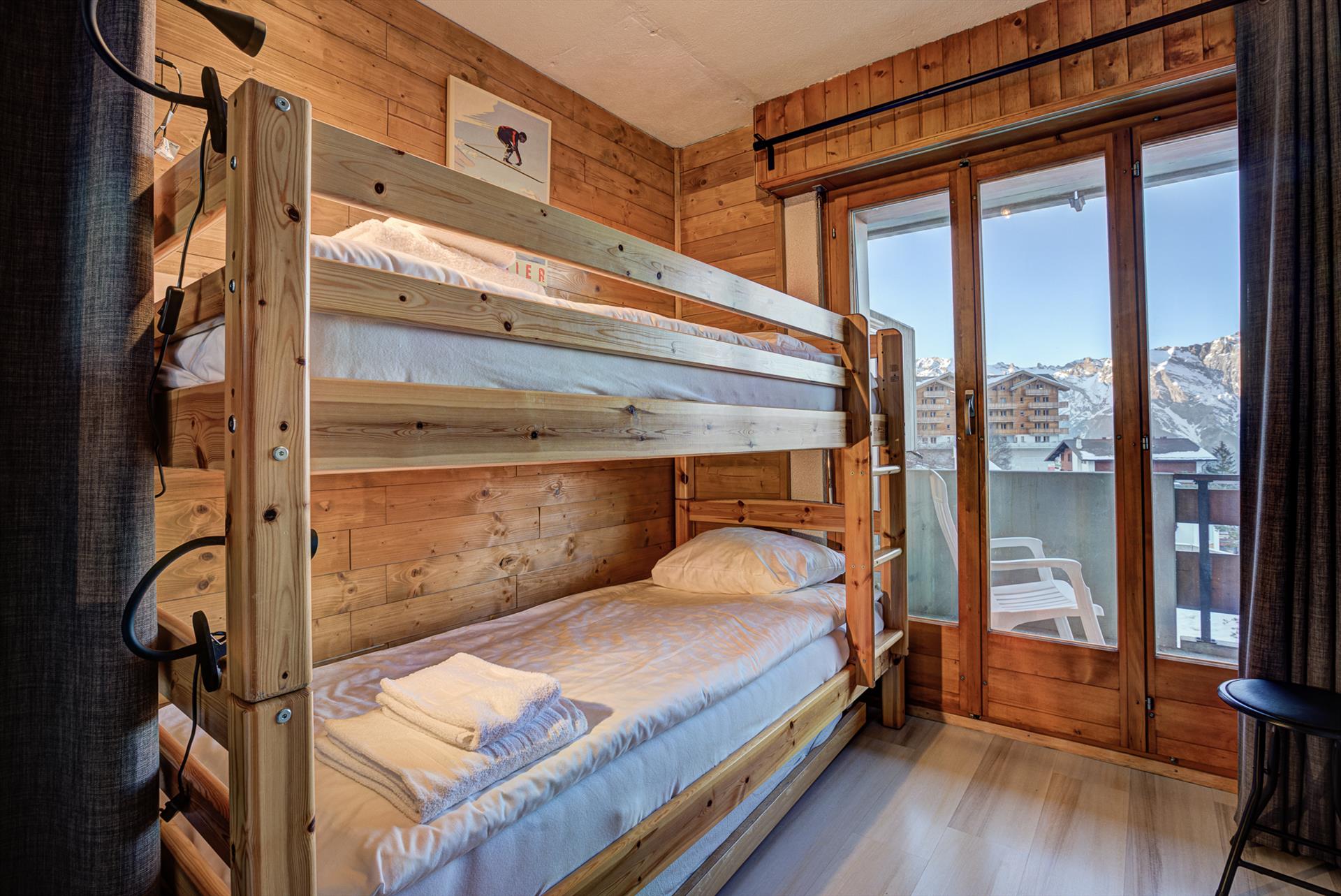 Die Wohnung bietet Platz für bis zu 5 Personen in zwei Schlafzimmern. Das erste Schlafzimmer hat ein Doppelbett und das zweite Schlafzimmer hat ein Etagenbett für zwei Personen und ein weiteres ausziehbares Bett für eine dritte Person. Dieses Zimmer hat direkten Zugang zum Balkon mit atemberaubender Aussicht, während das Doppelschlafzimmer direkten Zugang zu einem privaten Südbalkon auf der Rückseite hat. Das Badezimmer verfügt über ein Waschbecken, eine Badewanne mit Kopfbrause, einen Haartrockner und ein WC. La Tzoumaz Appartement Bellevue 207 ist mit einem Hochstuhl und einem faltbaren Reisebett (ohne Bettzeug) ausgestattet, die für Kinder unter 2 Jahren geeignet sind, und ein zweites ist auf Anfrage bei der Ankunft verfügbar. Bitte beachten Sie, dass gemäß den Sicherheitshinweisen des Herstellers keine zusätzlichen Matratzen zu den Kinderbetten mitgeliefert werden.