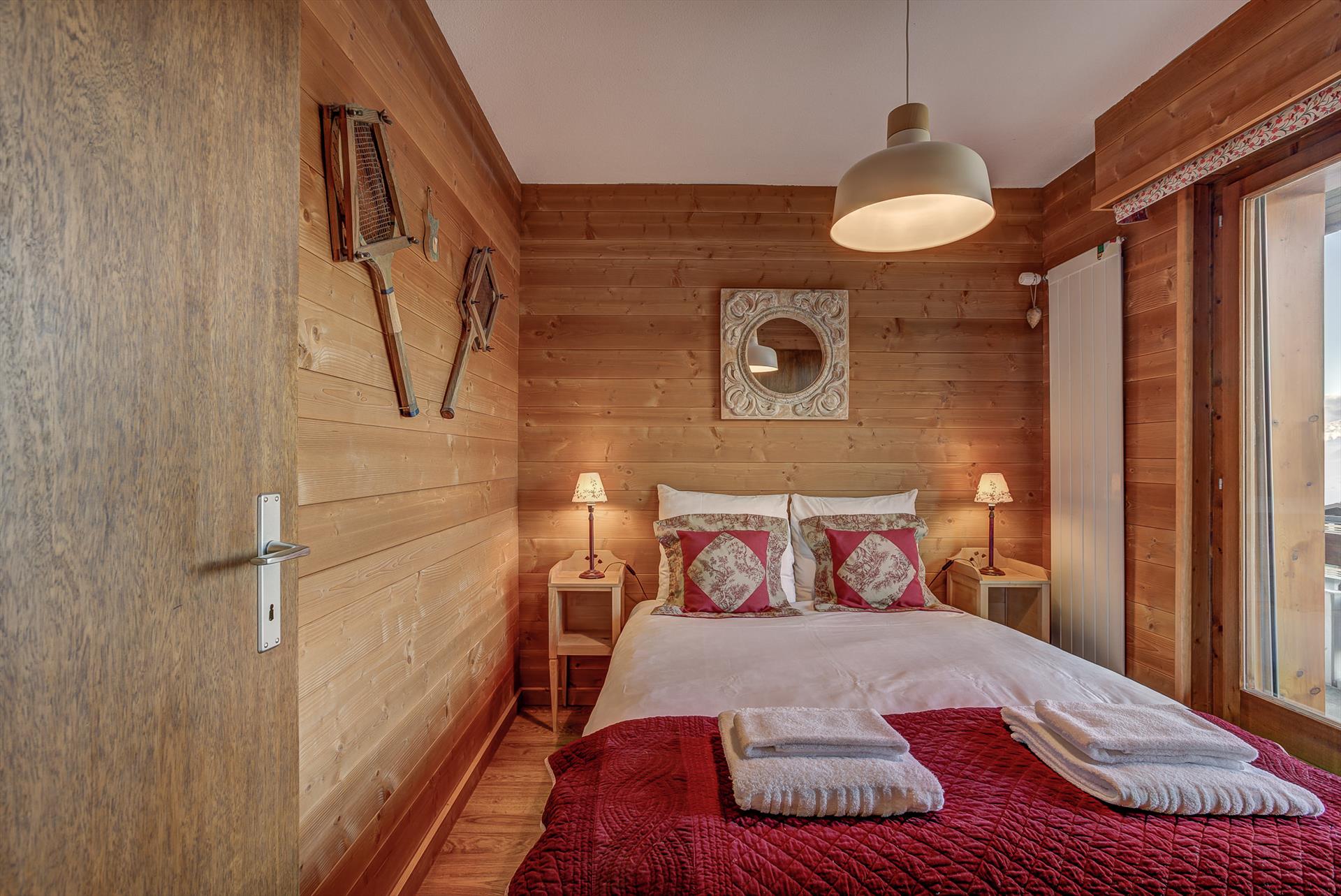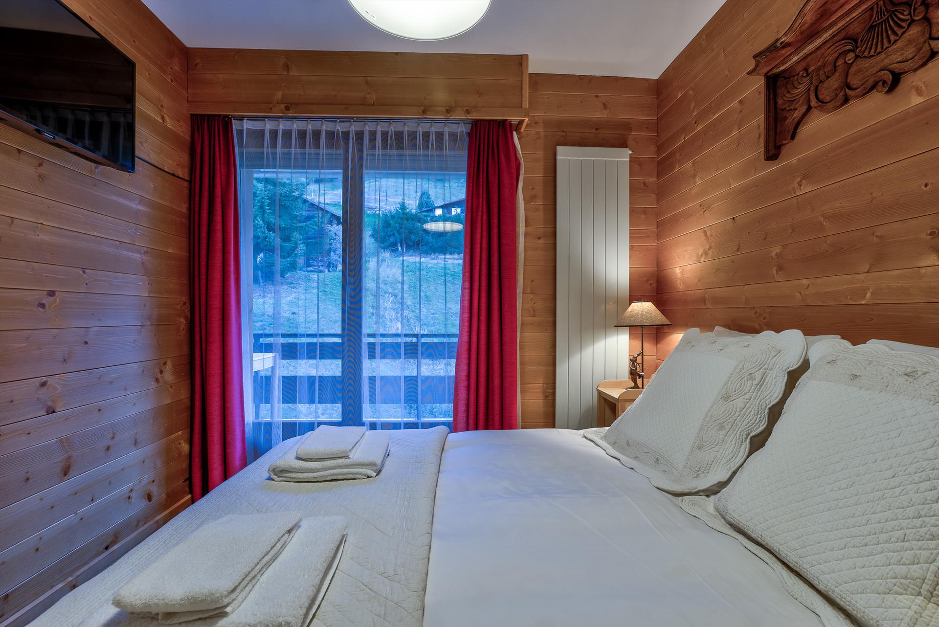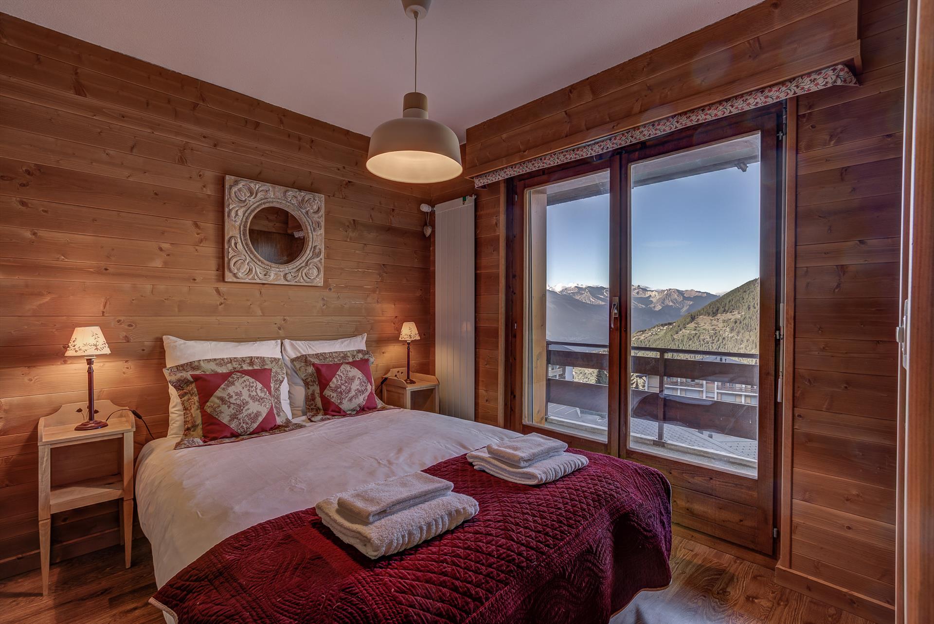 - Das zweite Schlafzimmer ist mit einem Doppelbett, einem an der Wand montierten Flachbildfernseher und einem Schrank ausgestattet und hat Terrassentüren, die auf den Balkon führen, von dem aus man auf die Skipisten blickt.