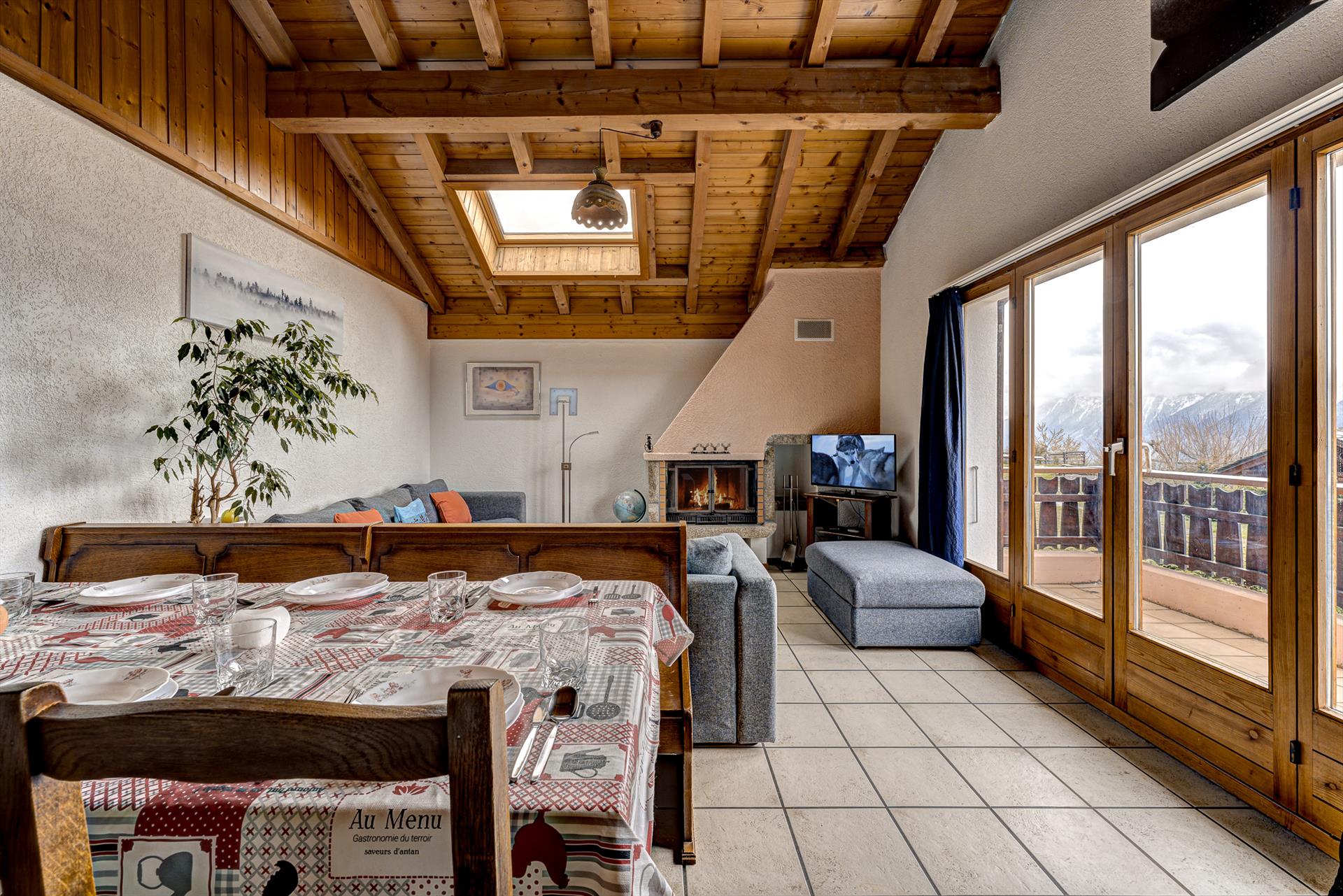 Wenn Sie nach einem langen Tag auf der Piste nach Hause kommen, ist es ein wahres Vergnügen, sich im Wohnzimmer zu entspannen und aufgeregt über Ihre Heldentaten vom Tag in den Bergen zu plaudern. Es ist schwer, sich nicht zu entspannen, wenn man sich in dieser wunderschönen Waldumgebung befindet, mit einer unglaublichen Berglandschaft um sich herum. Im Sommer sind die Sitz- und Essbereiche im Freien ein fabelhafter Ort, um mittags zu grillen und dabei dem Gesang der Vögel zu lauschen.