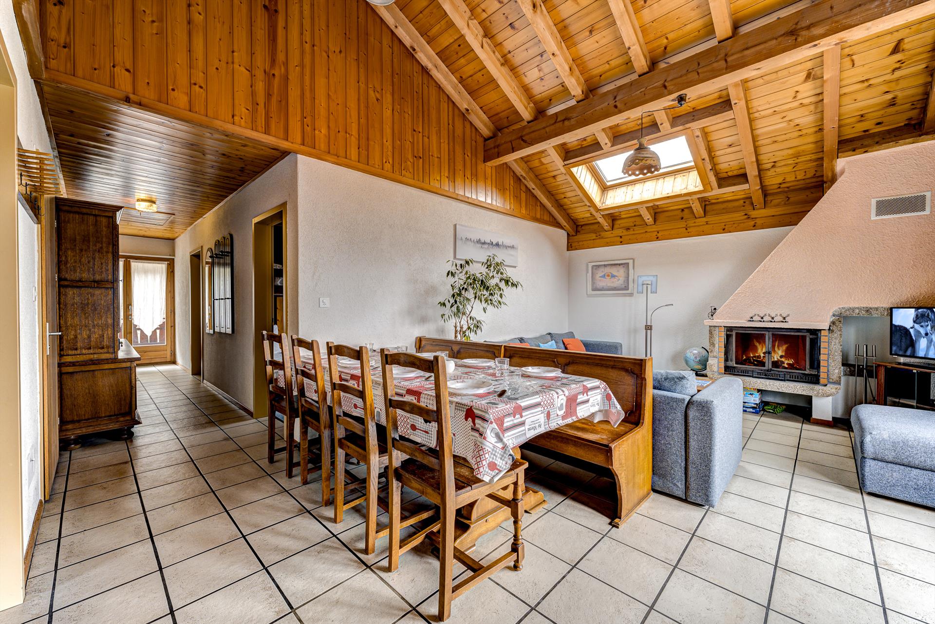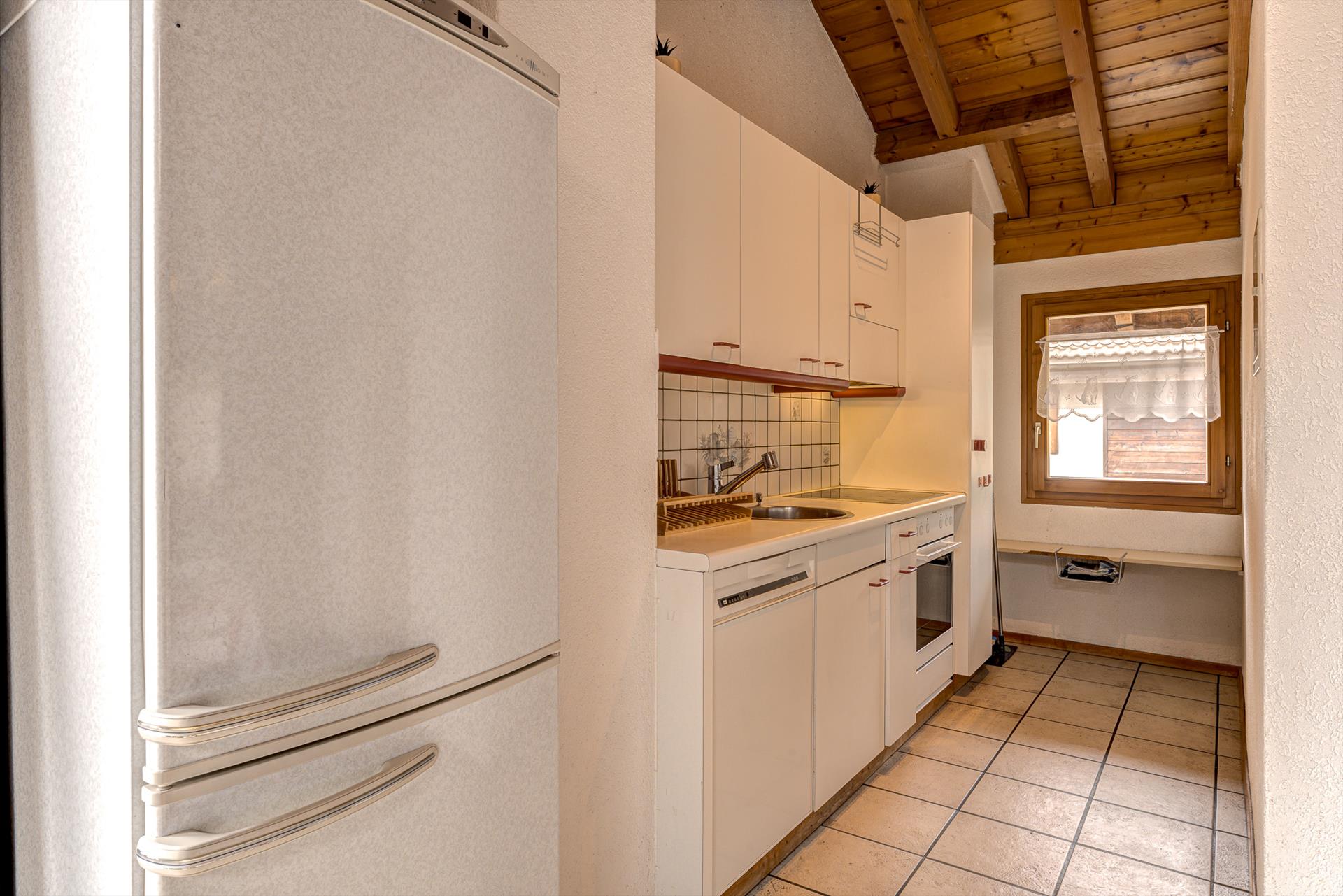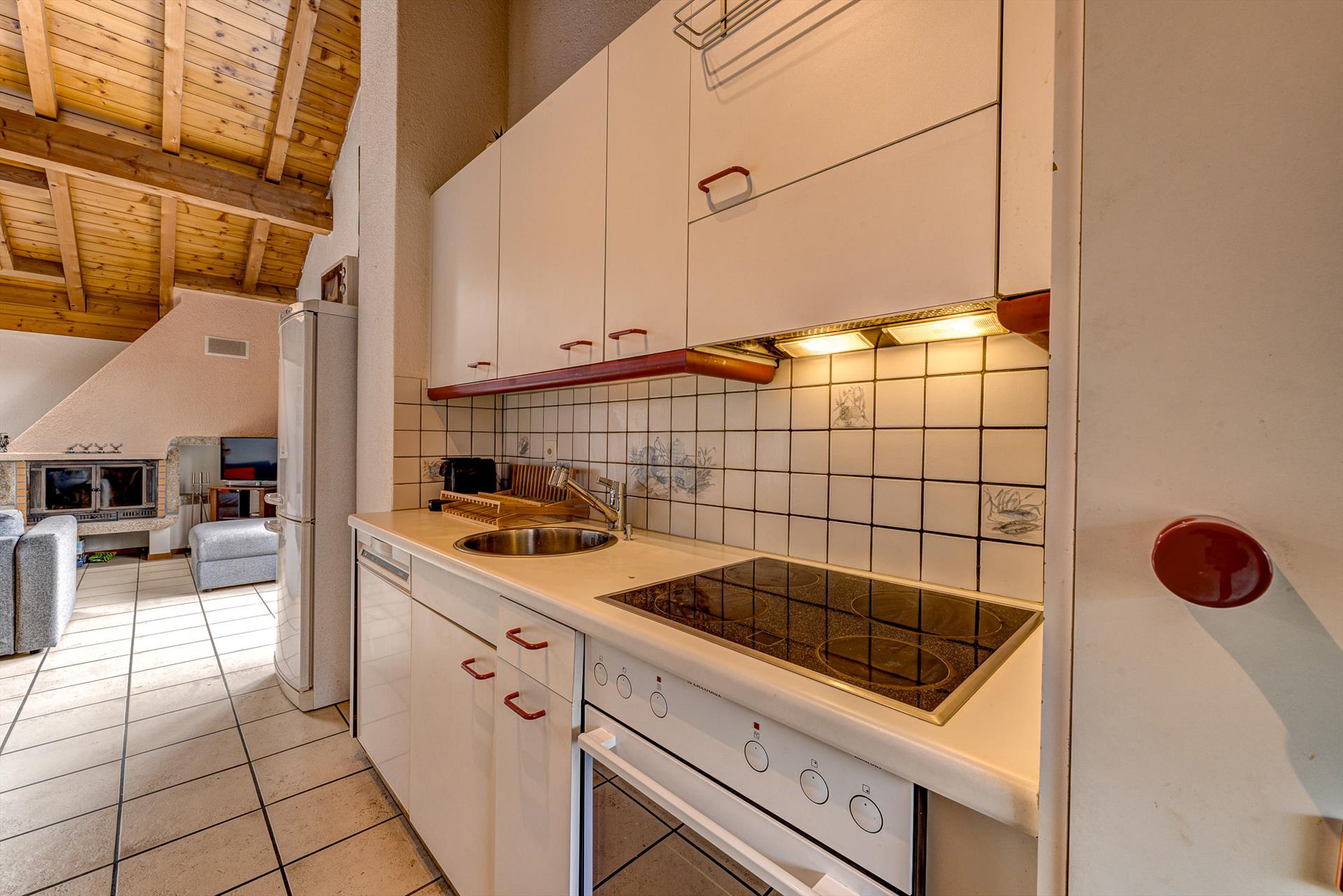 Der Hauptbereich dieser luftigen Wohnung ist ein offener Küchen-/Wohn-/Essbereich mit Kamin und doppelter Deckenhöhe, der zu den Dachbalken hin offen ist. Die Küche ist voll ausgestattet mit allem, was man für die Familienverpflegung braucht: Kühl-Gefrierschrank, Geschirrspüler, Mikrowelle, Wasserkocher, elektrische Filterkaffeemaschine, Nespresso, Backofen und Kochfeld. Es gibt Fondue- und Raclette-Sets für einen traditionellen Schweizer Abend vor dem Holzfeuer. Haartrockner, Bügeleisen stehen Ihnen zur Verfügung. Es gibt Waschmaschine und Trockner im Haus.