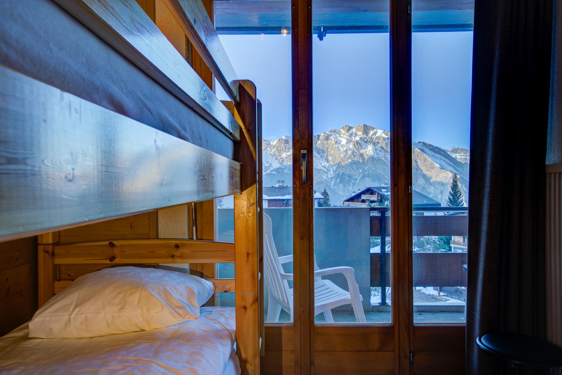The apartment sleeps up to 5 people in two bedrooms. The first has a double bed and the second bedroom has bunk beds for two people and a further pull-out bed for a third person. This room has direct access to the balcony with stunning views, while the double bedroom has direct access to a private south-facing balcony to the rear. The bathroom has a sink, bath with overhead shower, hairdryer, and WC. La Tzoumaz Apartment Bellevue 207 is equipped with a high chair and a folding travel cot (bedding not provided) suitable for children under 2 years old, and a second is available on demand on arrival. Please note that in accordance with the manufacturer's safety instructions, additional mattresses are not provided with the cots.
