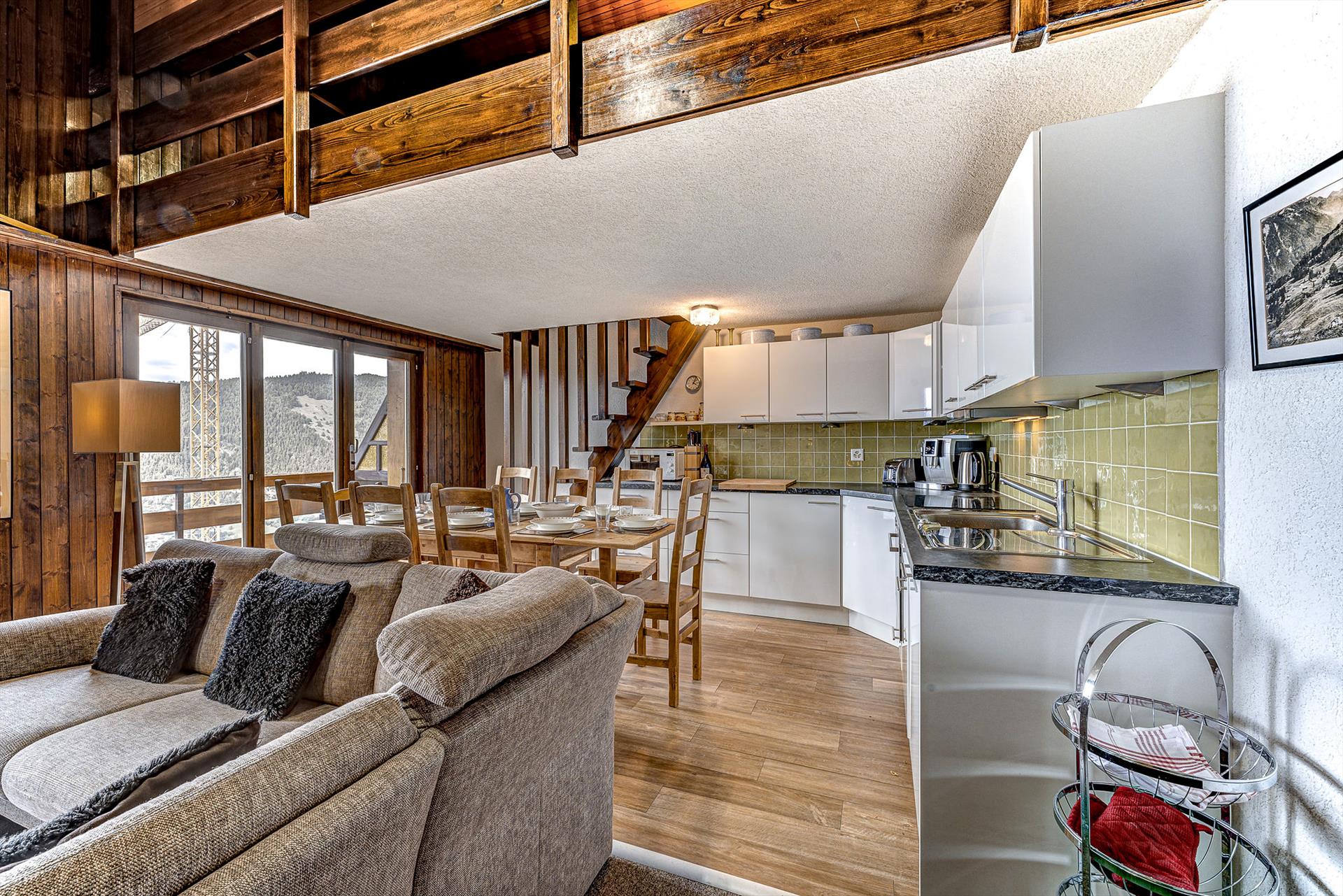 Relax in the large living / dining area after a hard day on the slopes, or simply step out onto the balcony and admire the beautiful panoramic views that face the apartment. On a blue-sky day, the view stretches 20km, up to the peaks of the Haut de Cry and the Mont Gond. Please note that there is no television service, although a screen is available for watching DVDs, or connecting your laptop.