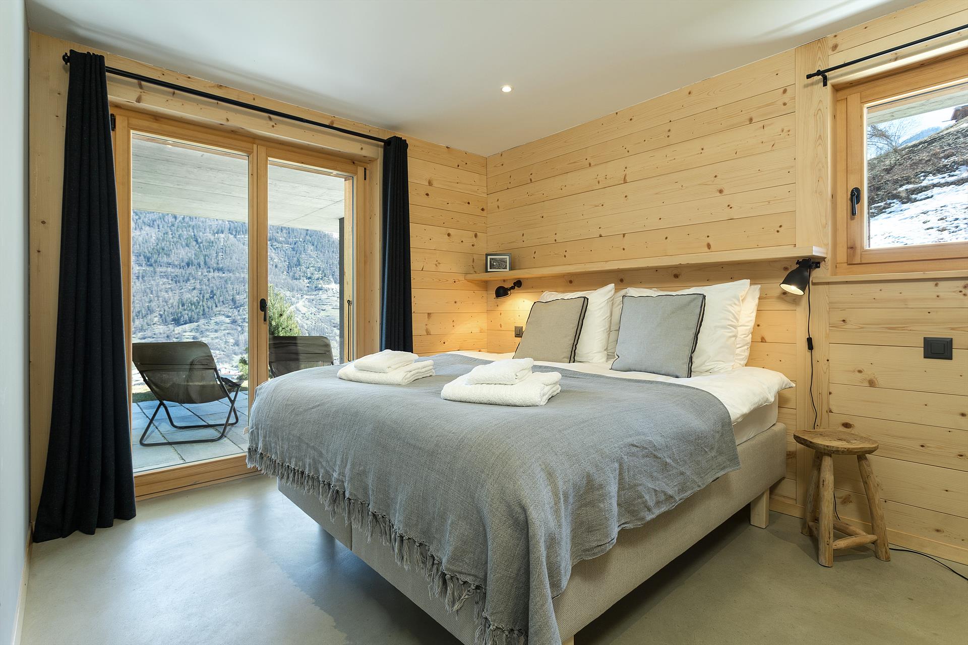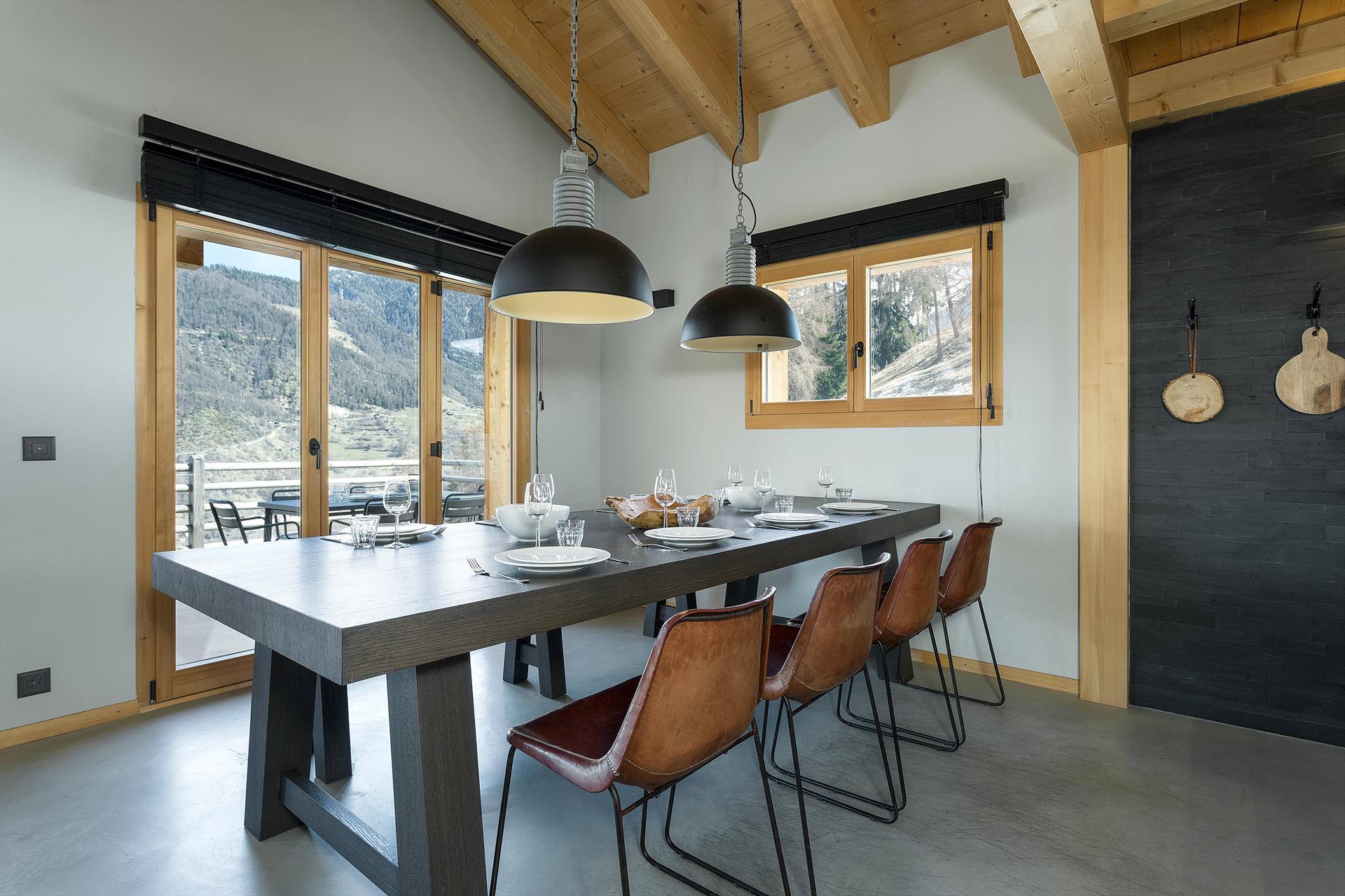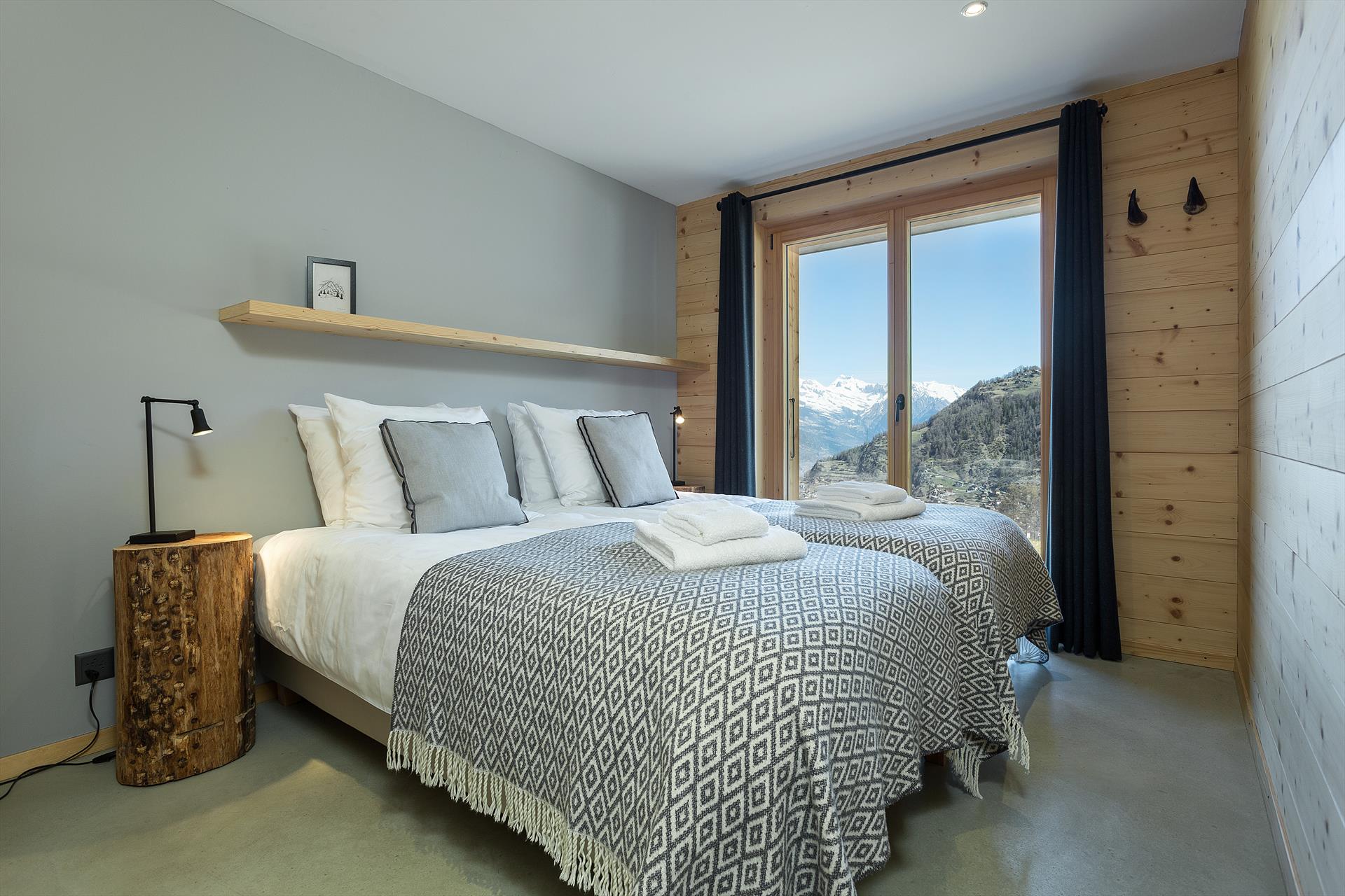 Chalet Aramis is a delightful 4-bedroom chalet with outdoor jacuzzi, with incredible views across the Rhone Valley and to the Bernese Alps. The bright and open living space on the main floor comprises separate areas for cooking, dining and relaxing, and features an enclosed fireplace. This centrepiece room is exposed on all three sides, with large double-height picture windows providing you with breath-taking panoramic views of the surrounding area and into the valley and the mountains beyond. A mezzanine area overlooks the living area, and is a perfect spot to quietly relax.