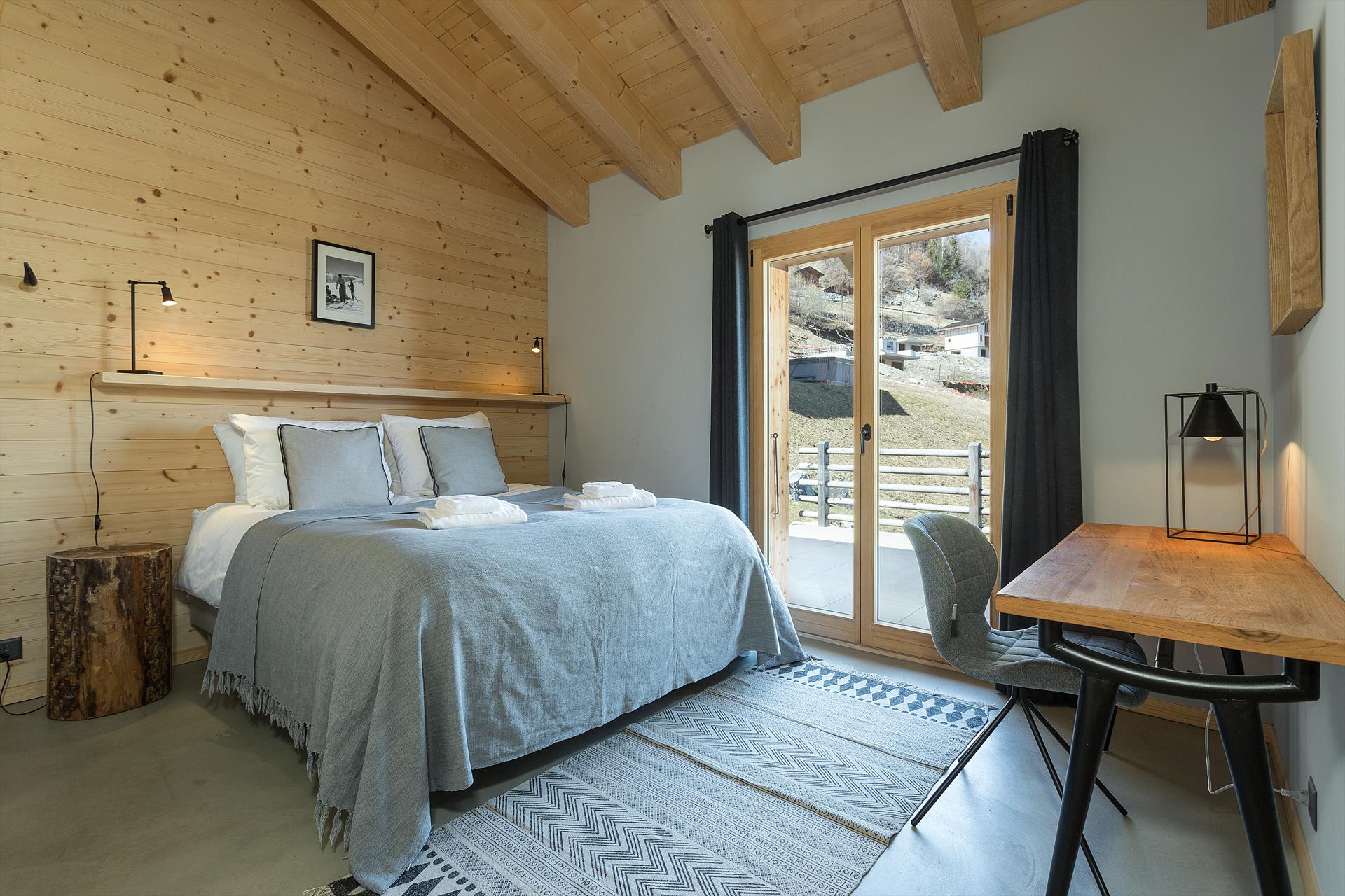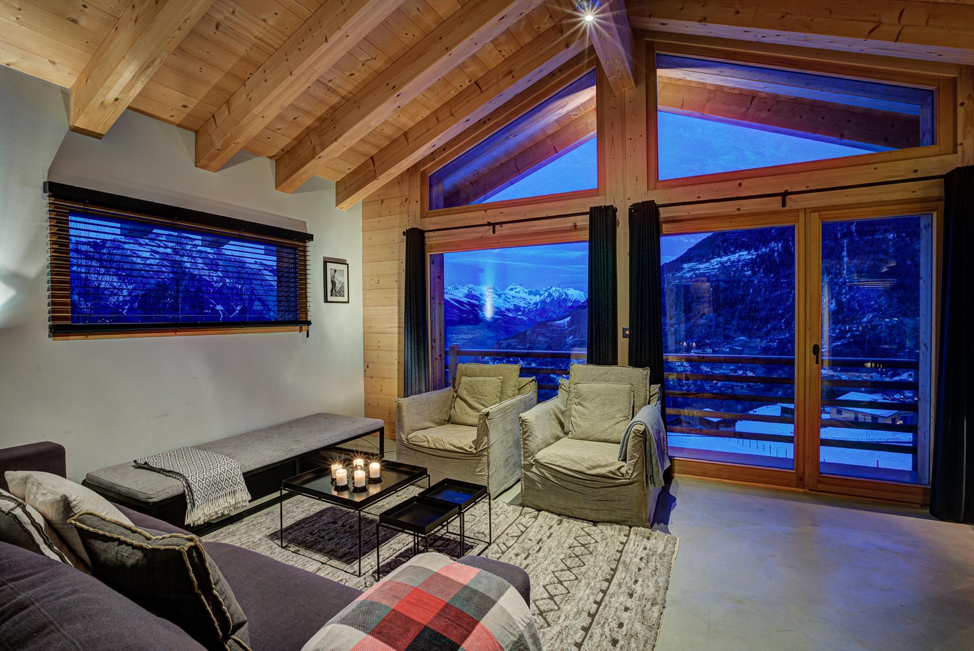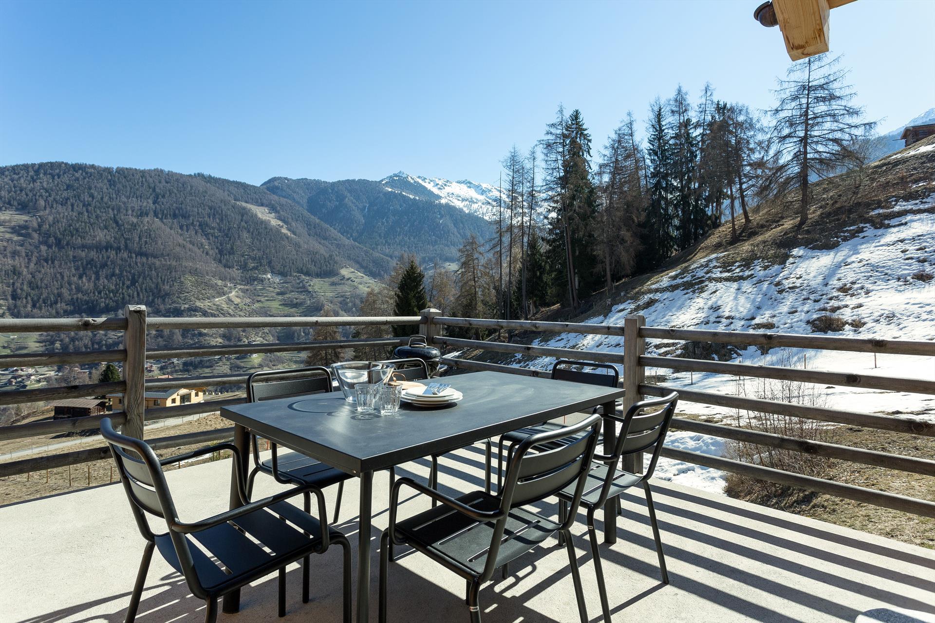 Chalet Aramis is a delightful 4-bedroom chalet with outdoor jacuzzi, with incredible views across the Rhone Valley and to the Bernese Alps. The bright and open living space on the main floor comprises separate areas for cooking, dining and relaxing, and features an enclosed fireplace. This centrepiece room is exposed on all three sides, with large double-height picture windows providing you with breath-taking panoramic views of the surrounding area and into the valley and the mountains beyond. A mezzanine area overlooks the living area, and is a perfect spot to quietly relax.