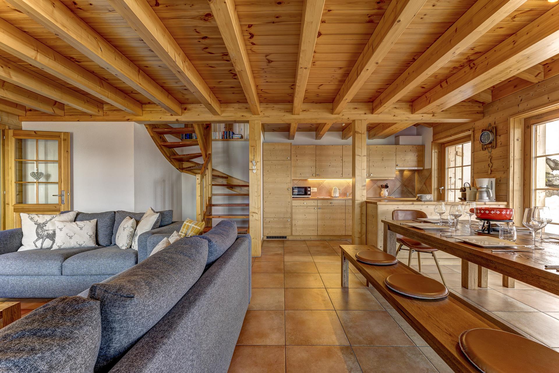In the kitchen you will find all the basics: a fridge and an oven with hob. A kettle, microwave, toaster, electric filter coffee-machine, Nespresso coffee-machine plus fondue and raclette sets for a traditional Swiss evening in front of the log fire. A hairdryer, iron and portable outdoor barbecue are all available for you to use and there is a washing machine and dryer available for you to use. A ski-storage area with coat hooks provides the perfect solution to storing your ski equipment, ready for the next day.