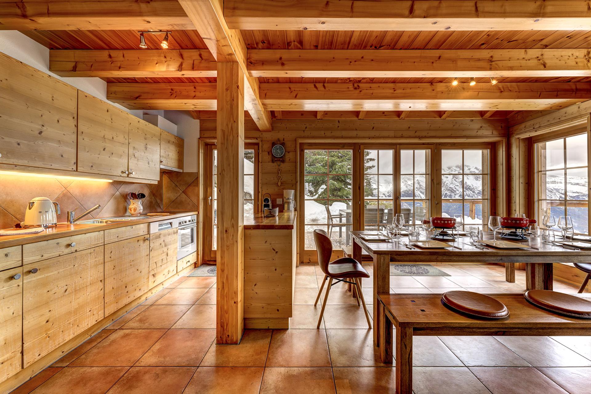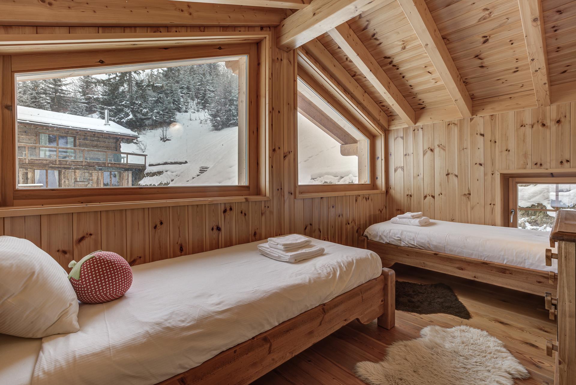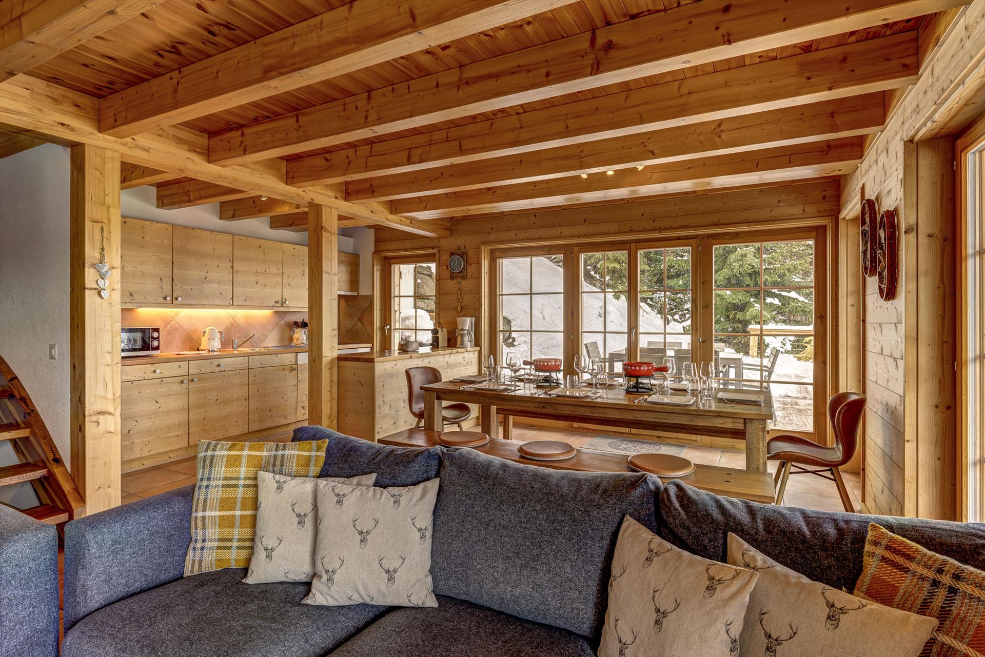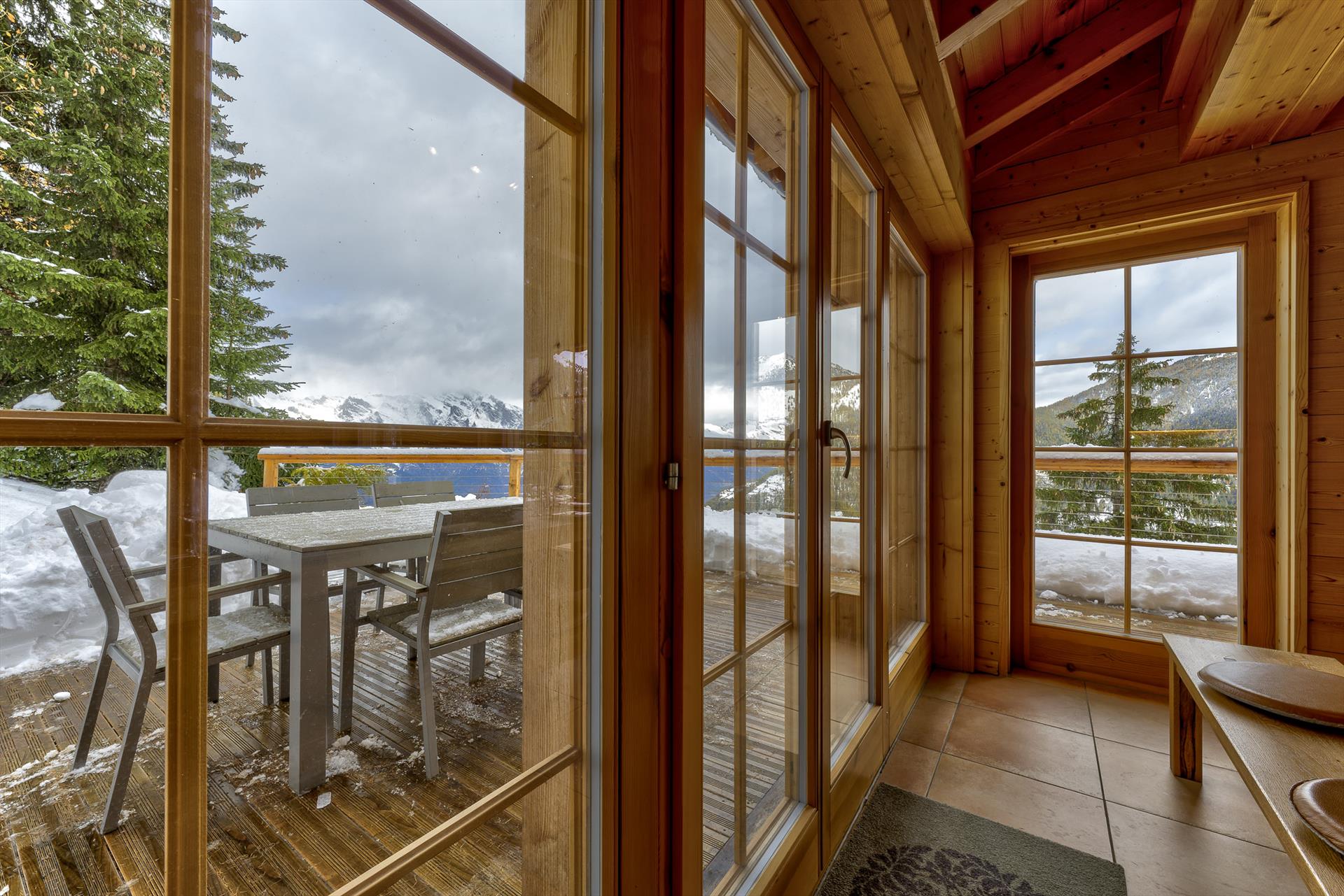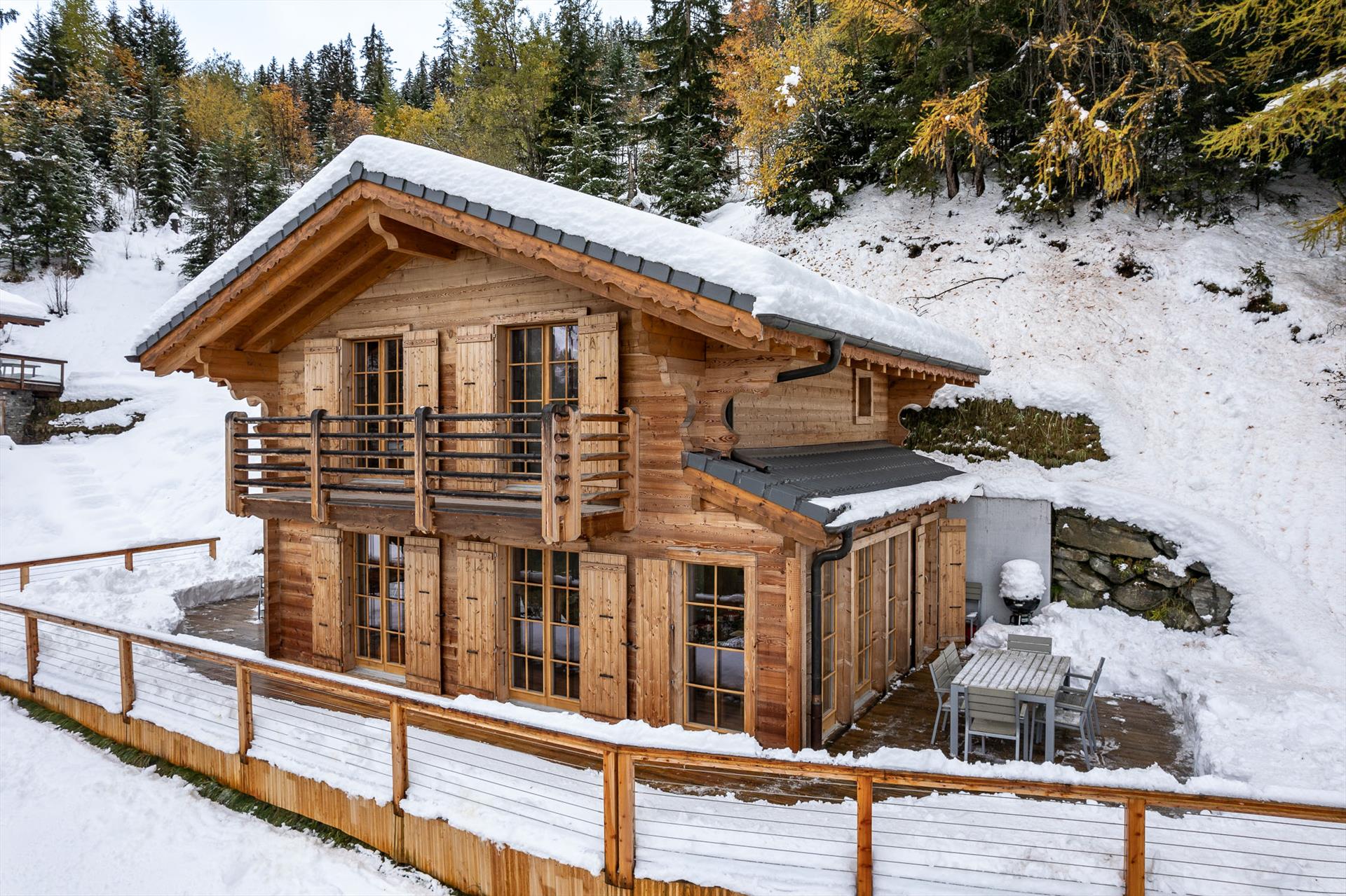 The sauna downstairs is a real treat at the end of a hard day on the slopes. Or you can choose to relax in the large living / dining area, watch the flat-screen TV or listen to music, or simply sit on the balcony and admire the beautiful panoramic views that face the chalet. On a blue-sky day, the view stretches 20km, up to the peaks of the Haut de Cry and the Mont Gond. The chalet grounds border a forested area, which in summer fills the air with delightful birdsong. Sitting at the garden table you can while away the hours watching the tiny cars far away in the valley as they hurry between appointments in the distant towns and cities.