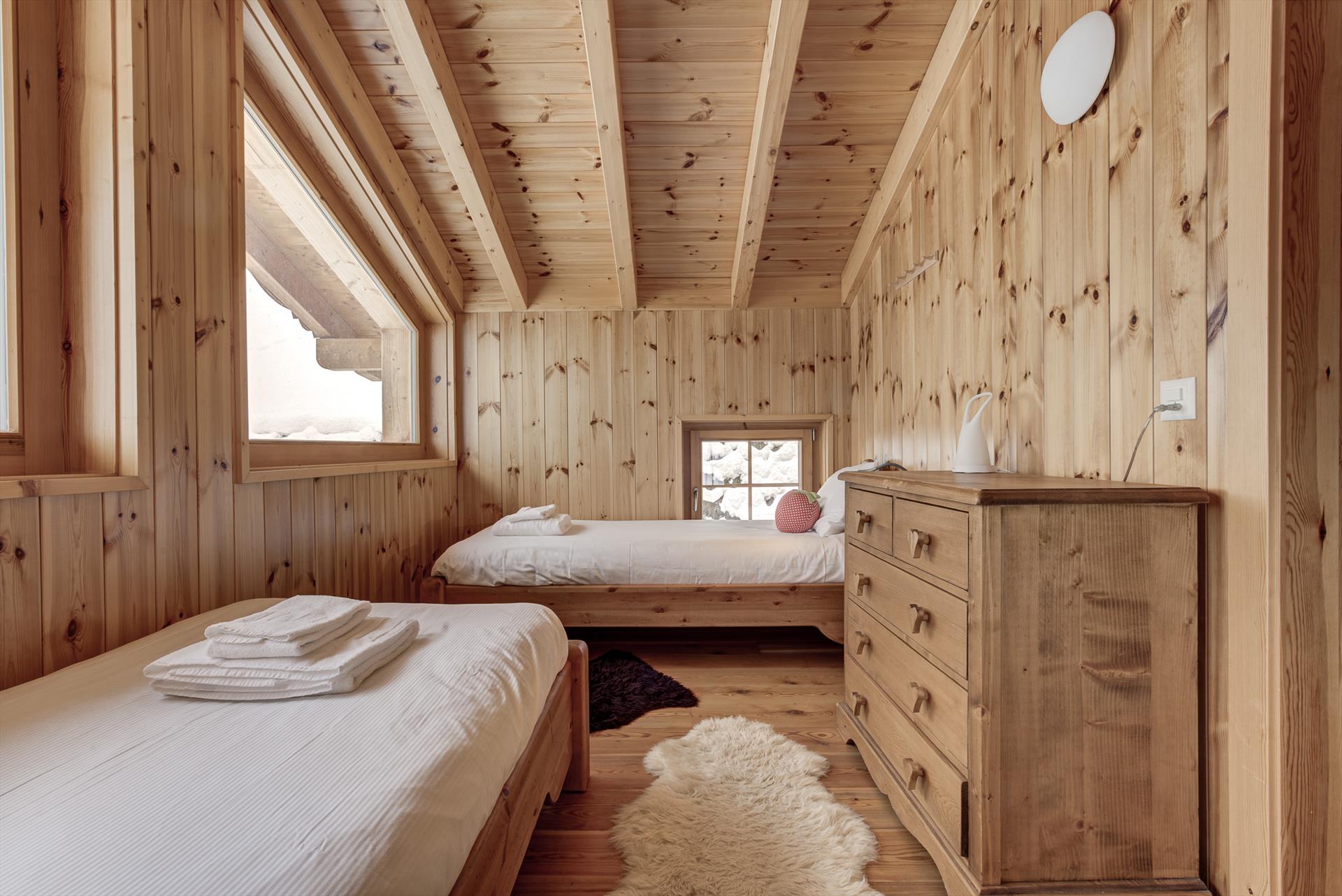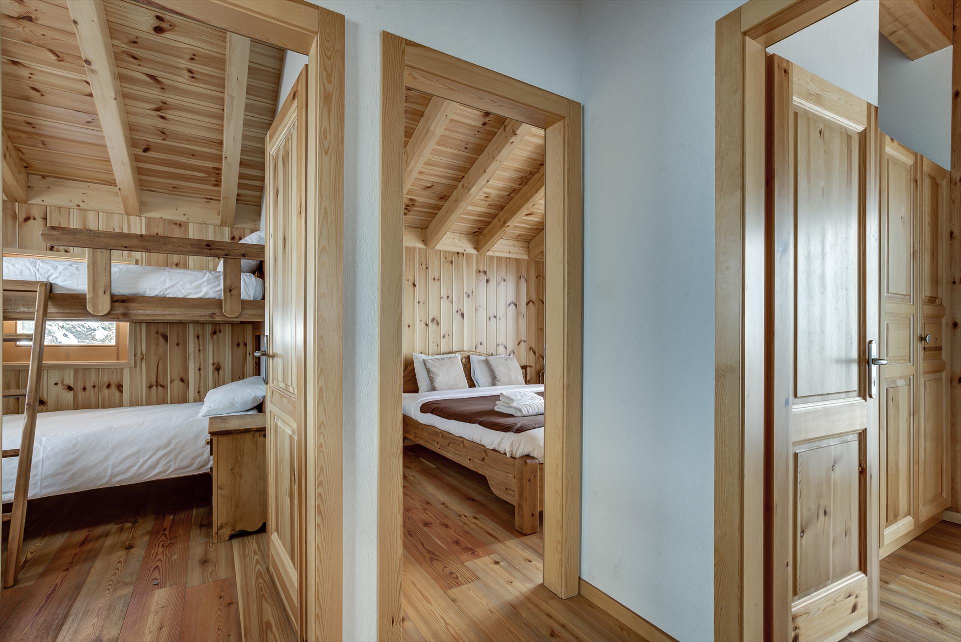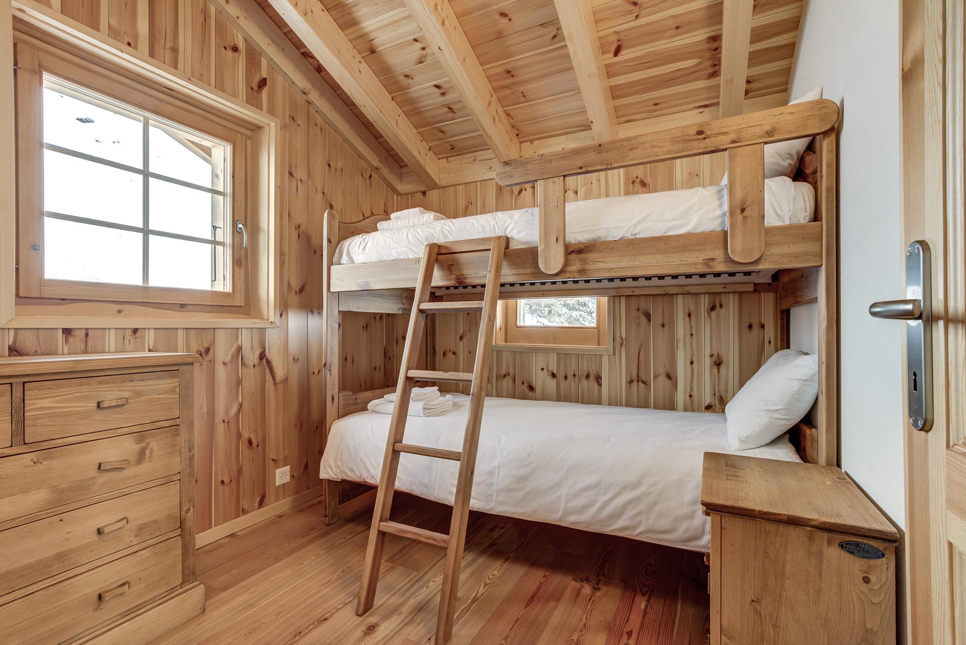 The apartment sleeps up to 8 people in the four bedrooms: two have double beds, one has twin beds and the other is fitted with two bunk beds. The upstairs bathroom has a bath with overhead shower, sink and WC. Downstairs on the living floor is a sauna and a second bathroom with shower, sink and WC. La Tzoumaz Chalet Ard is equipped with a high chair and a folding travel cot (bedding not provided) suitable for children under 2 years old, and a second is available on demand on arrival. Please note that in accordance with the manufacturer's safety instructions, additional mattresses are not provided with the cots.