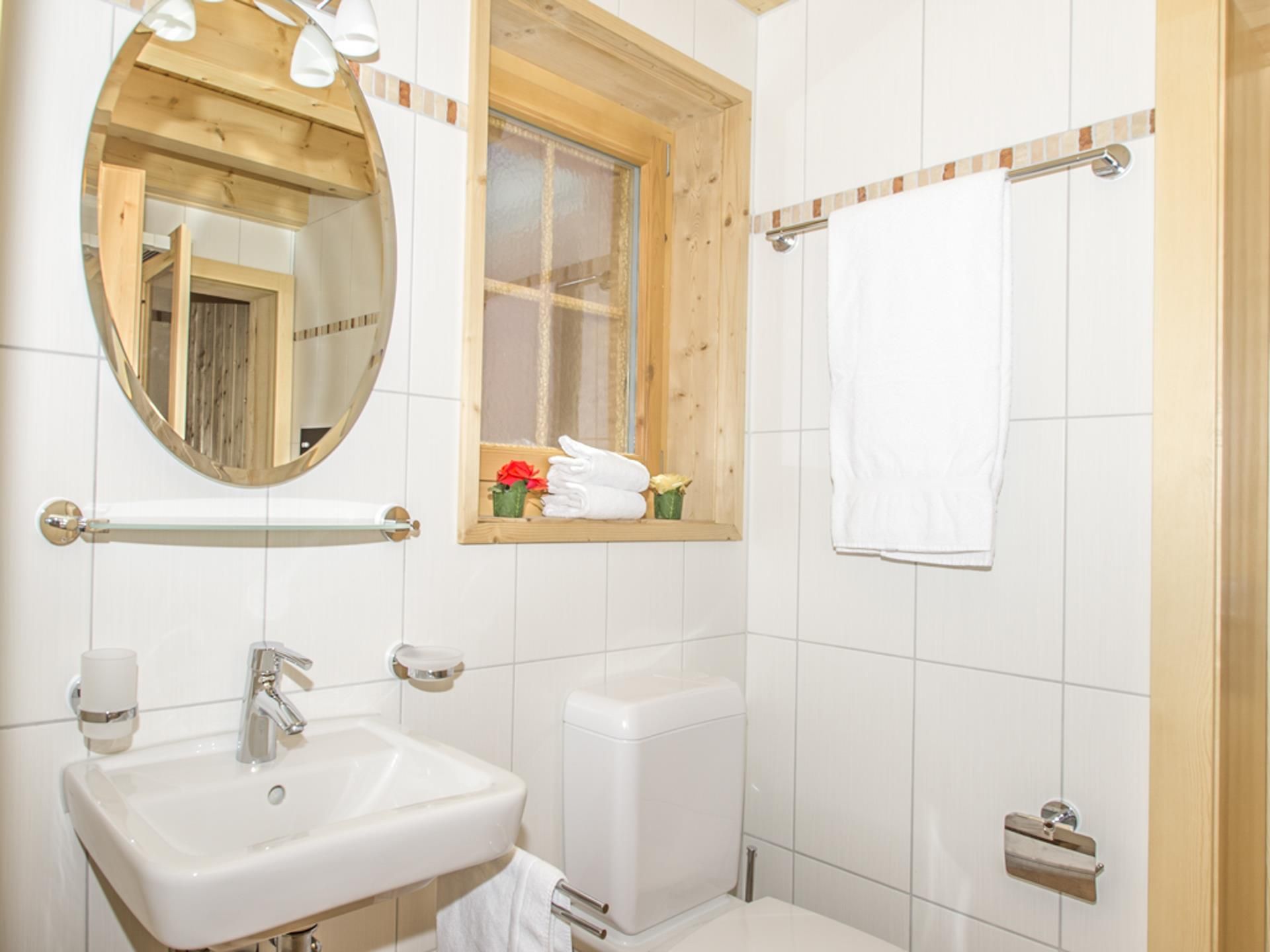 - bathroom with single washbasin, shower, toilet and hairdryer