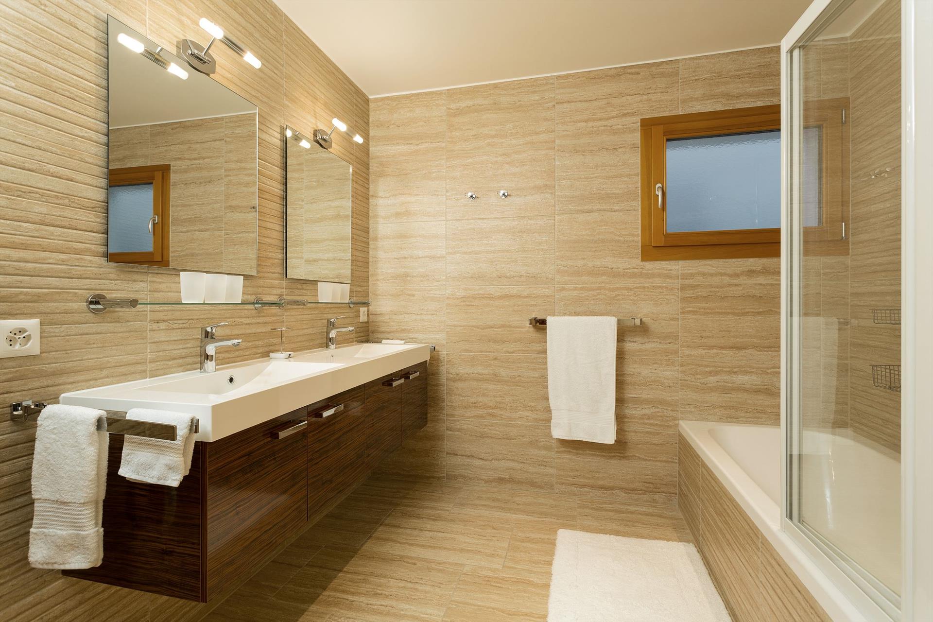 - bathroom with double washbasin, bath/shower combination, toilet and hairdryer