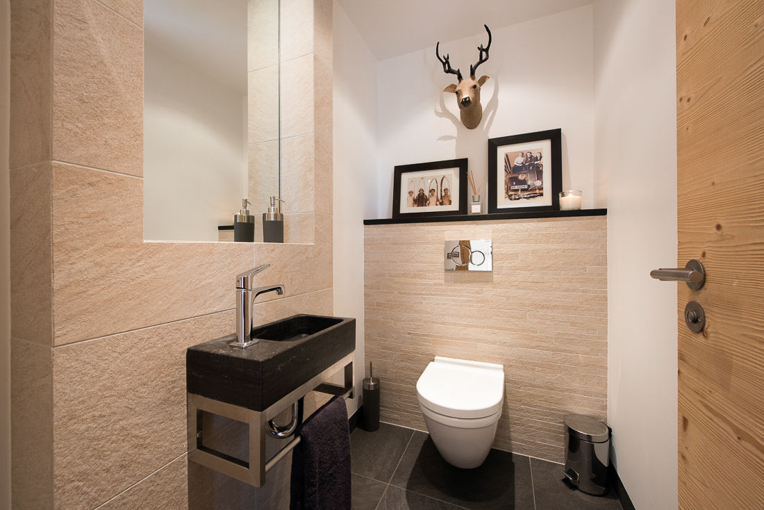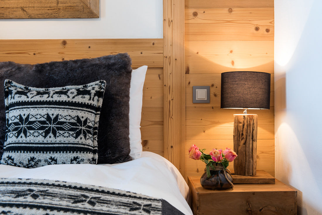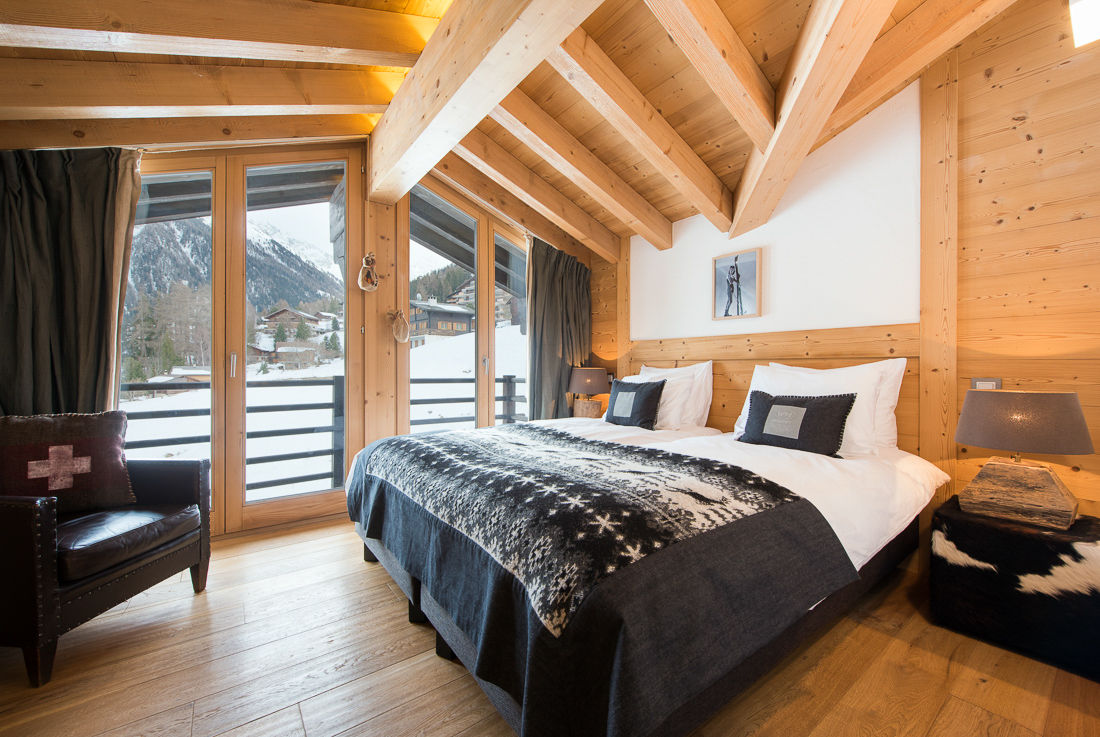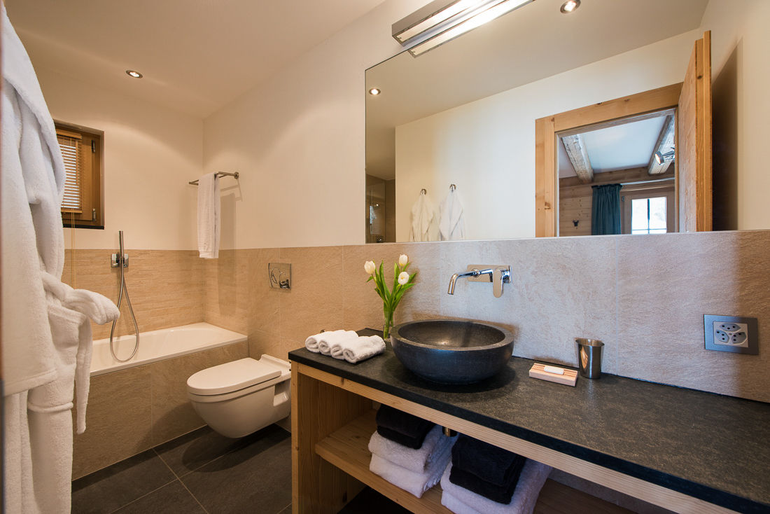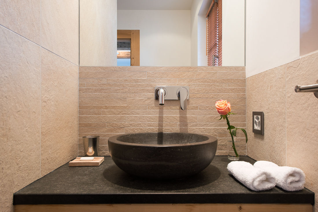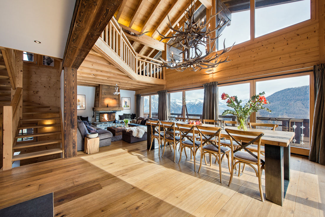 The main double-height living area is the central masterpiece, with superb views over the Rhone valley and the surrounding mountains. Here, the chalet structural design emphasises feelings of openness and space, with plenty of light streaming in from the large glass doors and windows that expose the stunning scenery all around. The carefully selected furnishings and fittings separate this huge space into a cosy lounge area focused around the open fireplace, a modern kitchen with cooking island and bar to seat five people, and a dining area that comfortably seats 12 around the large table. The fully-fitted kitchen has everything you might need for your hioliday cooking, including oven, 4-ring hob, separate freezer, microwave, kettle, toaster, electric filter coffee-machine, Nespresso coffee-machine plus 2 fondue sets and 2 raclette sets.