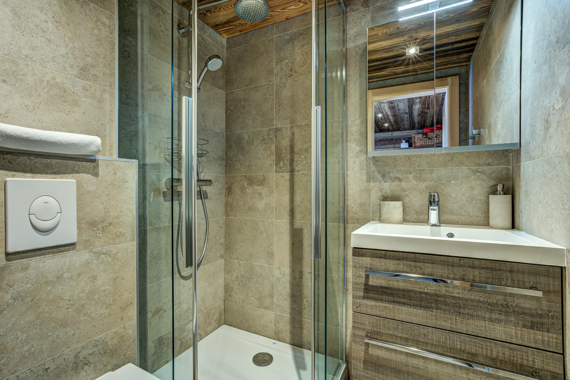 The main floor of this large chalet features an open kitchen/living/dining area with a wood stove fireplace and mountain views. The kitchen is fully equipped with everything you might need for family catering, including an induction cooker, double electric oven, dishwasher, refrigerator, freezer, coffee machine, Nespresso machine, electric kettle, mixer, and toaster. There are fondue and raclette sets for a traditional Swiss evening in front of the log fire. A portable outdoor barbecue is available for you to use. The electric heating can be adjusted for your comfort by the thermostats in the living areas. The laundry room includes a washing machine and tumble dryer.