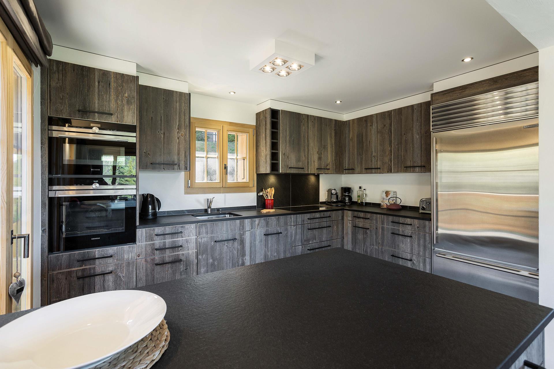 The main living floor has a wonderful double height dining area that opens onto a lounge area with amazing views and a stone fireplace. The open kitchen is fully-equipped with all that you might need such as oven, hob, microwave, dishwasher and fridge/freezer. There is a kettle, toaster, electric filter coffee machine and Nespresso coffee machine. Raceltte and fondue sets are available for you to enjoy a traditional Swiss evening in front of the log fire. There is underfloor throughout the chalet. The utility room has washing machine, tumble dryer and iron. A ski-boot dryer is available to ensure you have warm and dry ski-boots every day.