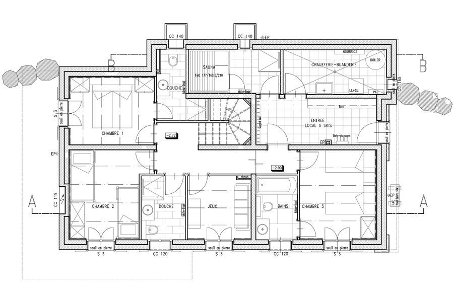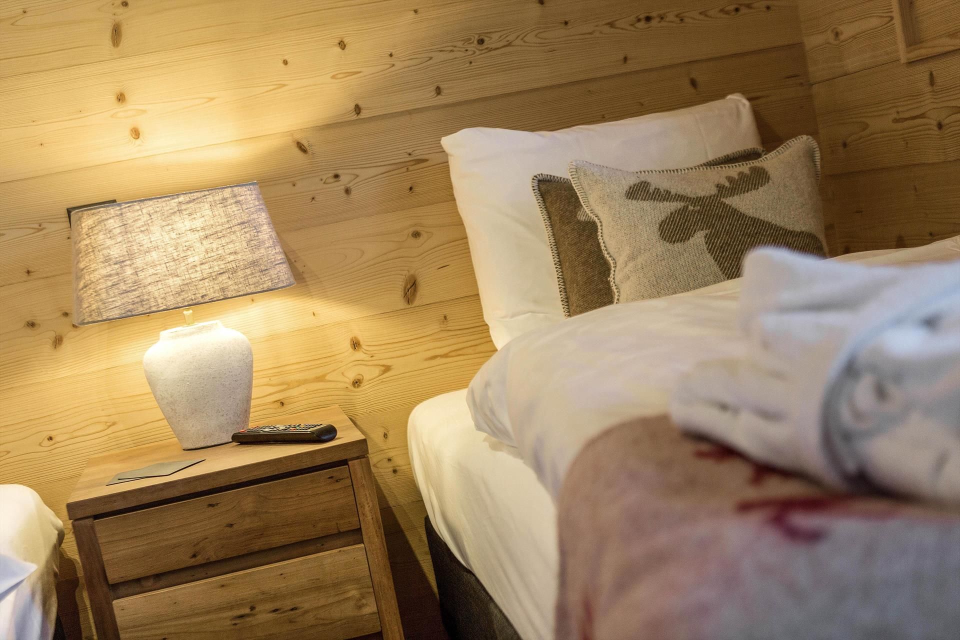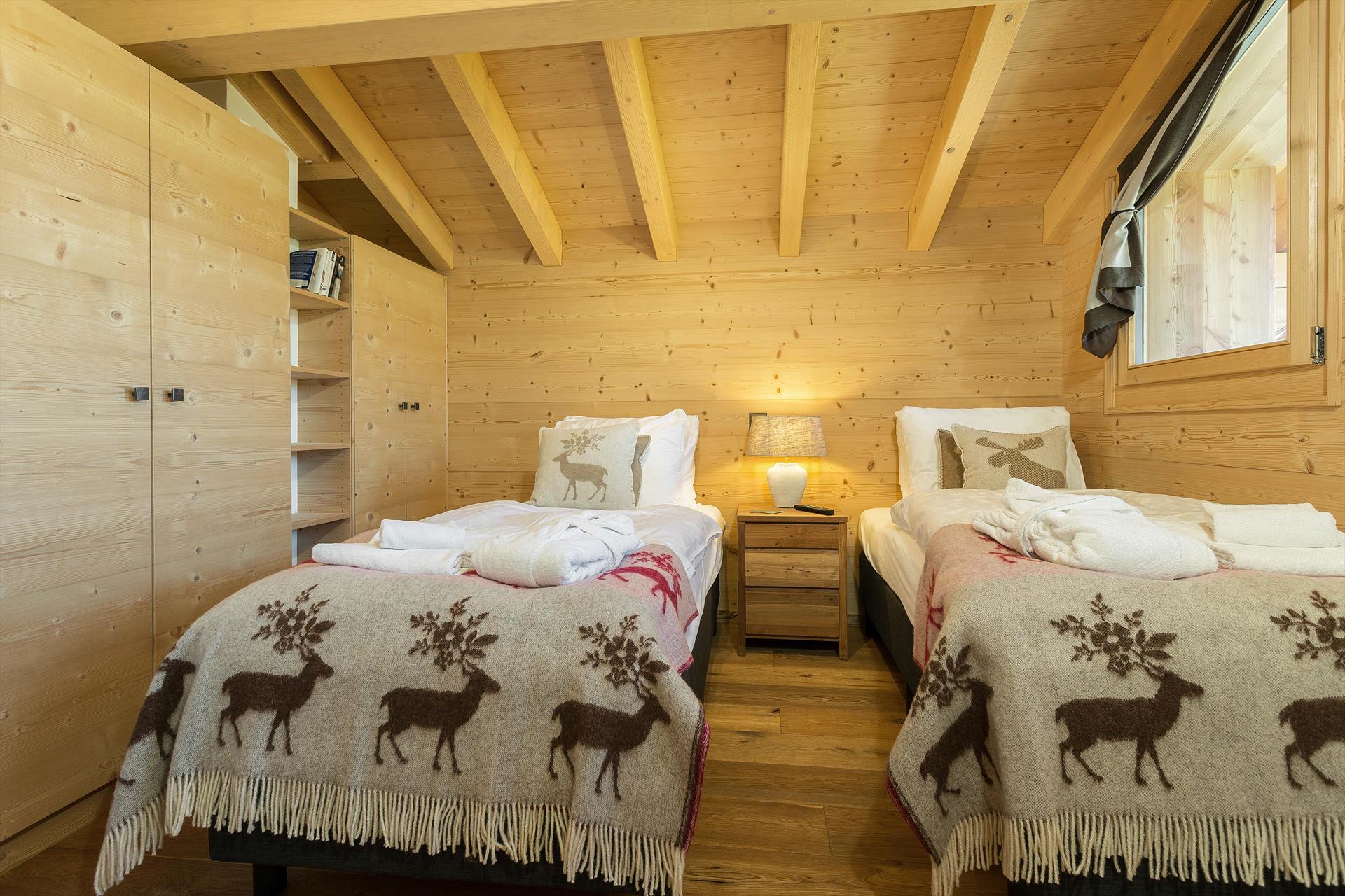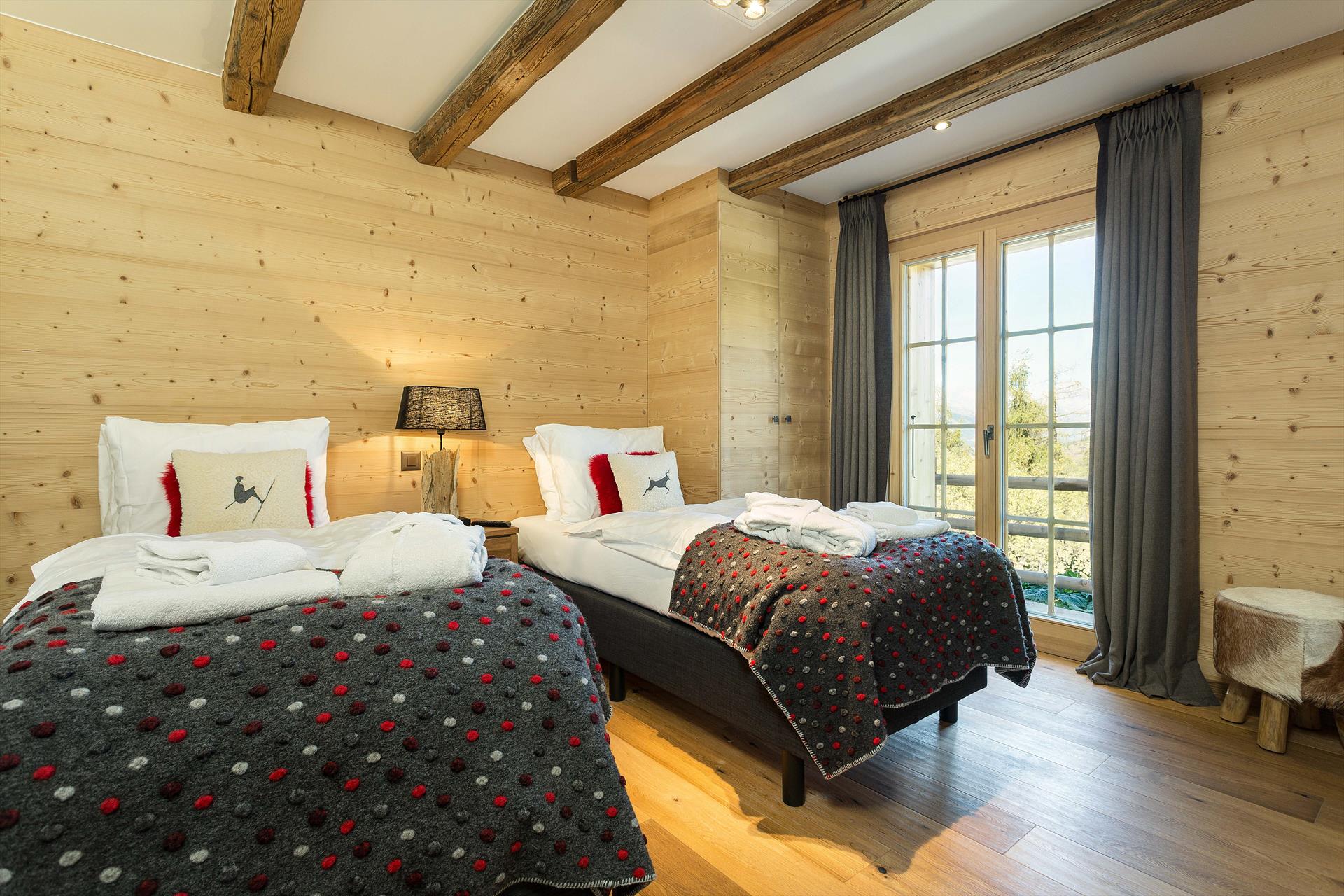 The chalet comfortably accommodates eight people in luxurious comfort. It has five bedrooms, each with TV, so could sleep up to 10 people in full-sized beds. Three of the bedrooms are twin bedrooms, one is a double bedroom and the other bedroom has bunk beds for two people. There are four bathrooms (two with a bath) and a sauna. On the middle (living) floor there is a Guest WC.