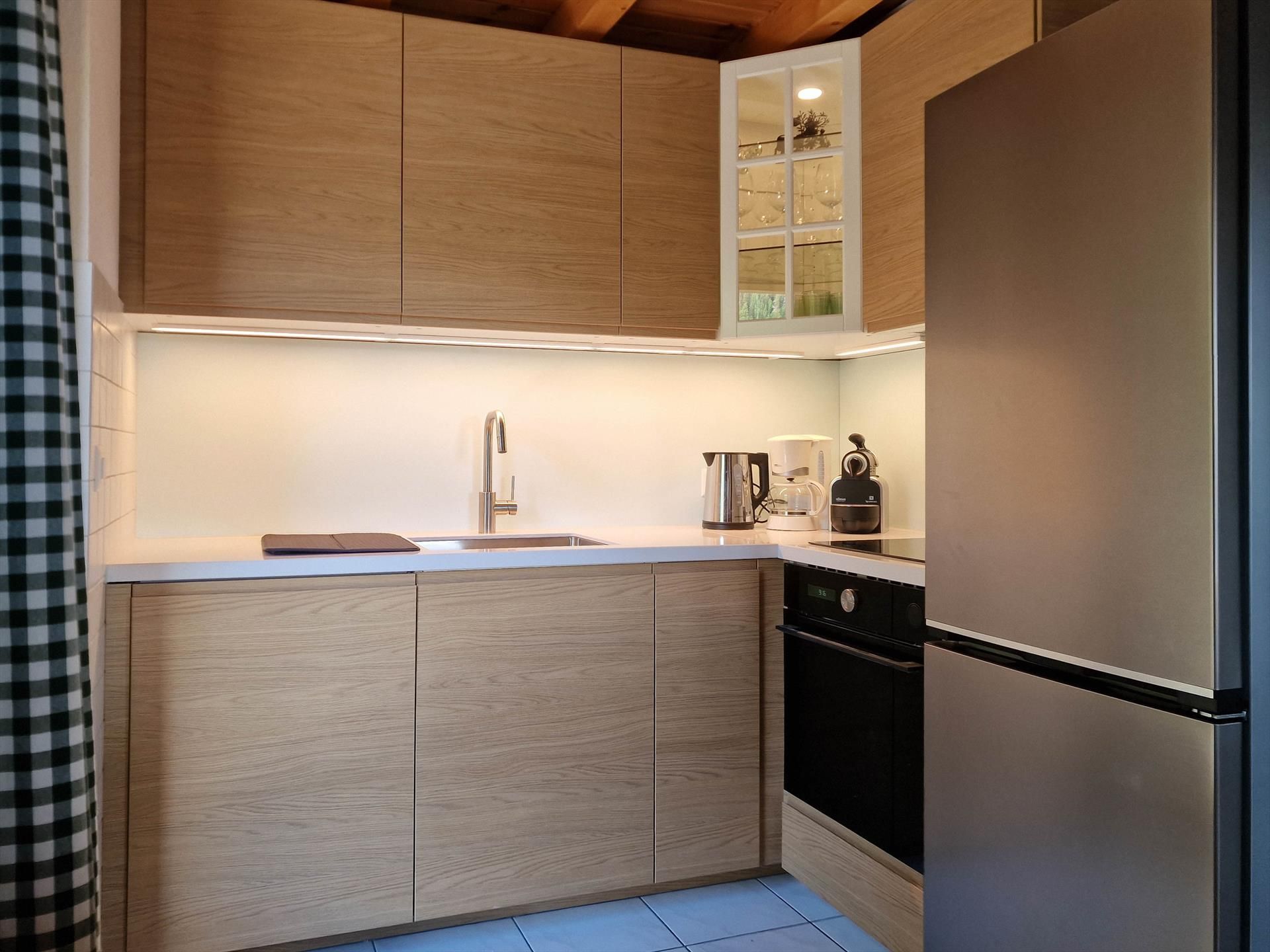 - open kitchen with electric hob, electric oven, microwave, dishwasher, refrigerator, coffee machine, electric kettle, mixer and toaster