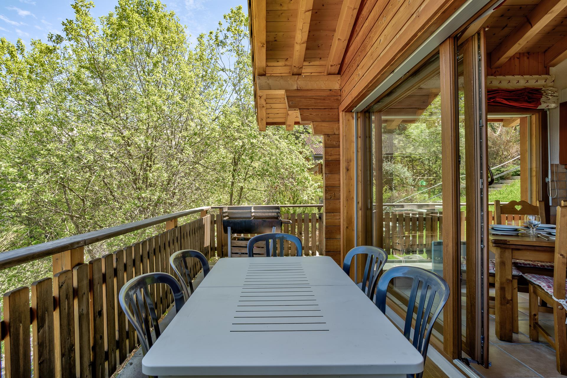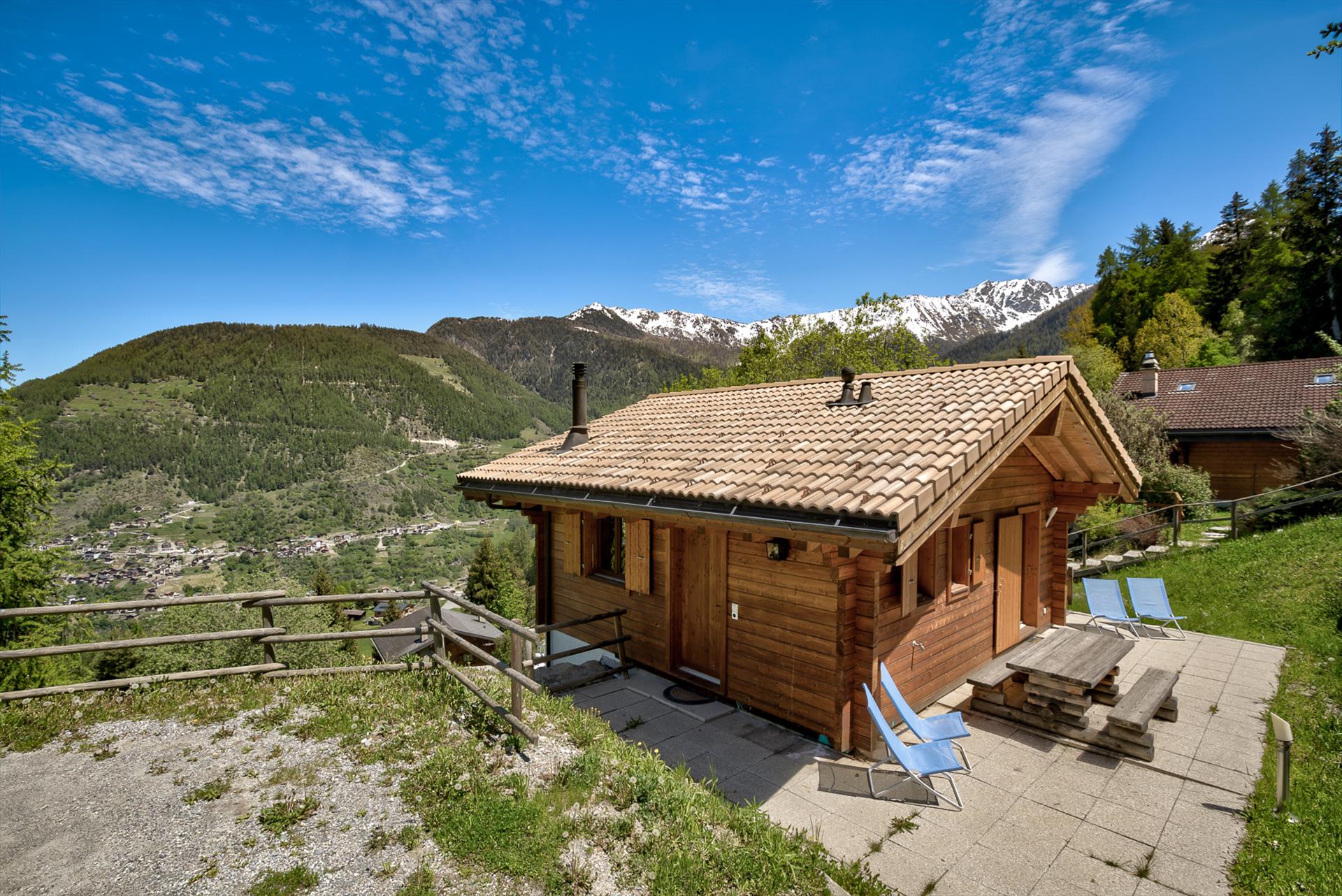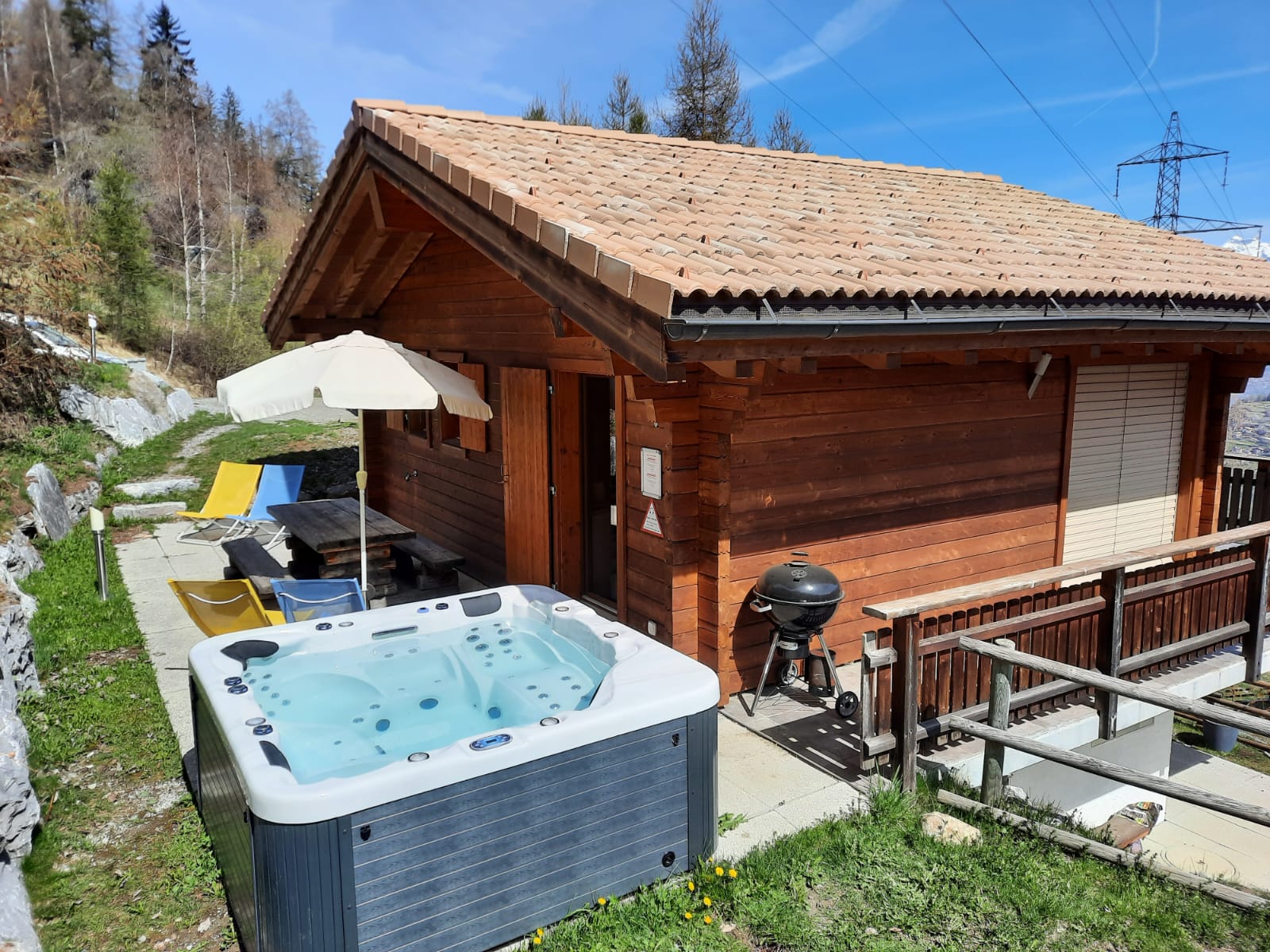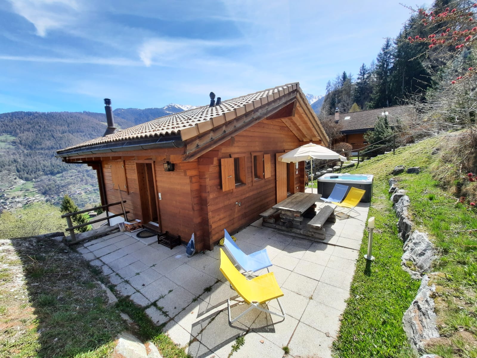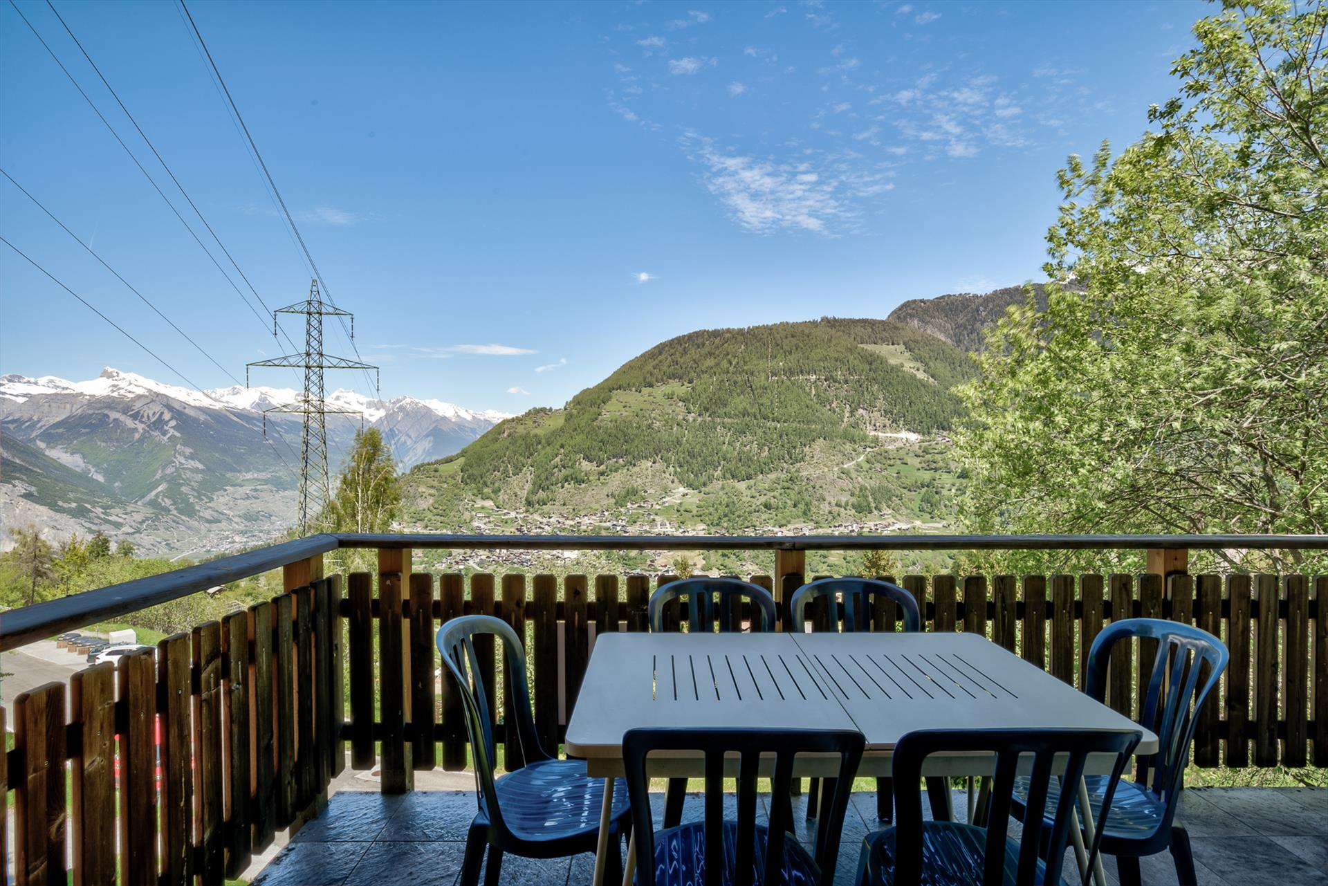 The chalet is close to a forested area, which in summer fills the air with delightful birdsong and makes the south-facing patio a real pleasure in the summer. Soak in the jacuzzi after an energetic day on the mountain, or later on while looking for shooting stars in the starry skies overhead. Indoors, it is easy to relax in the open living / dining area, watch the flat-screen TV or listen to music, and a pleasure to sit at the table and admire the beautiful panoramic views that face the chalet. On the balcony you can while away the hours watching the tiny cars far away in the valley as they hurry between appointments in the distant towns and cities. On blue-sky days, of which there are many, the view stretches 20km, up to the peaks of the Haut de Cry and the Mont Gond. Due to the relaxing nature of this area, please note that absolutely no parties are allowed, and no outdoor noise will be tolerated after 22h.