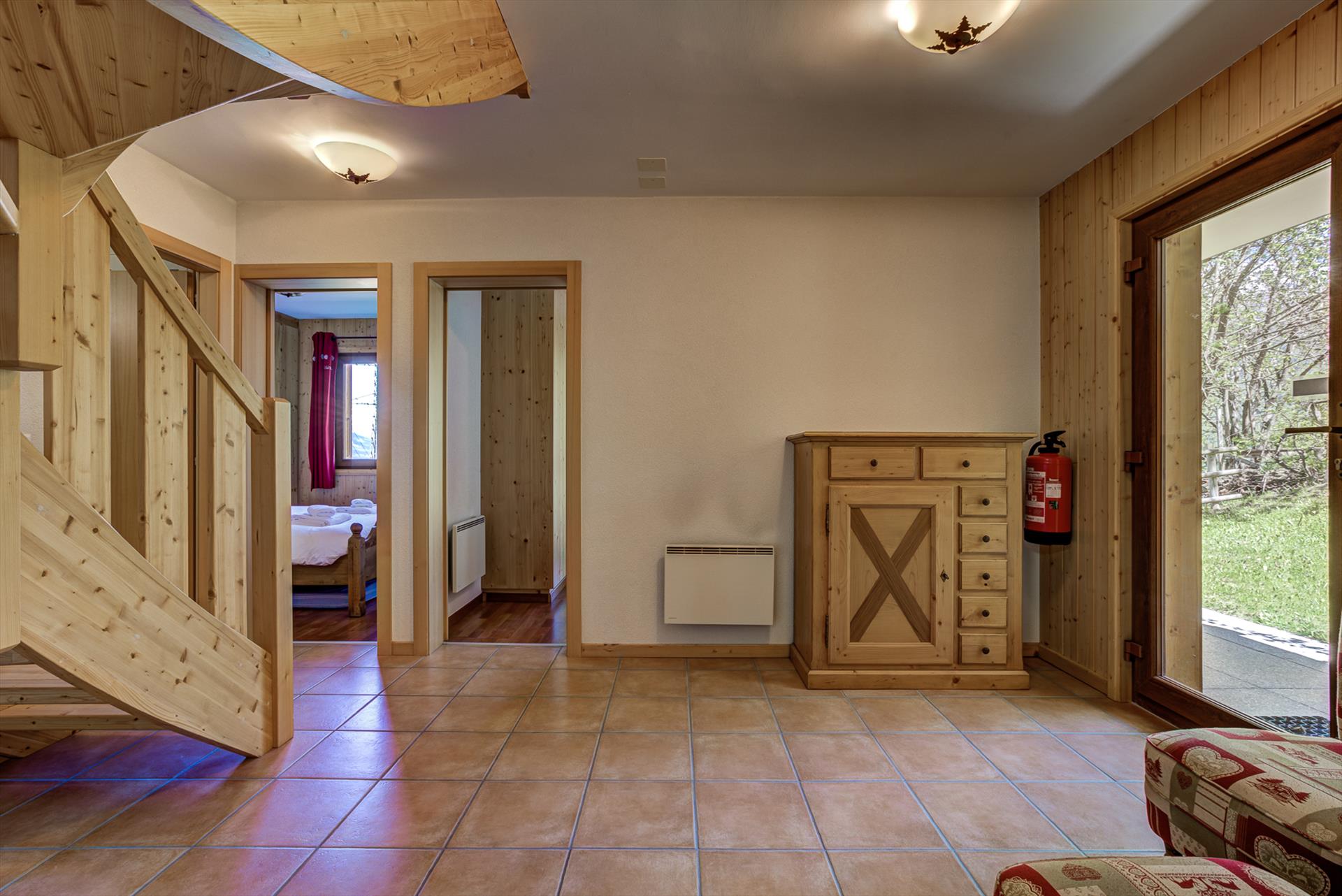 This three-bedroom chalet can sleep up to 6 people in one double bedroom and two twin bedrooms. The bathroom is fitted with bath, sink and WC and there is a separate guest WC on the main living level.