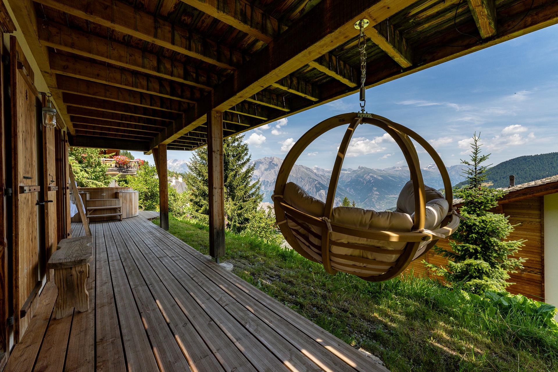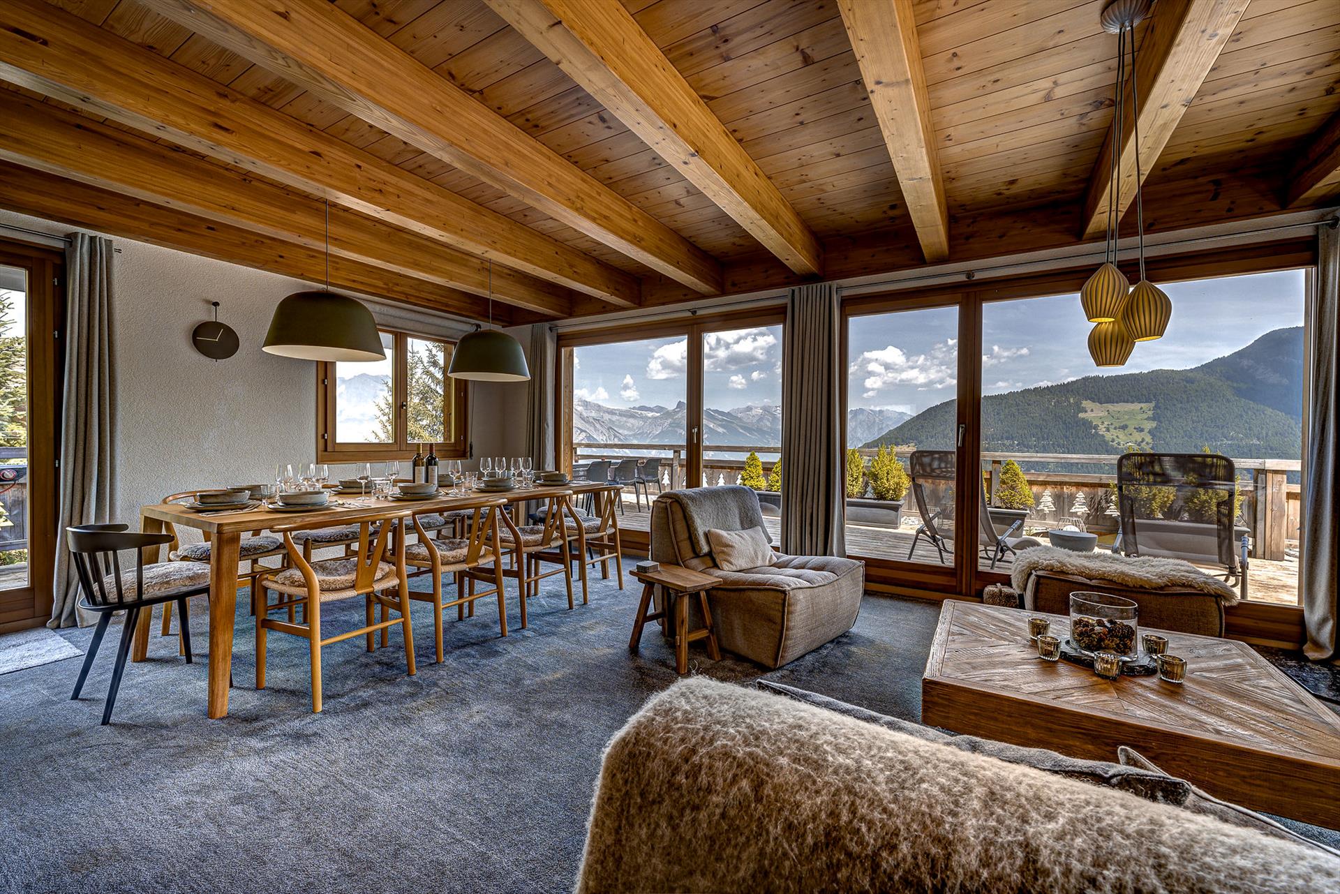 This luxury family chalet is a rare treat in La Tzoumaz – ski-in and ski-out access, and an easy walk to the town centre! From the moment the automatic garage door opens to allow you into the snow-free underground parking, everything has been designed with a family of skiers in mind: the parking is linked first to the chalet and then to the piste by a 70m shuttle cabin on rails that easily climbs the near-vertical mountainside, so that you don’t have to! This is what makes Chalet Sapin Argente ski-in ski-out. No more struggling onto a ski-bus with arms full of children’s skis and poles, and no need to walk around in your ski-boots. There’s also no need to clear snow from your car in the mornings as you can just park it indoors and forget about it until it’s time to go home. In fact, you really don’t need a car if you’re staying here in the winter. Due to its elevated position, Chalet Sapin Argente benefits from fantastic views across the valley and to the mountains up to 20km away. The large windows of the open living / dining area were specially designed to make the most of this ever-changing vista.