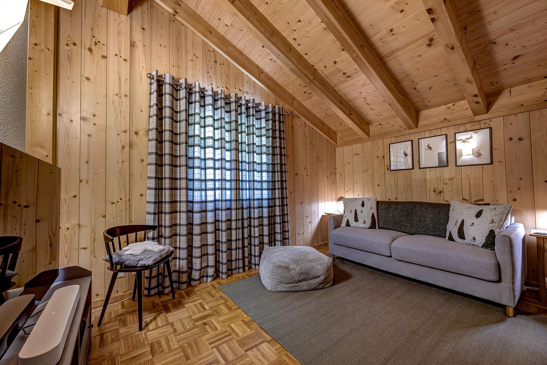 With its five bedrooms and three bathrooms, this chalet is ideal for families of up to 10 people. Downstairs are two twin bedrooms and a bathroom with bath, overhead shower, sink and WC. Upstairs there are two double bedrooms (with balcony access), a TV room with sofabed, and a bathroom with bath and overhead shower, sink and WC. The third bathroom is on the main living floor and consists of a shower cubicle, sink and WC.