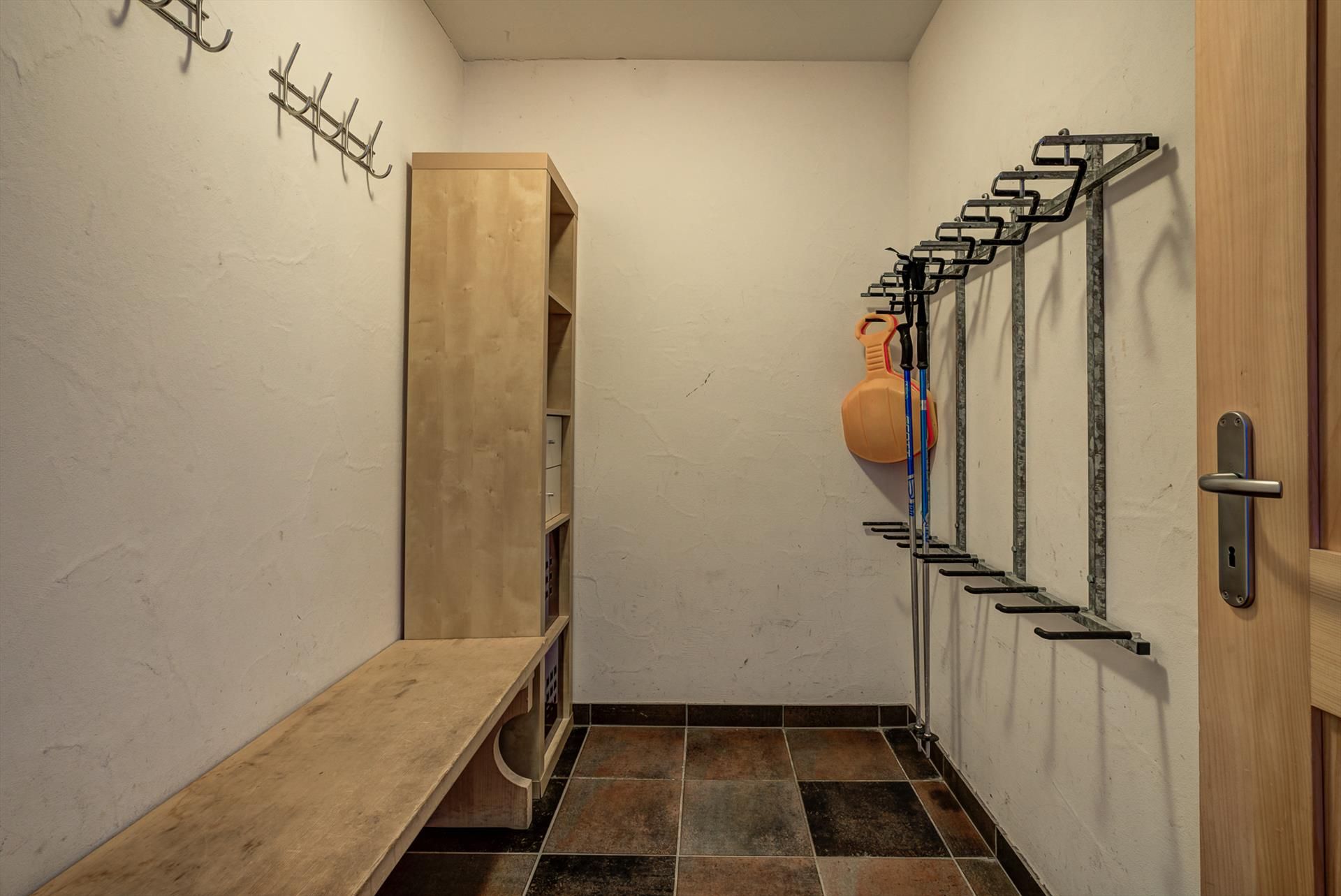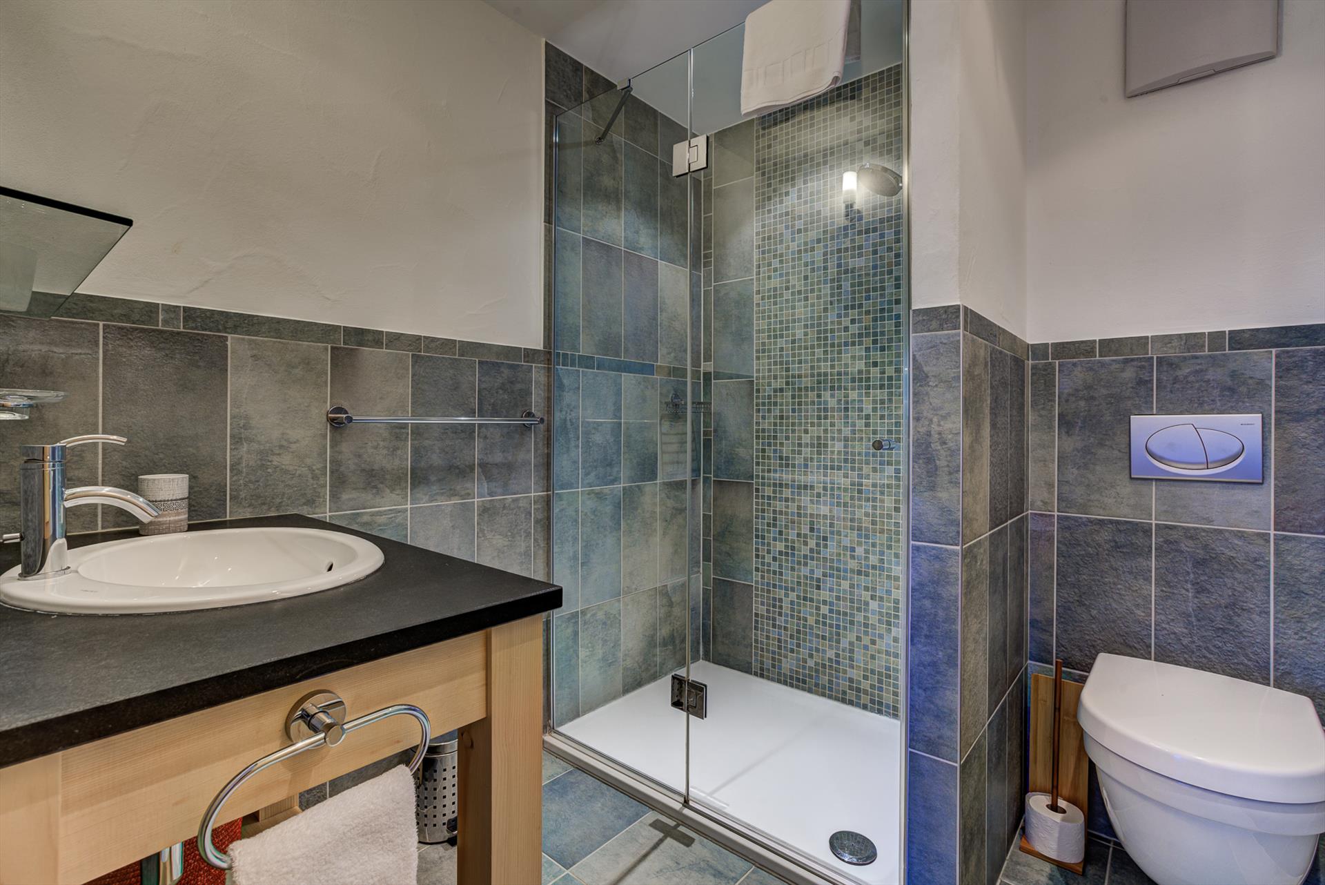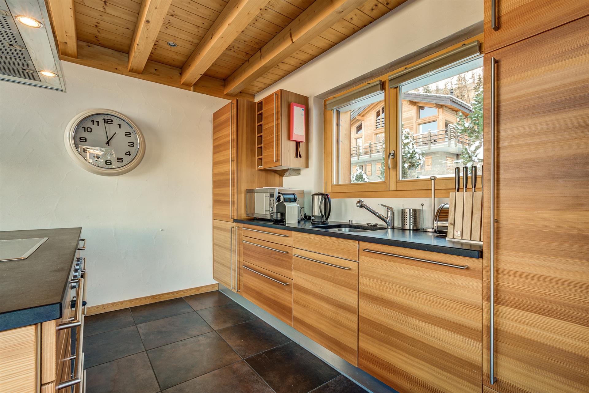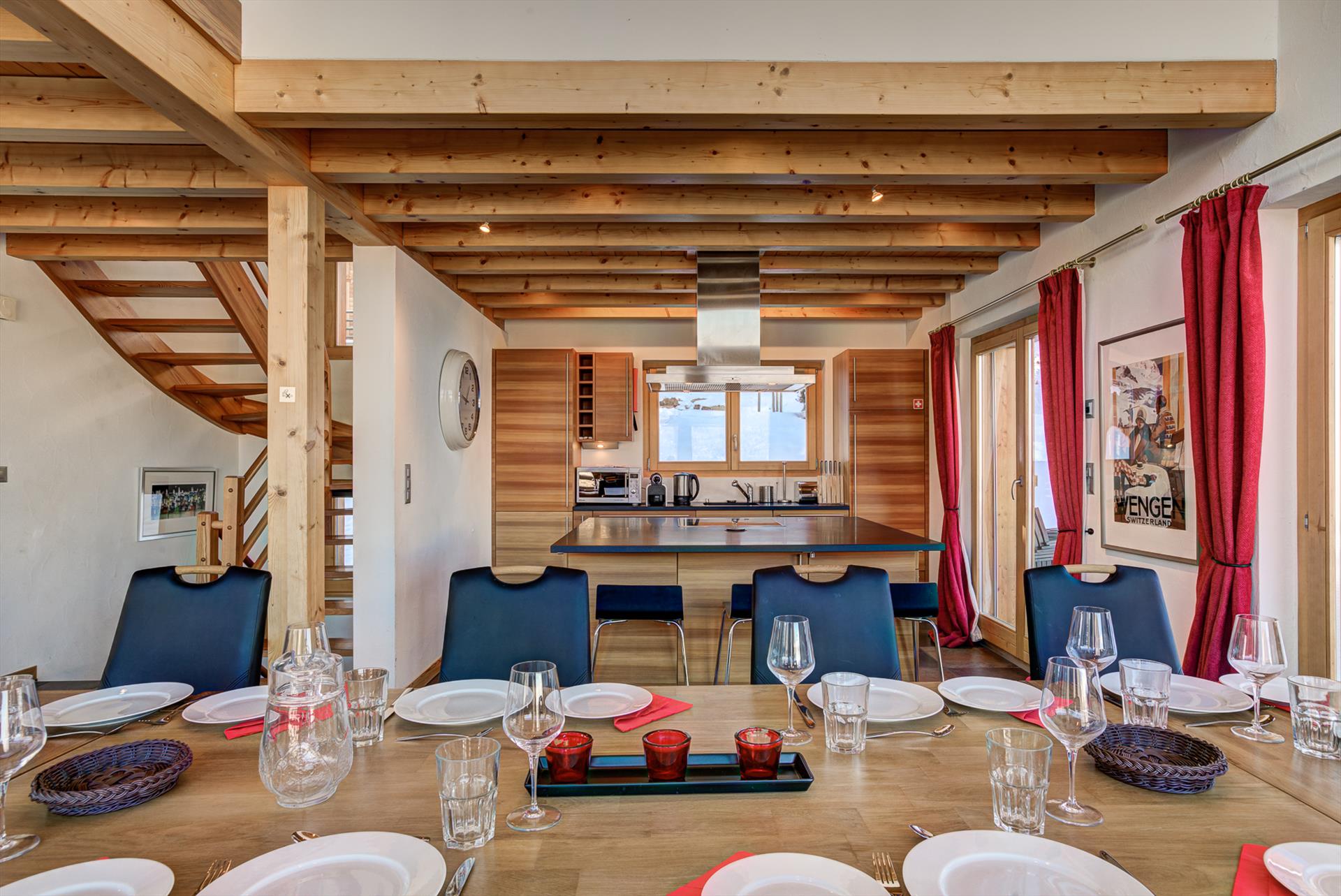 The main floor of this large chalet is an open kitchen/living/dining area with wood-burning stove and underfloor heating. The spacious kitchen is fully equipped with everything you might need for large group catering, including a huge central island, dishwasher, microwave, electric filter coffee machine, Nespresso coffee machine, oven and ceramic glass hob. There are fondue and raclette sets for a traditional Swiss evening in front of the log fire. Washing machine, dryer, hairdryer, iron and a large gas outdoor barbecue grill are all available for you to use. A large walk-in ski-store just inside the front door helps you to keep all your snow sports clothing and equipment organised.