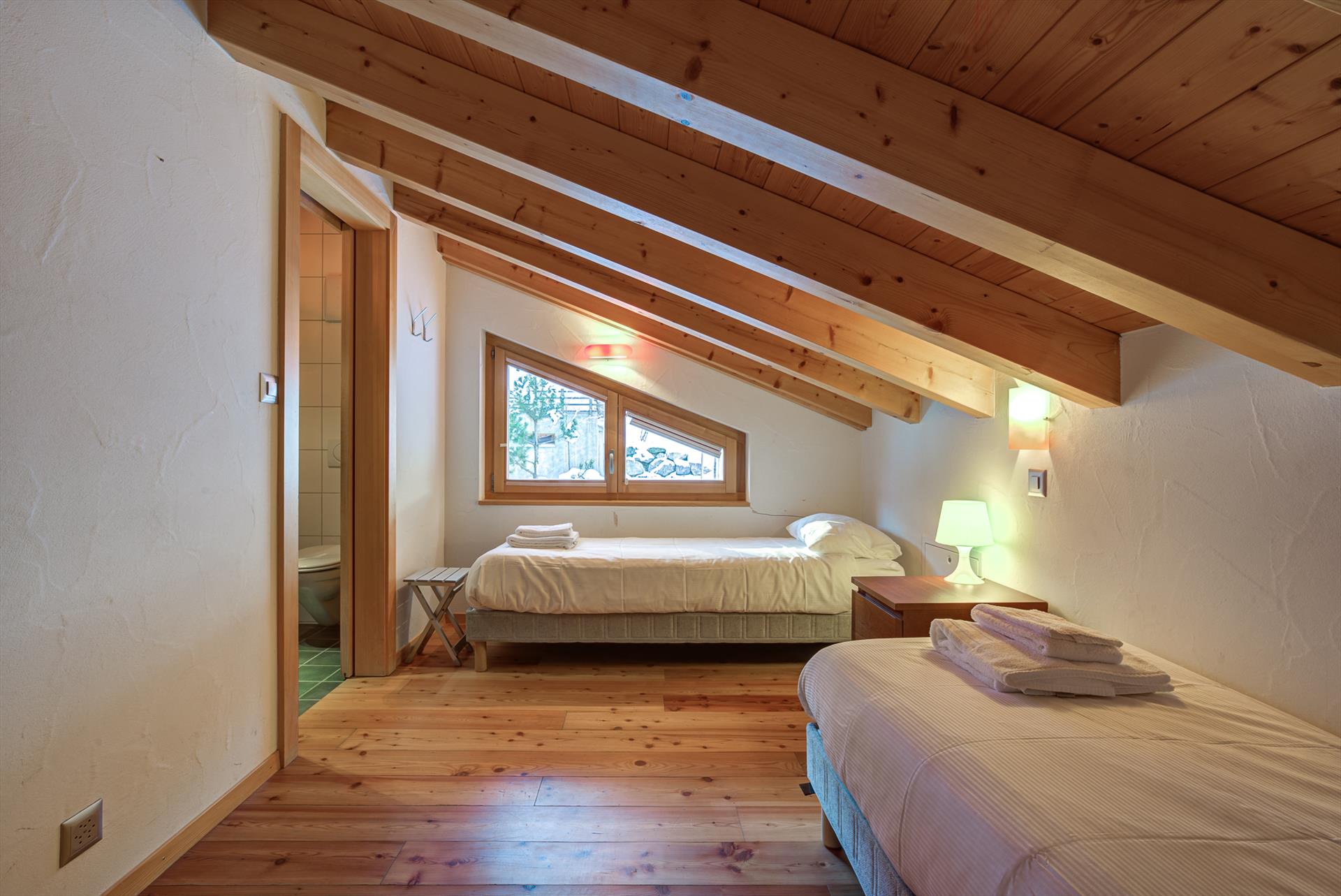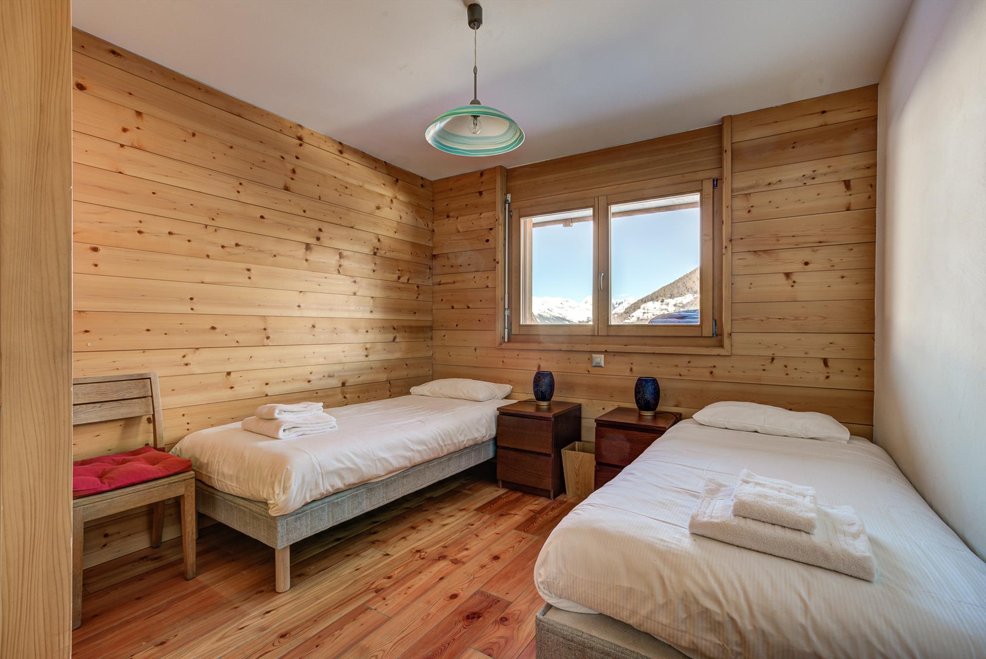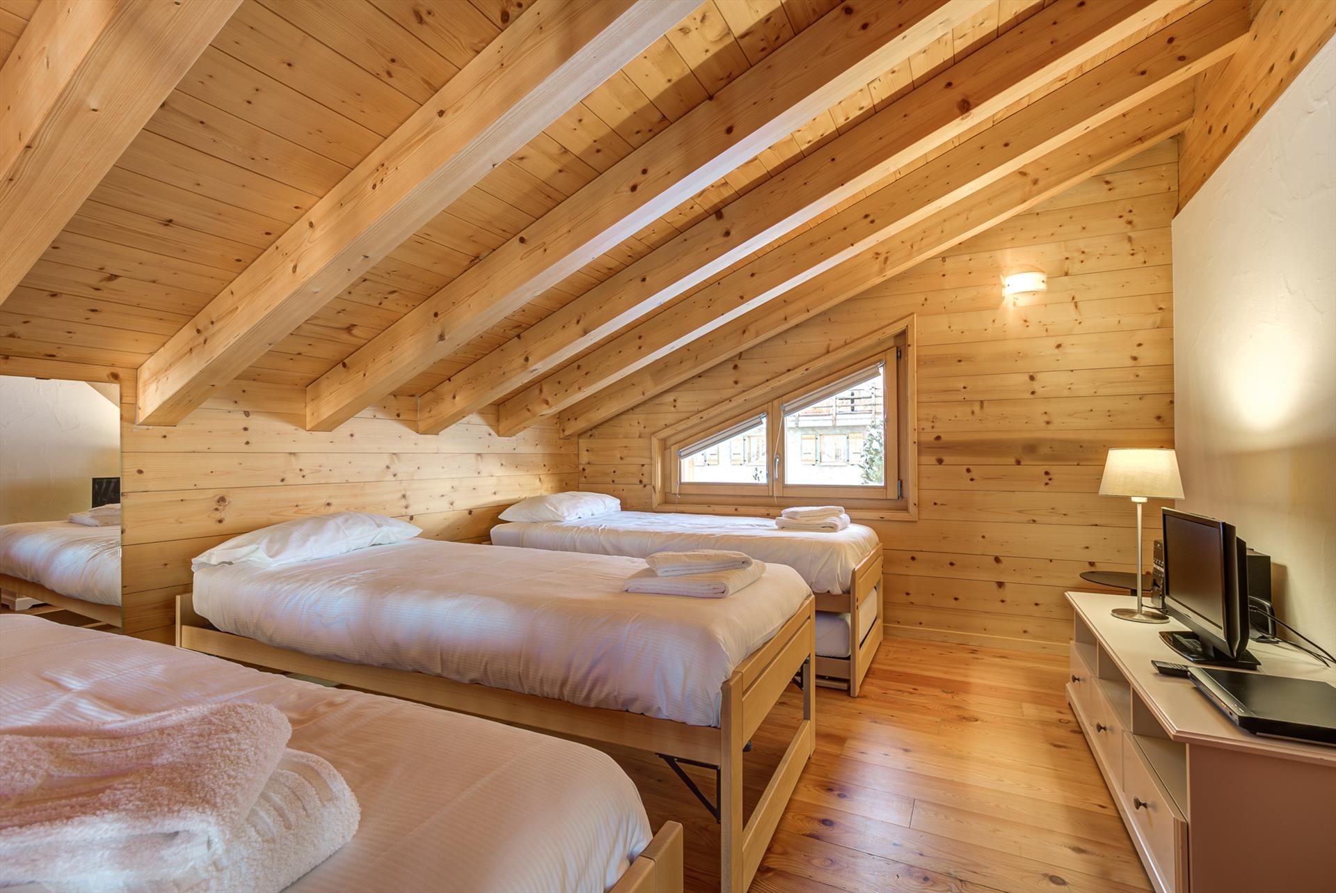 This five-bedroom chalet comfortably sleeps up to 12 people in two double bedrooms, two twin bedrooms, and a fun glass-fronted mezzanine with four single beds. There are three bathrooms, two with showers and one with a bath.