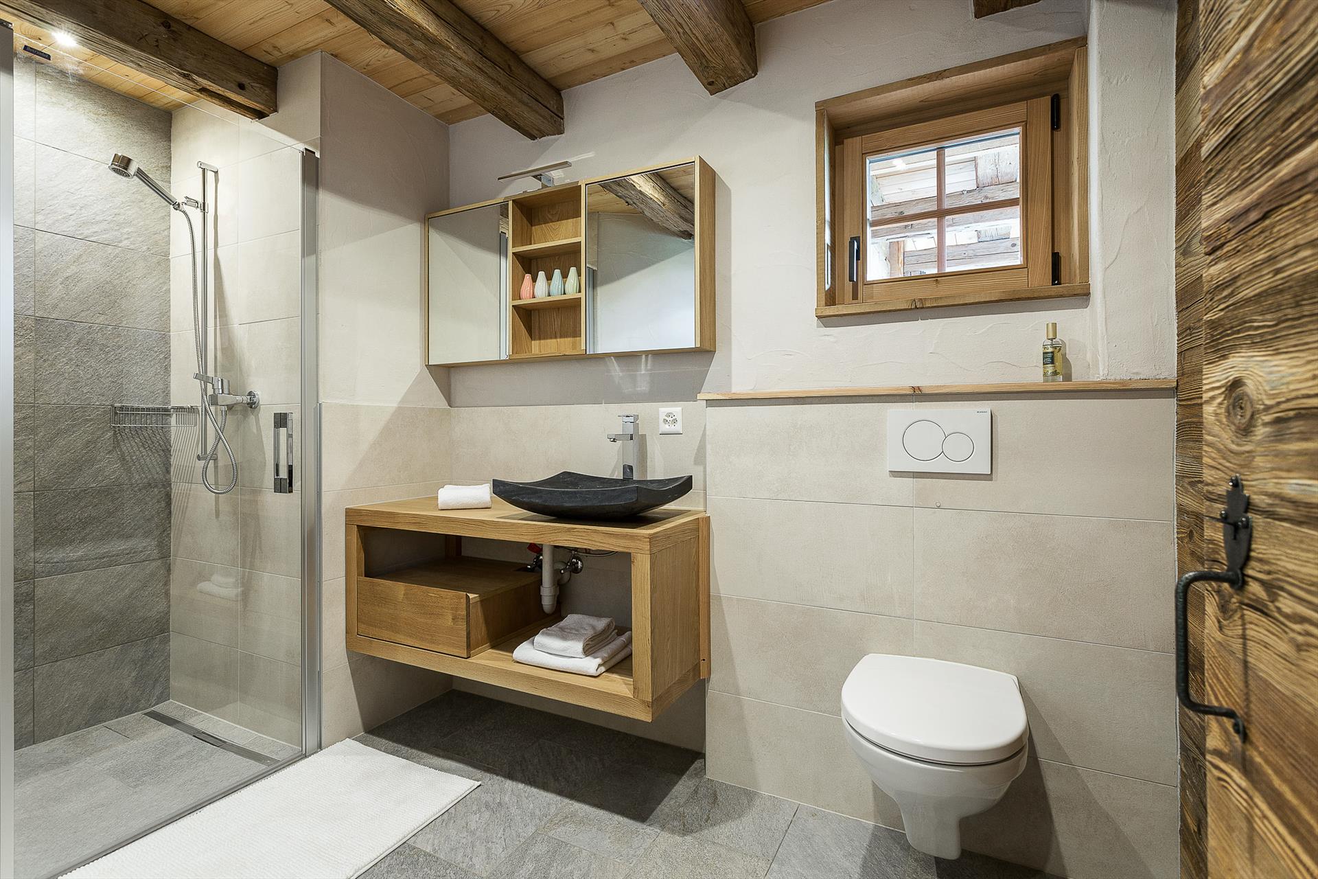 The modern bathroom is fitted with a large walk-in shower, sink and WC. A guest WC is also available.