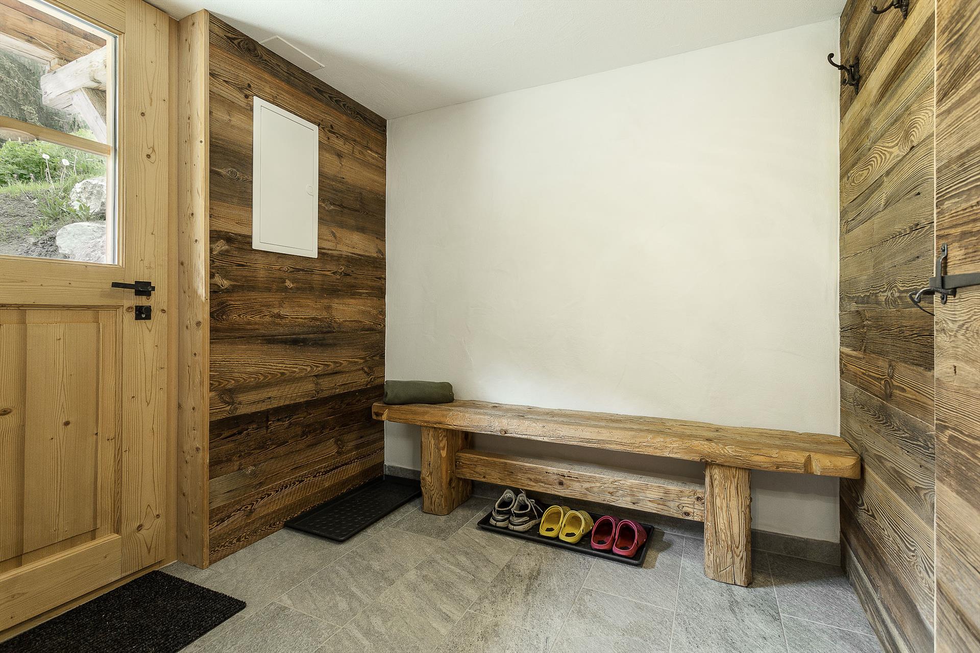 The main floor of the chalet is an open kitchen/living/dining area with old wood styling throughout and separate areas for cooking, eating and relaxing. The brand new kitchen is fully equipped with everything you might need for holiday catering, including a dishwasher, toaster, kettle, Nespresso and electric filter coffee machines, oven and hob. There are fondue and raclette sets for a traditional Swiss evening in front of the log fire. A hairdryer, iron and portable outdoor barbecue are all available for you to use. There is a spacious entrance hall for you to store your outdoor shoes and clothes after a day on the mountain.