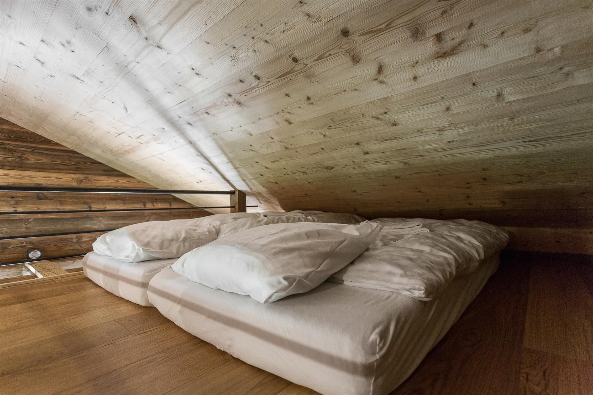- two mattresses (measuring 90cm x 190cm) on an open mezzanine level (attention - access by vertical wooden ladder)