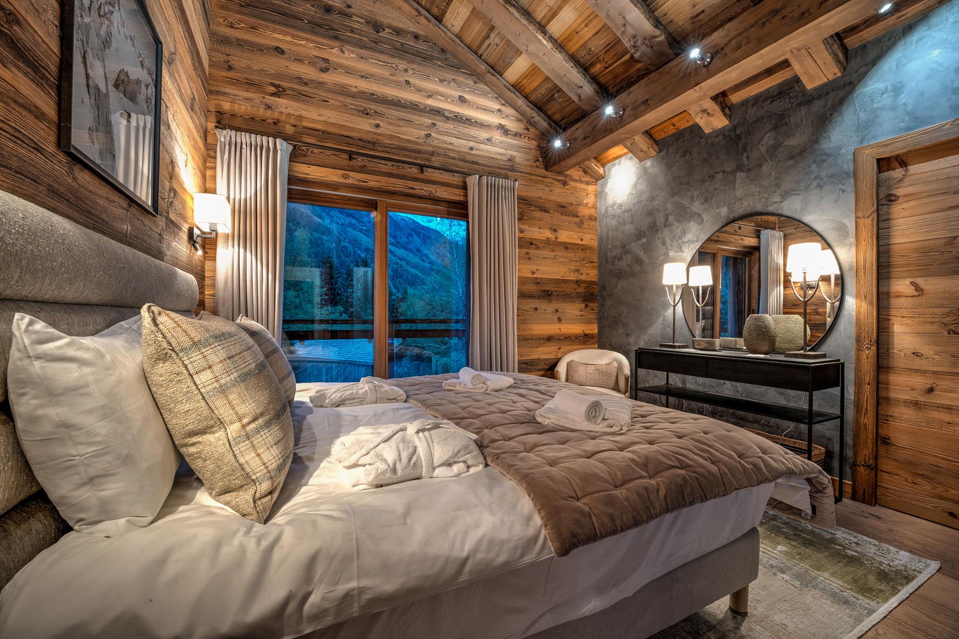 Depuis le lit double de cette chambre, vous pouvez voir le magnifique sommet enneigé du Mont Blanc et l'emblématique crête du Gouter qui y mène. Les portes-fenêtres coulissantes pleine hauteur permettent d'accéder au balcon (partagé avec la chambre 2), d'où l'on peut admirer la vue plus large sur le massif du Mont Blanc jusqu'aux puissantes Drus et au-delà. Il y a une télévision murale à écran plat, ainsi qu'un dressing pleine hauteur sous les combles. La grande salle de bains principale est équipée d'une grande douche à l'italienne et d'une baignoire, d'un double lavabo avec miroir chauffant et d'un porte-serviettes chauffant.