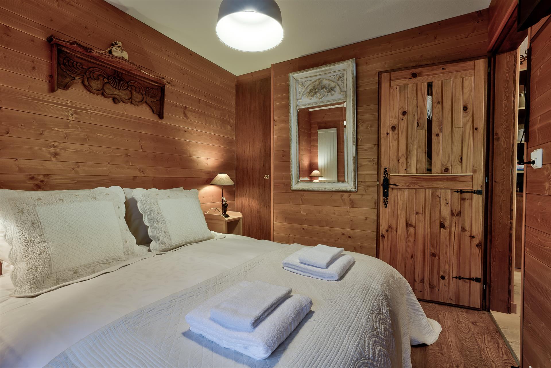 - La deuxième chambre est équipée d'un grand lit, d'une télévision murale à écran plat et d'une armoire, et dispose de portes-fenêtres menant au balcon qui donne sur la montagne en direction des pistes de ski.