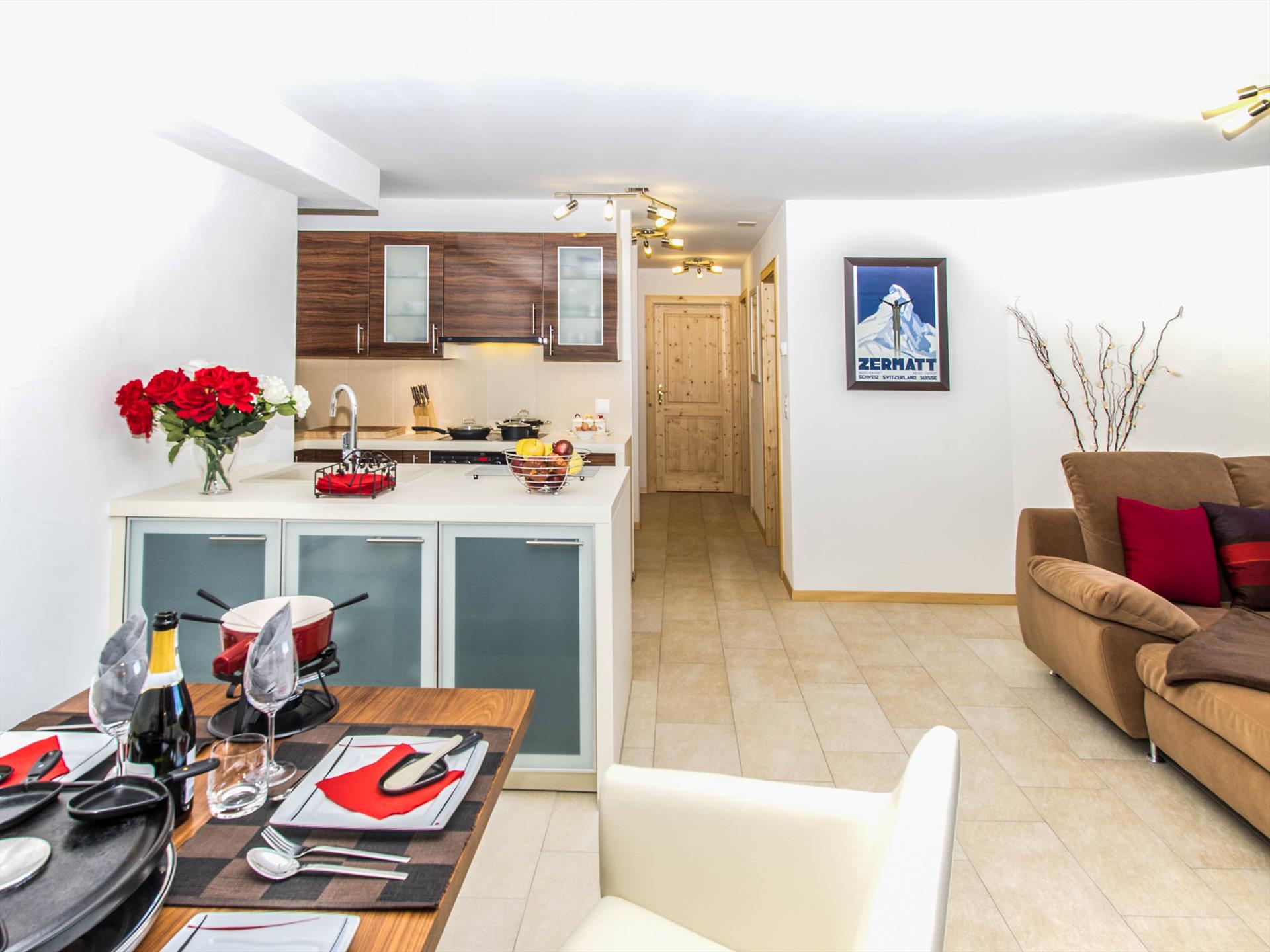 Appartement moderne et intime, skis-aux-pieds, à La Tzoumaz, 4 Vallees, Suisse pour 4 personnes. L'appartement est situé près de restaurants et bars et de supermarchés, à 50 m de la piste de ski et à 500 m des remontées méchaniques.