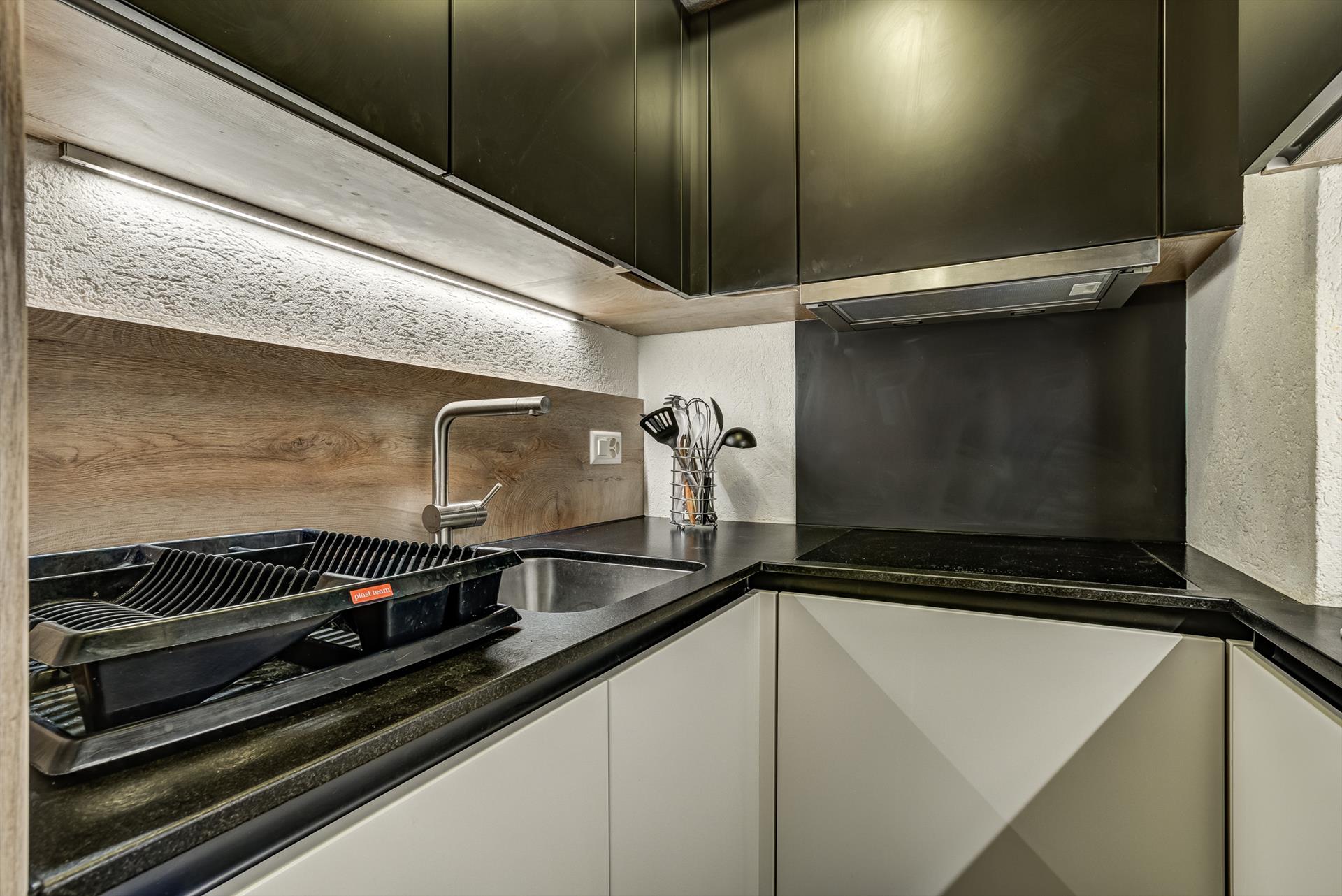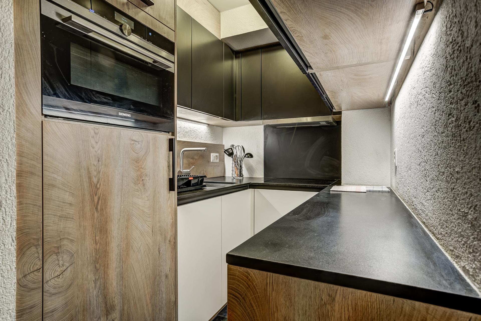 - cuisine américaine avec cuisinière à induction, four électrique, lave-vaisselle, refrigérateur, cafetière électrique, bouilloire et grille-pain