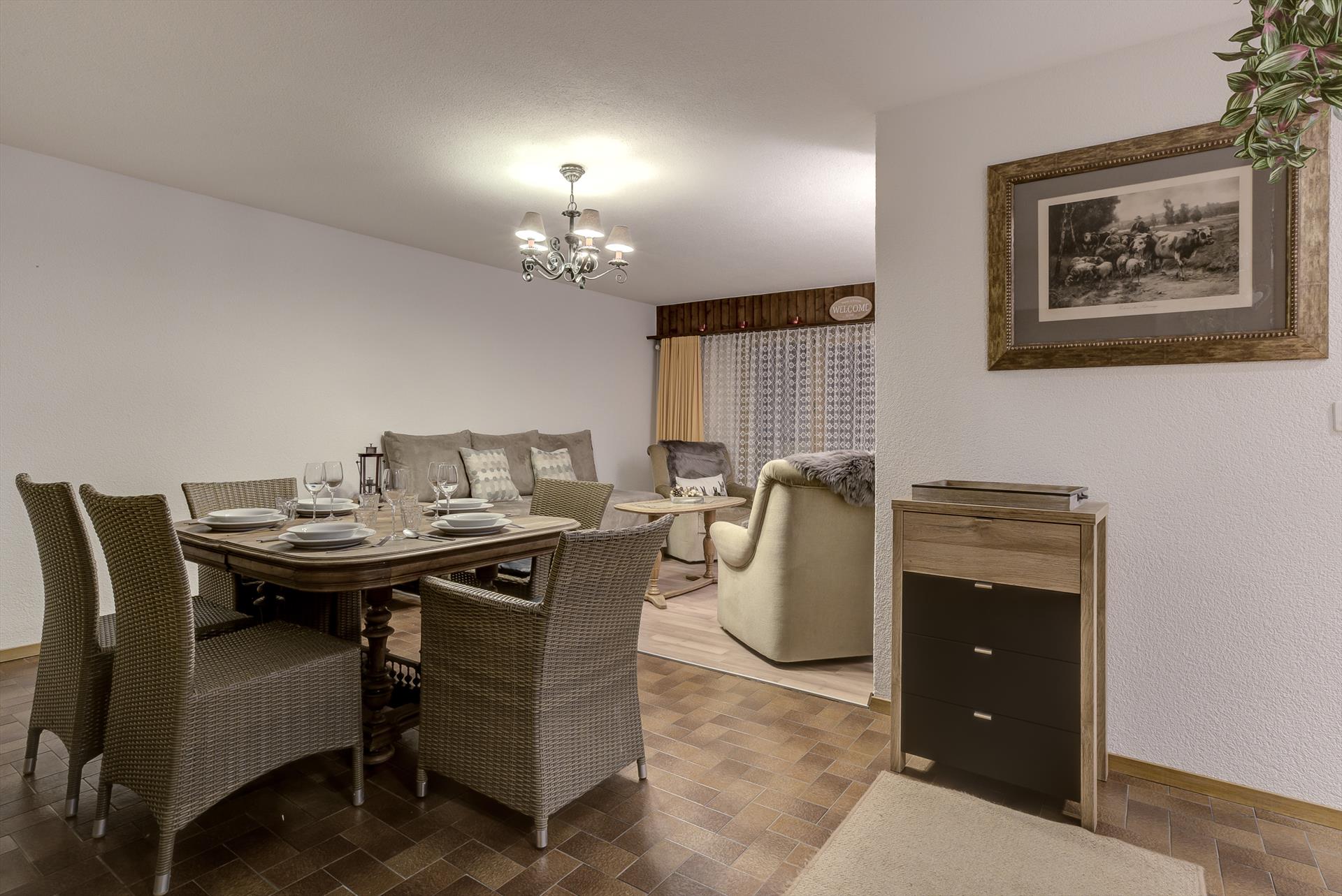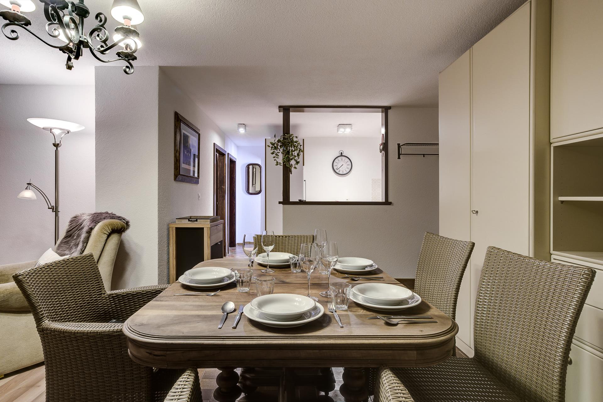 Dans le coin cuisine/salon/salle à manger ouvert, vous pourrez écouter de la musique ou vous distraire avec la télévision. En été, des sentiers pédestres passent tout près de l'appartement si vous voulez explorer le flanc de la montagne. Sinon, il suffit d'une courte promenade autour de la station pour découvrir ses bars et restaurants, son aire de jeux (ou sa patinoire extérieure, selon la saison !), sa piscine et son court de tennis.
