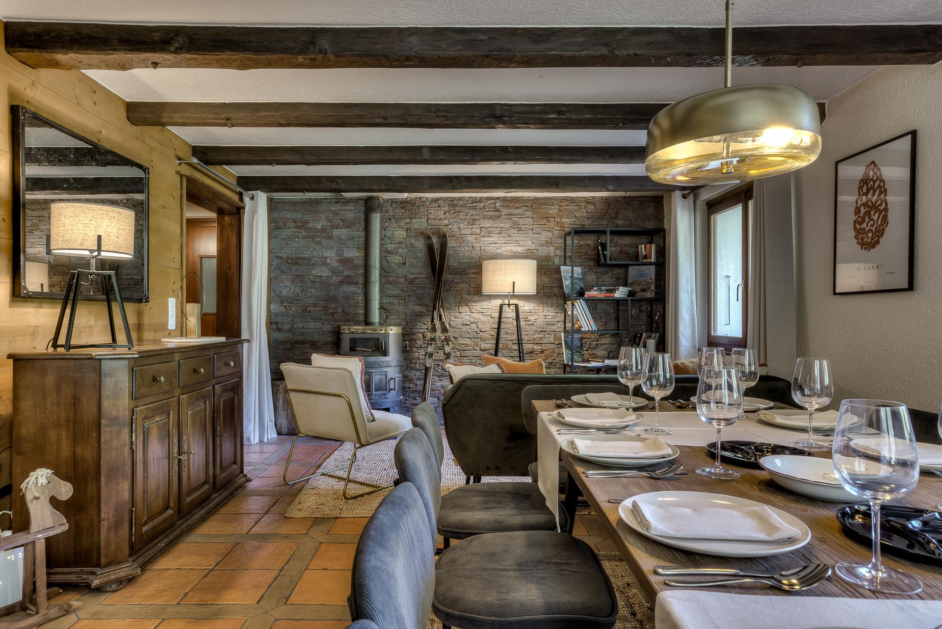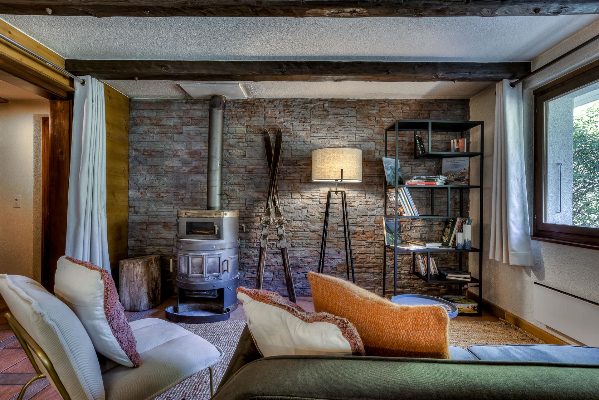 L'étage principal de ce grand chalet est une cuisine ouverte/salon/salle à manger avec cheminée et accès à la terrasse et au jardin. La cuisine est entièrement équipée avec tout ce dont vous pourriez avoir besoin pour une restauration familiale, y compris un lave-vaisselle, un micro-ondes, une bouilloire, une machine à café à filtre électrique, un Nespresso, un four et une plaque à induction. Il y a des sets à fondue et à raclette pour une soirée suisse traditionnelle devant le feu de bois. Sèche-cheveux, fer à repasser et barbecue extérieur portable sont à votre disposition. Vous trouverez une salle de jeux séparée avec un baby-foot et une télévision à écran plat. Le sauna se trouve au rez-de-chaussée. Il y a également une buanderie avec une machine à laver et un sèche-linge séparé.