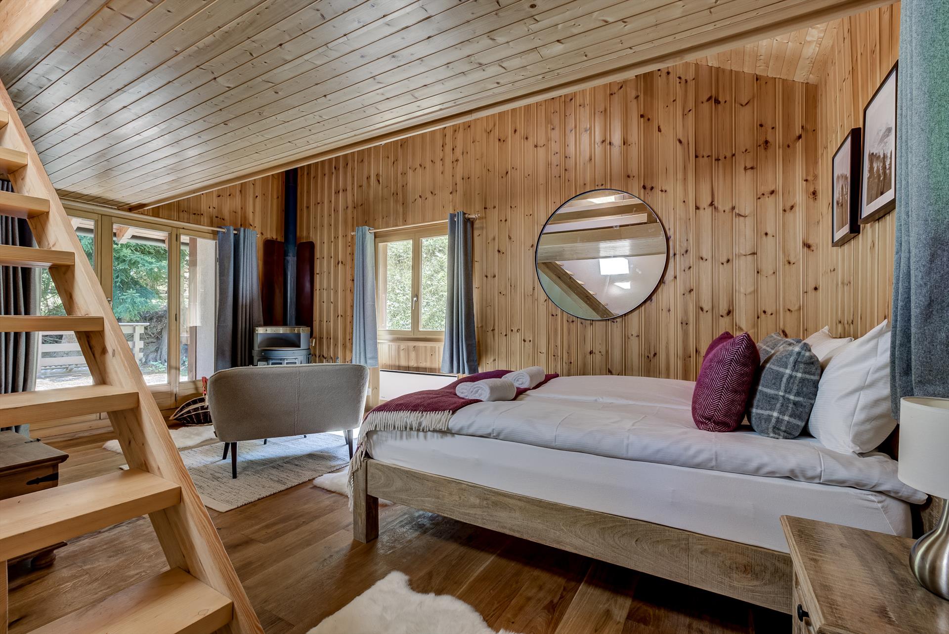 Chambre 1 (niveau supérieur 1) - Lit double (180x200cm), armoire, portes-fenêtres donnant sur la terrasse, vue sur le jardin, poêle à bois, salle de bains attenante (voir ci-dessous), escalier menant au bureau en mezzanine.