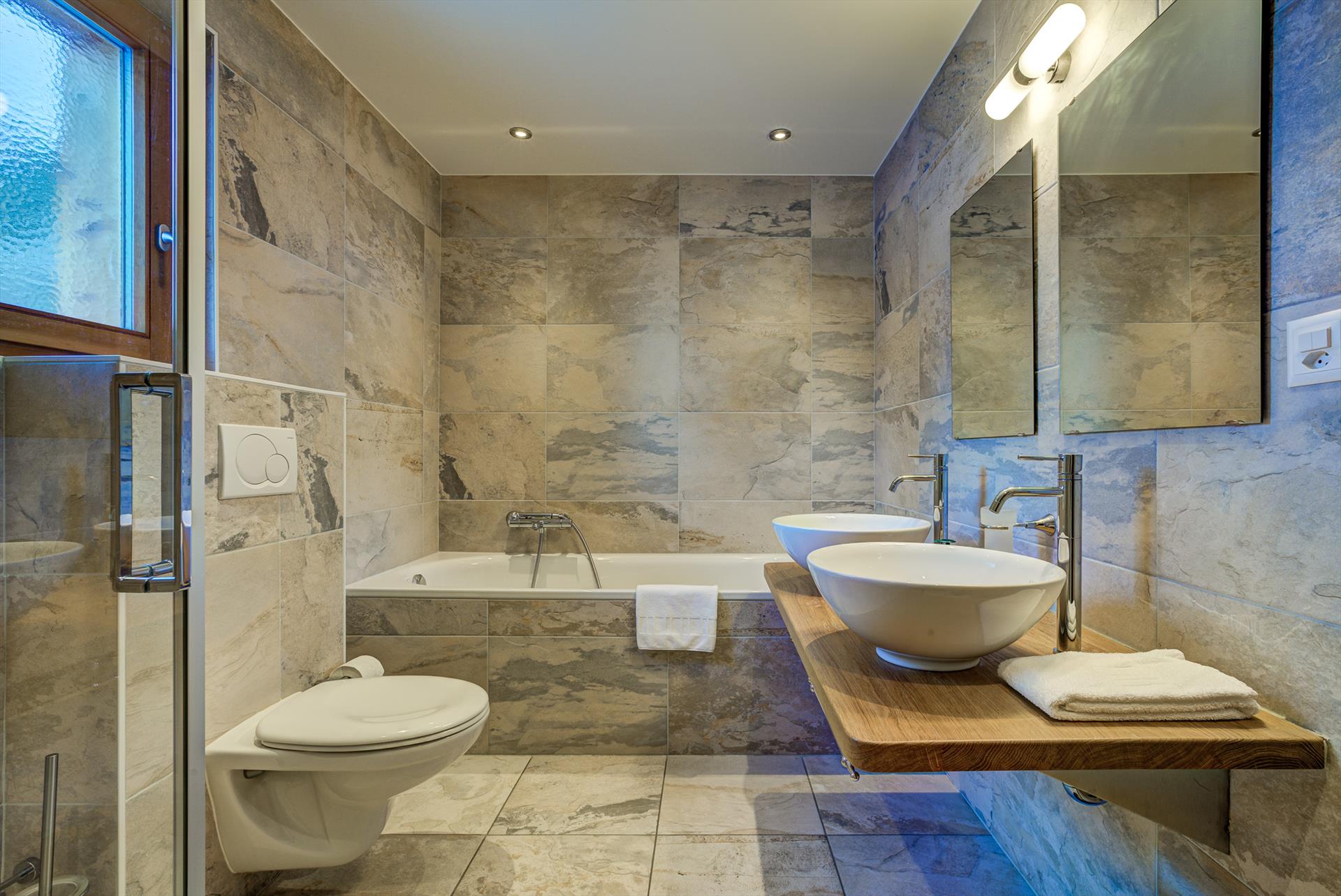 - salle de bain avec double lavabo, baignoire, douche, toilette et sèche-cheveux