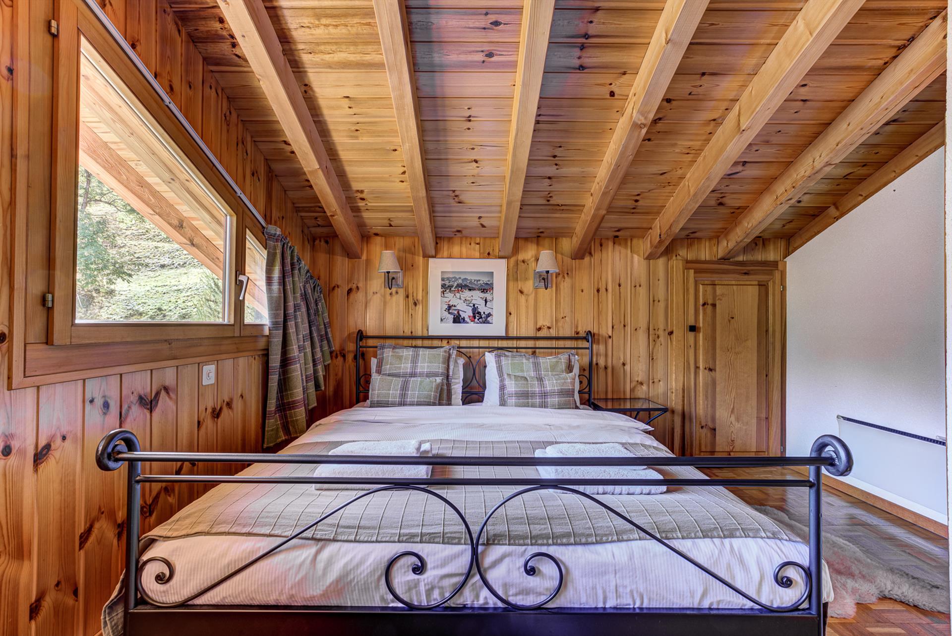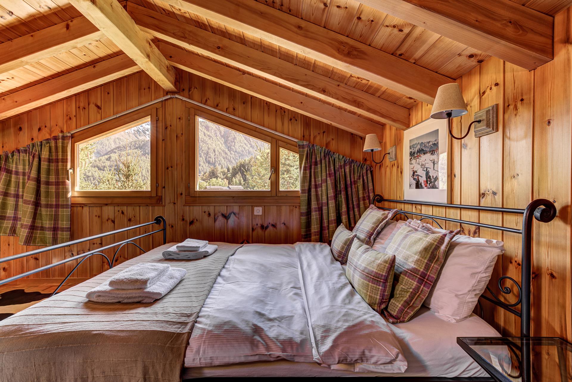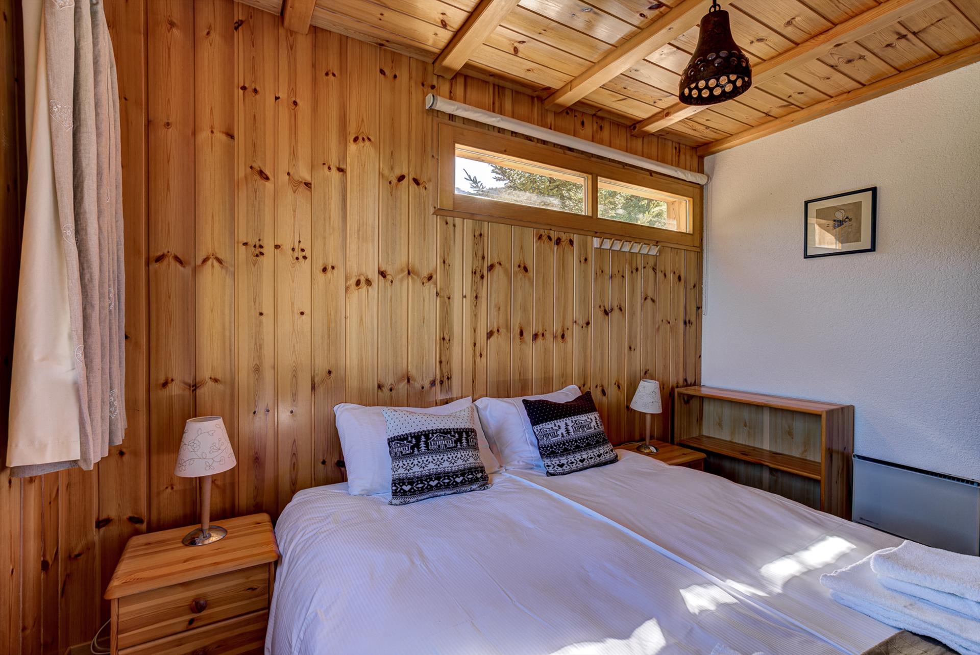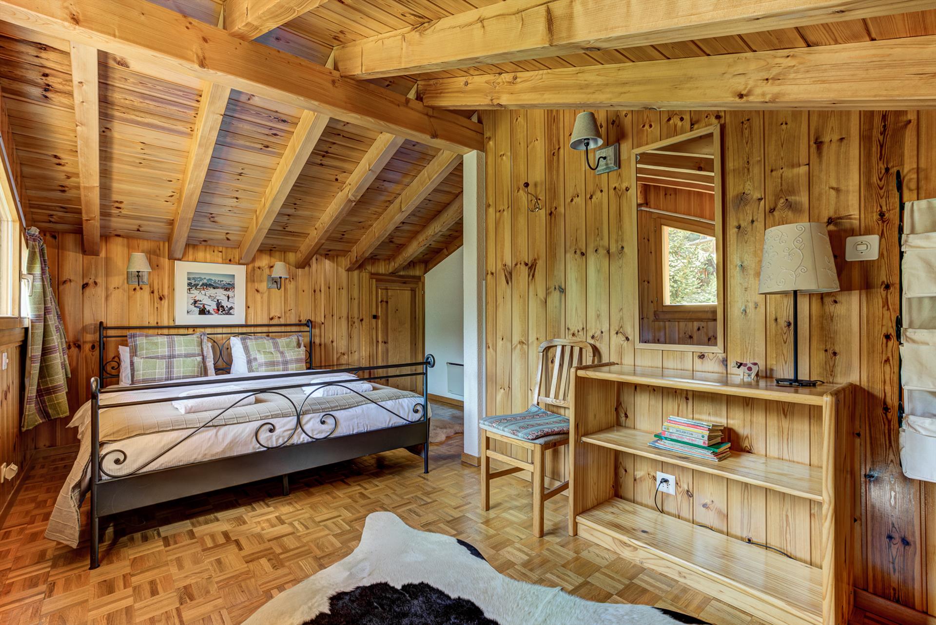 - grande chambre principale (à l'étage) ouverte sur les poutres du toit, avec une vue imprenable sur les sommets des montagnes au loin, un lit double et des armoires de rangement