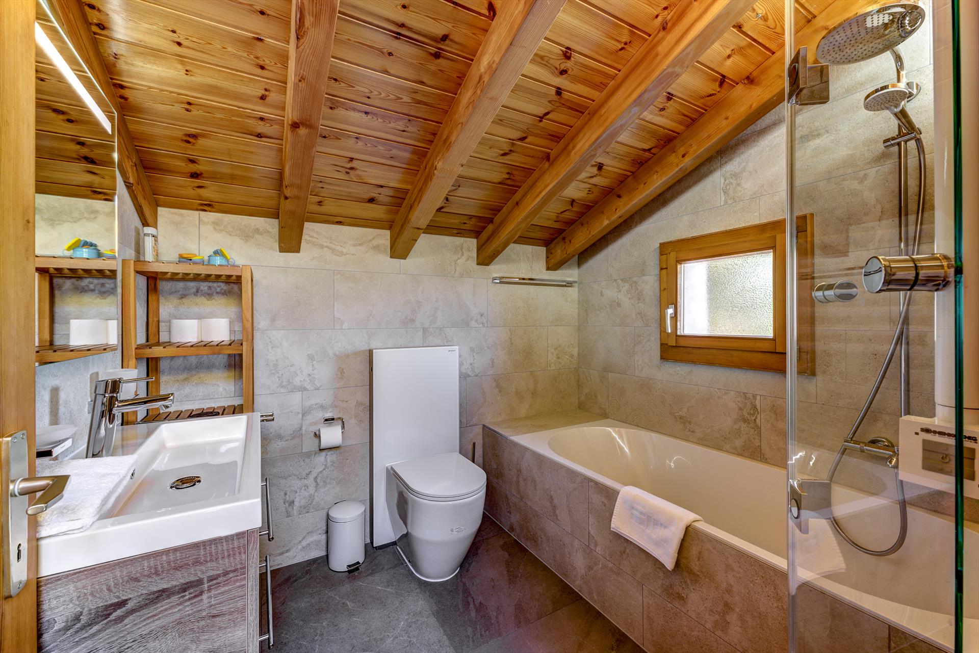 L'espace de vie principal de ce grand chalet est un espace ouvert cuisine/salon/salle à manger, astucieusement divisé en zones distinctes par une cloison centrale. L'espace canapé offre une vue imprenable depuis les fenêtres, une télévision et une cheminée. La cuisine moderne est entièrement équipée de tout ce dont vous pourriez avoir besoin pour la restauration familiale, y compris un lave-vaisselle, un micro-ondes, une machine à café à filtre électrique, une machine à café Nespresso, un four et une plaque à induction. À côté de la cuisine se trouve un espace repas convivial, avec une table extensible et 8 chaises. Les grandes portes-fenêtres vitrées s'ouvrent sur la zone de patio grillagée et son barbecue en briques. Il y a des sets à fondue et à raclette pour une soirée suisse traditionnelle devant le feu de bois. La machine à laver, le fer à repasser, le sèche-cheveux et le barbecue extérieur en briques à charbon de bois sont à votre disposition.