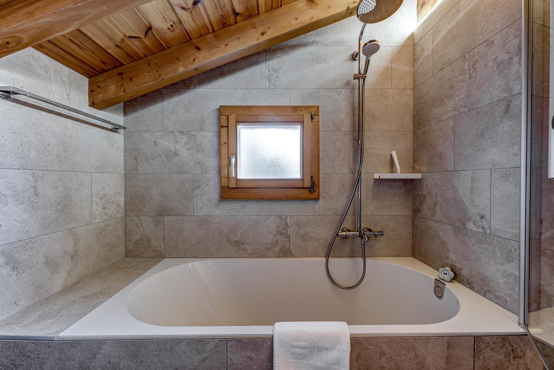 - salle de bains principale (à l'étage) avec baignoire, douche à main, lavabo et WC