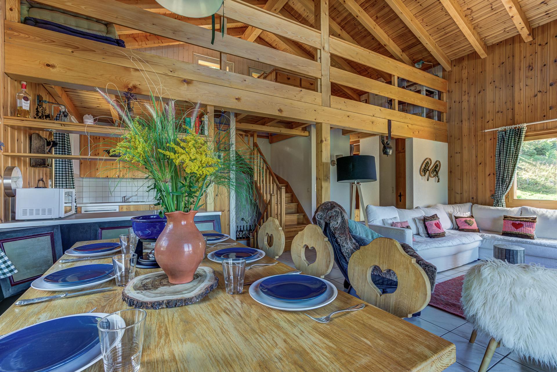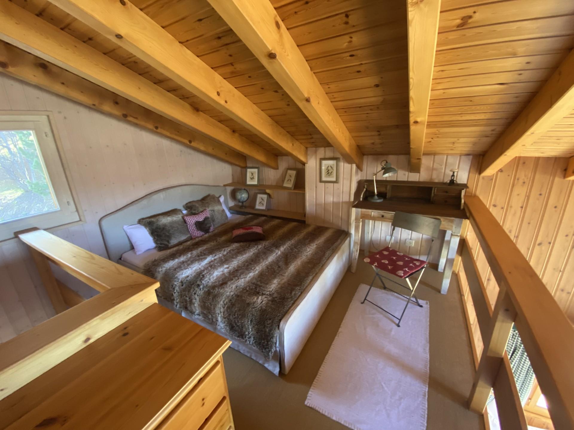 Le chalet peut accueillir confortablement quatre personnes dans deux chambres doubles, et jusqu'à 7 personnes lorsque les trois places sur la mezzanine sont également utilisées.