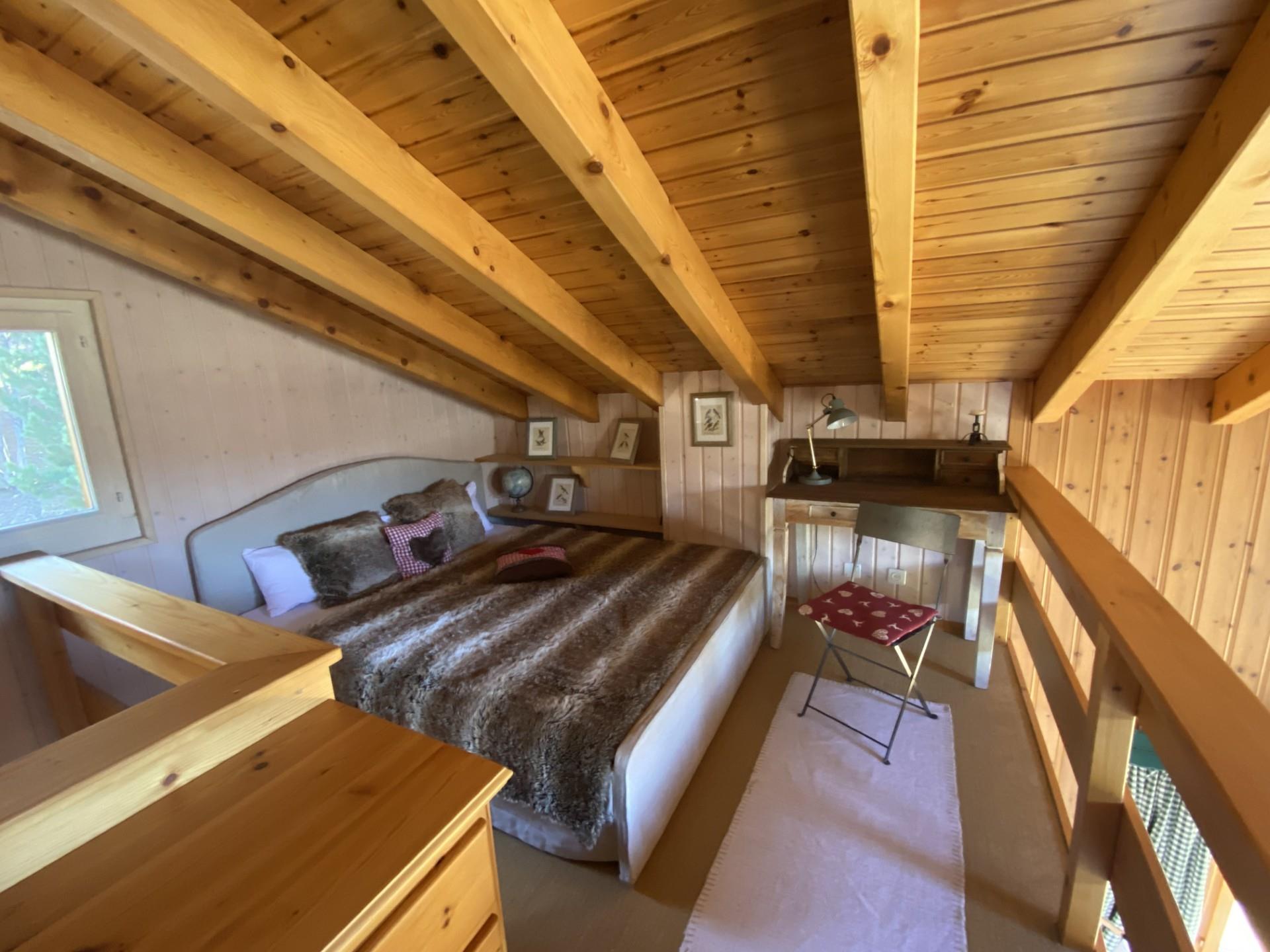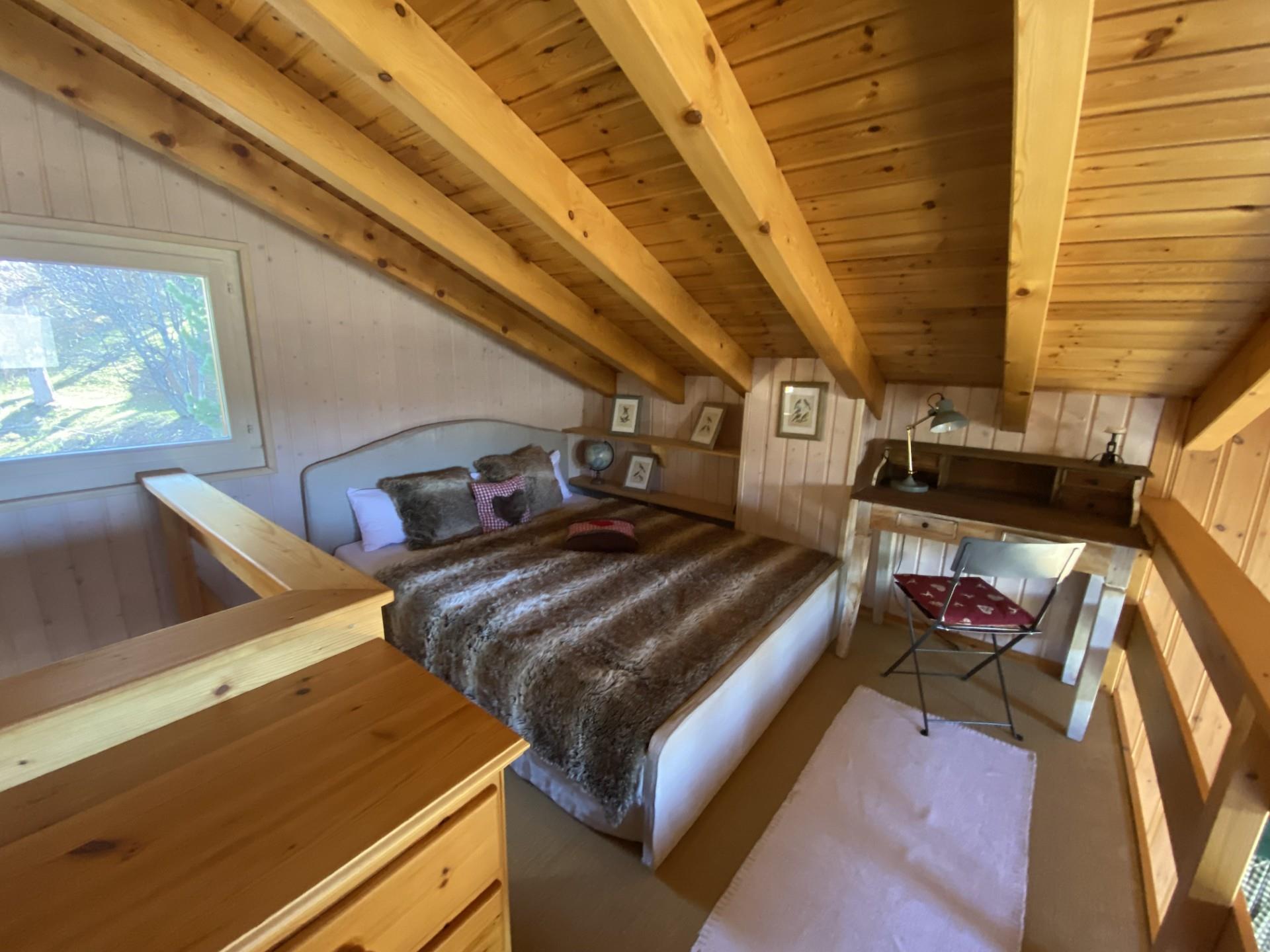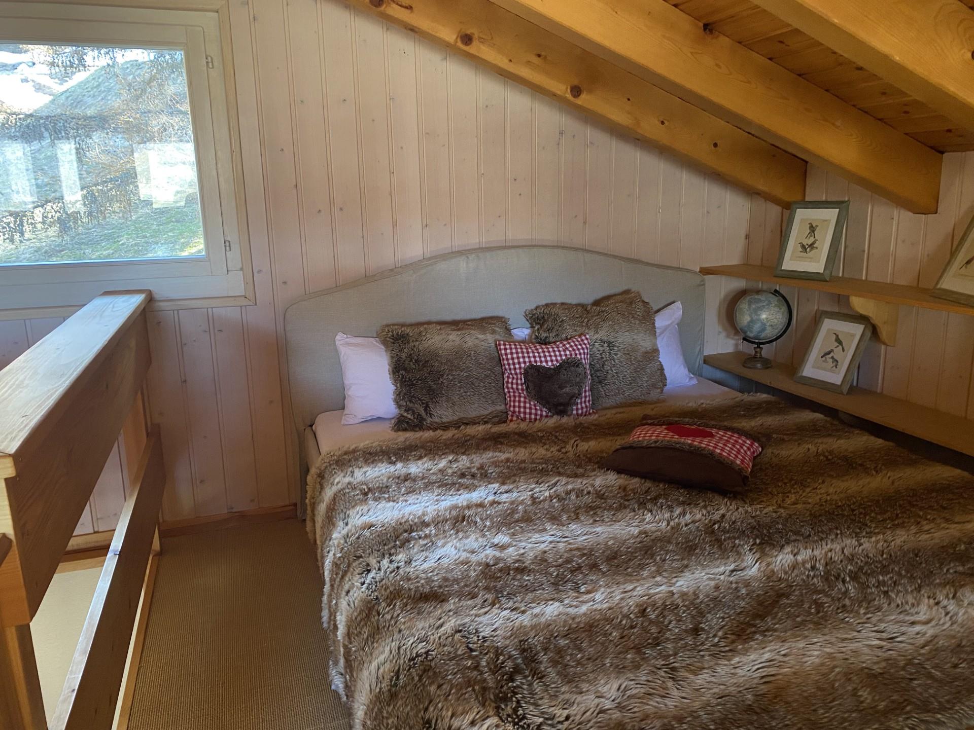 Chacune des deux chambres est équipée d'un lit double (l'une mesure 160cm par 200cm de long et l'autre 180cm par 200cm de long) et de deux armoires encastrées. L'une des chambres a des fenêtres et l'autre des portes vitrées qui exposent les vues fantastiques sur la vallée et permettent à la lumière du soleil d'été de filtrer le matin. Ces portes permettent également d'accéder au niveau du jardin situé devant le chalet.